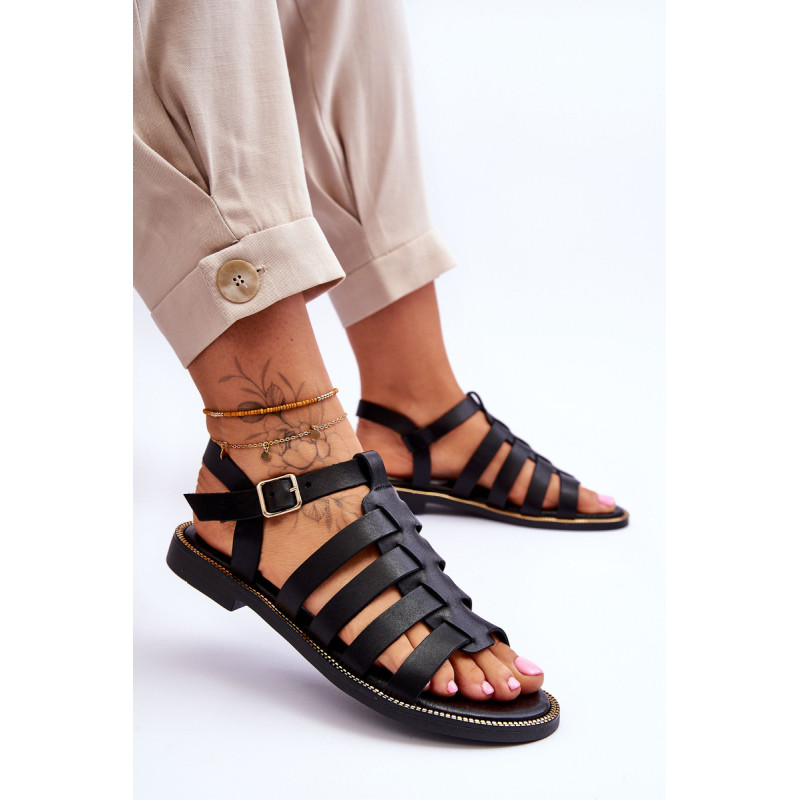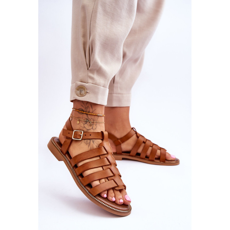 Patogūs moteriški sandalai pagaminti iš natūralios odos. Jie turi dekoracijas ant pado. Šis modelis buvo pastatytas ant plokščio kulno. Sandalai turi atvirą kulną ir pirštus. Minkštas vidpadis užtikrina patogų naudojimą. Sandalai turi klasikinį užsegimą sagtimi. Rinkdamiesi dydį, vadovaukitės dydžių lentele.