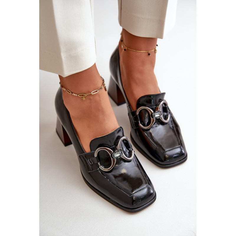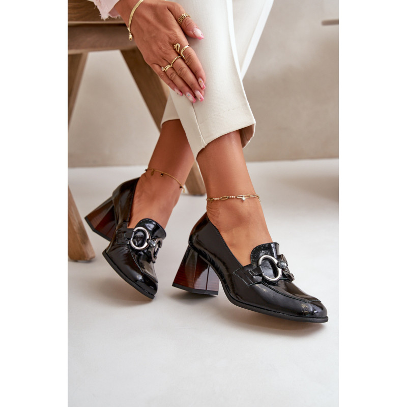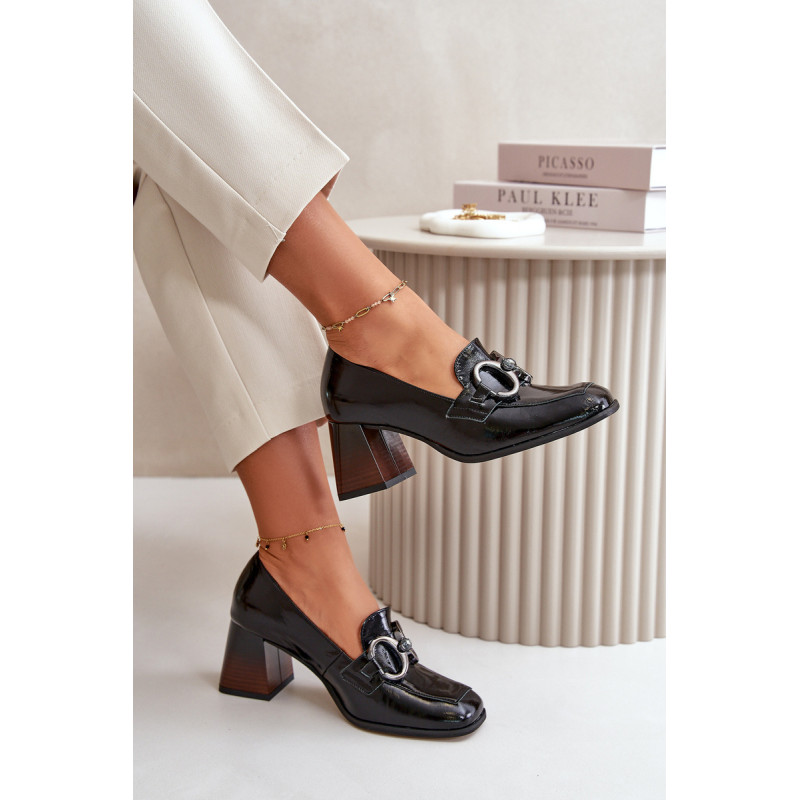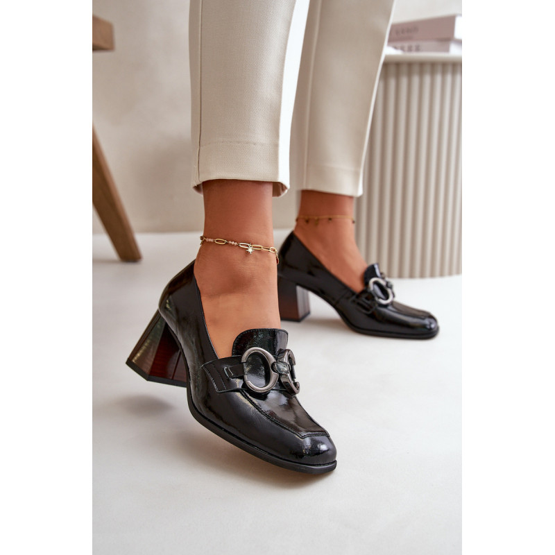 Moteriškos pompos iš natūralios odos. Jie turi blokinį kulną, kuris švelniai siaurėja į viršų. Kvadratiniai kojų pirštai suteikia visai išvaizdai šiuolaikišką išvaizdą. Priekyje yra petnešėlė su puošmena. Šie siurbliai puikiai tiks tiek iškilmingoms progoms, tiek įprastesnėms išvykoms, derindami komfortą ir eleganciją. Rinkdamiesi dydį, žiūrėkite dydžių lentelę.