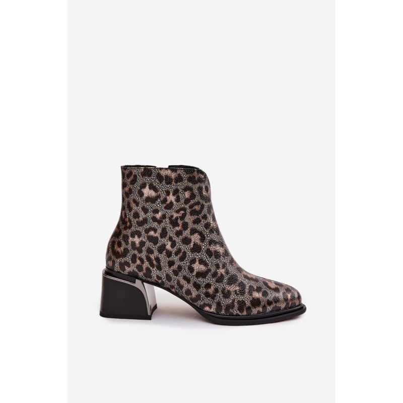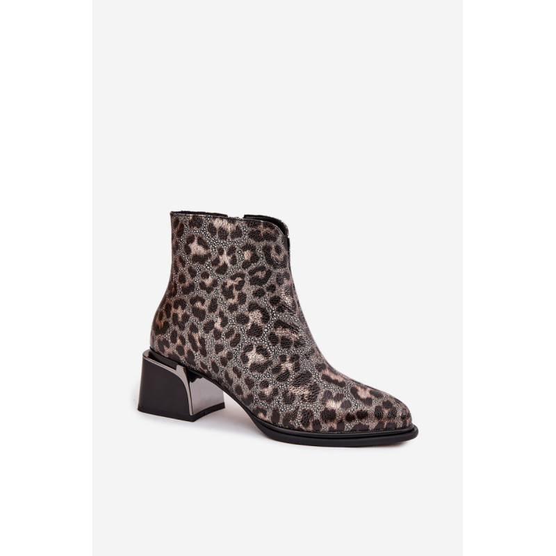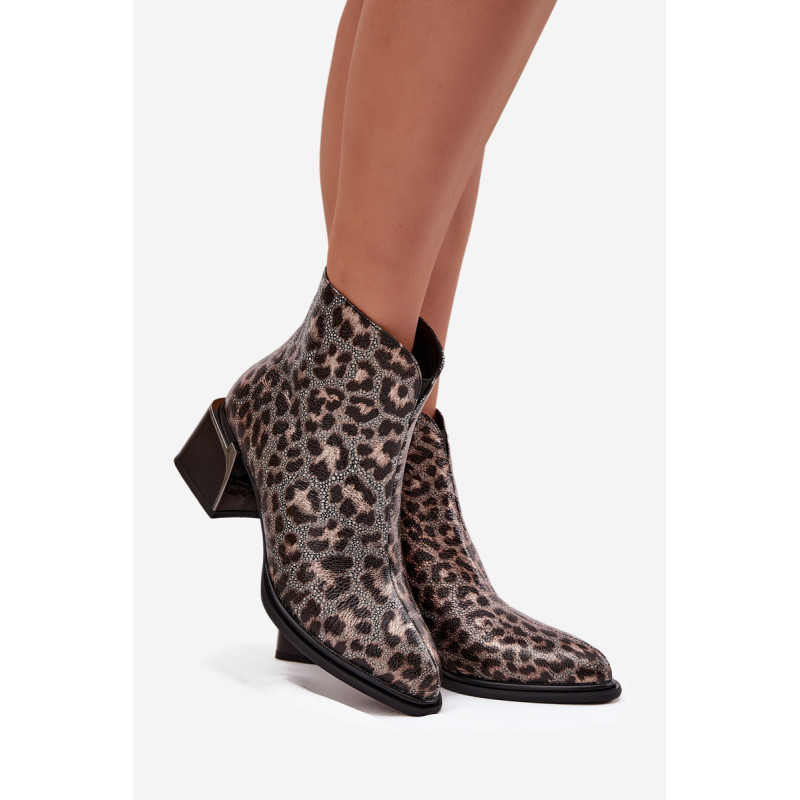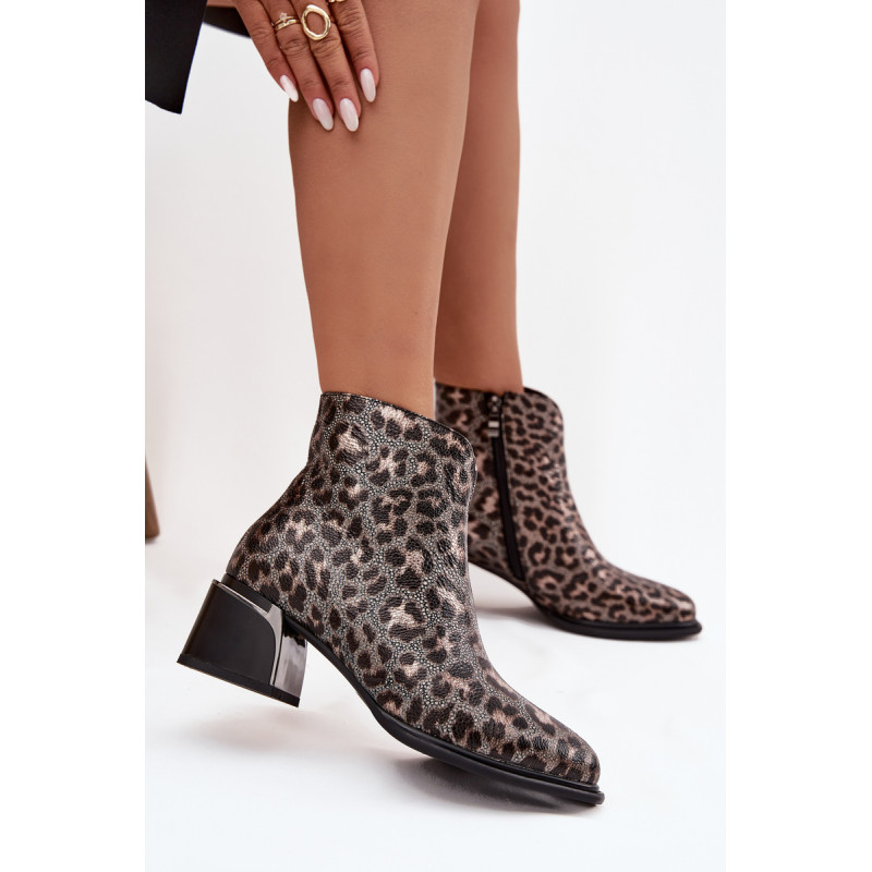 Stilingi ir eleganti moteriški aulinukai, pagaminti iš natūralios odos, siūlo derinį, kuris sujungia madingą išvaizdą su patogumu. Modelis išsiskiria įspūdingu leopardo rašto raštu, kuris suteikia išraiškingą charakterį ir pabrėžia moterišką stilių. Pastatyti ant stabilios kubo formos kulno, kuris užtikrina komfortą, ir su patogiu užtrauktuku, palengvinančiu užsidėjimą ir nuėmimą. Mandorlo formos priekiniai galiukai suteikia subtilios elegancijos, o dekoratyviniai siuviniai palei kulkšnį vizualiai prailgina koją ir pabrėžia liekną batų liniją. Izoliuotas vidus garantuoja šilumą šaltomis dienomis, todėl šie aulinukai yra puikus pasirinkimas rudenį ir žiemą. Šis modelis puikiai papildys tiek kasdienius, tiek ir elegantiškus įvaizdžius. Renkantis dydį, vadovaukitės dydžių lentele.