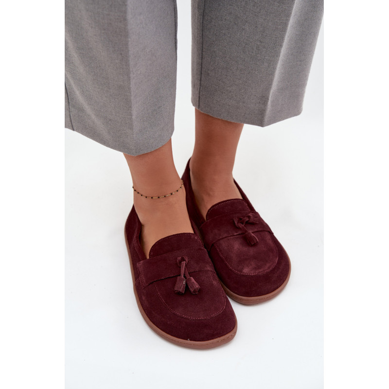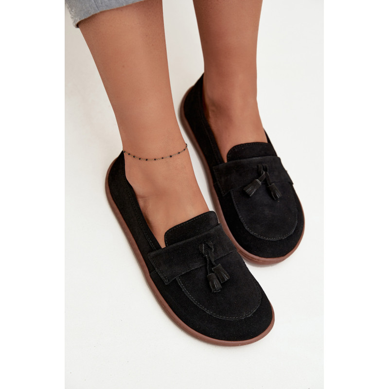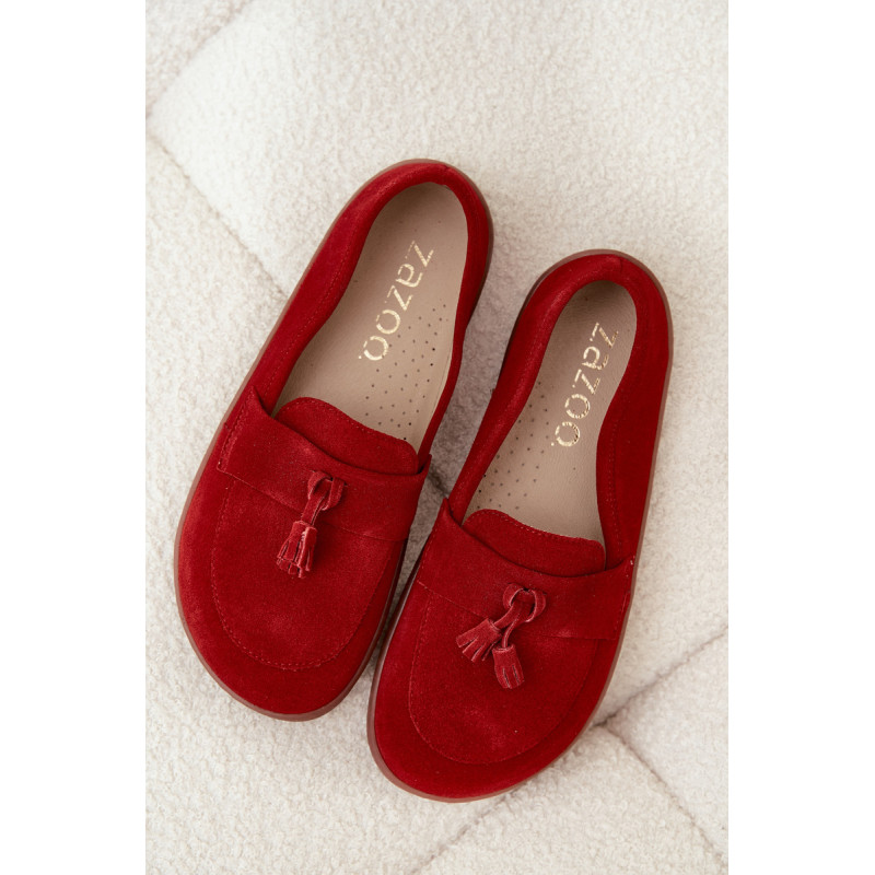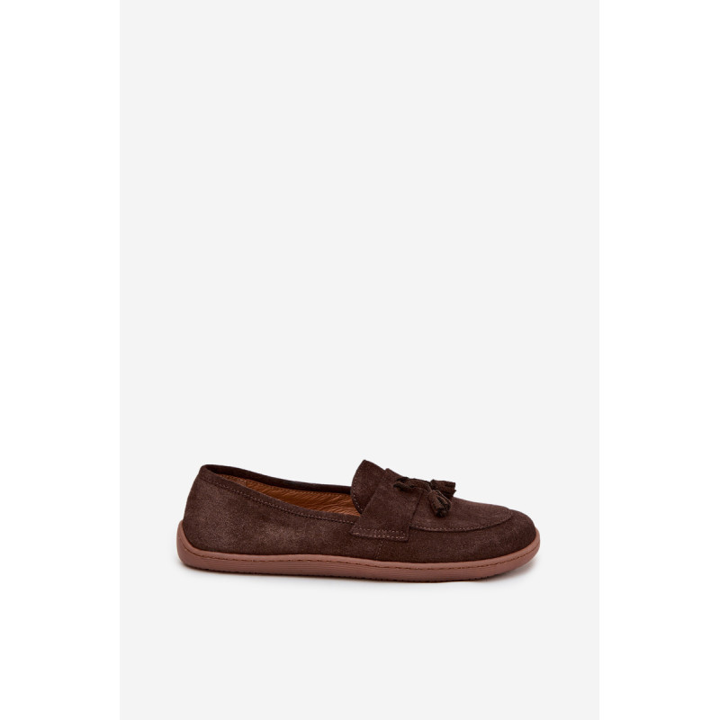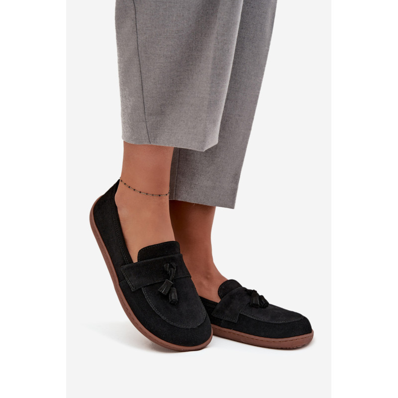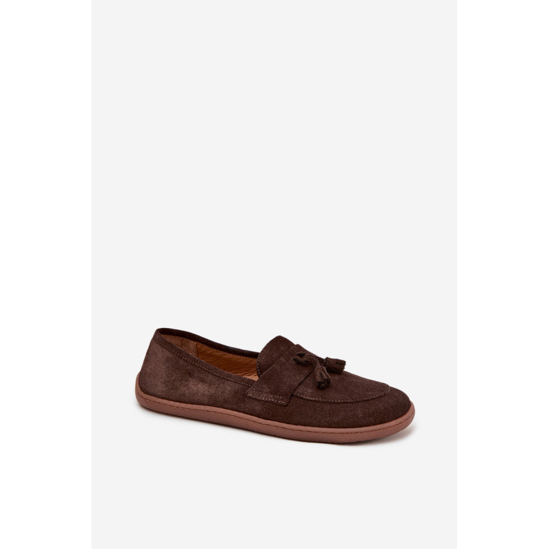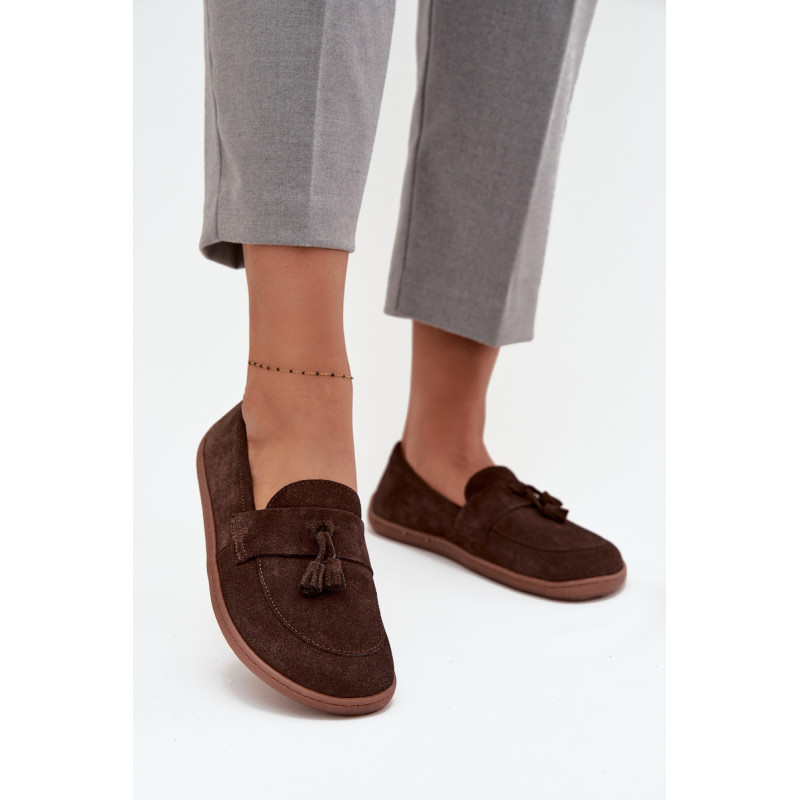 Moteriški barefoot stiliaus mokasinai yra pasiūlymas tiems, kurie vertina natūralų komfortą ir laisvę judėti. Pagaminti iš minkšto, natūralaus zomšos odos, jie puikiai prisitaiko prie pėdos formos, suteikdami malonią lengvumo ir patogumo jausmą dėvint. Priekyje batai papuošti juosta su dviem kutais, kurie suteikia subtilaus žavesio ir stiliaus charakterio. Tai ideali avalynė kasdieniam naudojimui – tinka tiek laisviems, casual stiliams, tiek iškilmingesnėms aprangoms. Renkantis dydį, prašome vadovautis dydžių lentele. Renkantis dydį, vadovaukitės dydžių lentele.