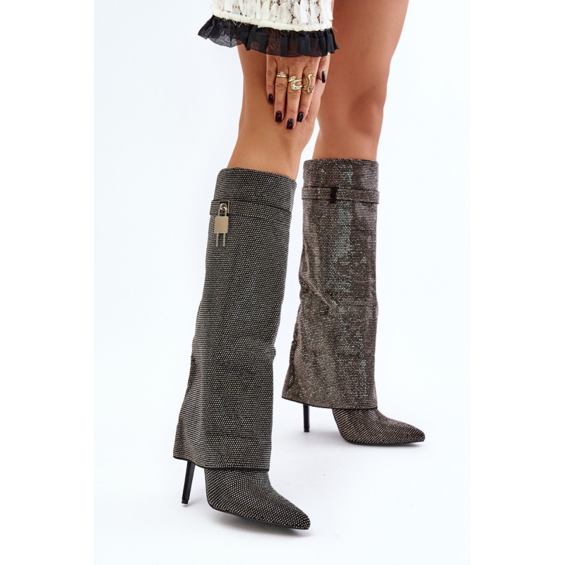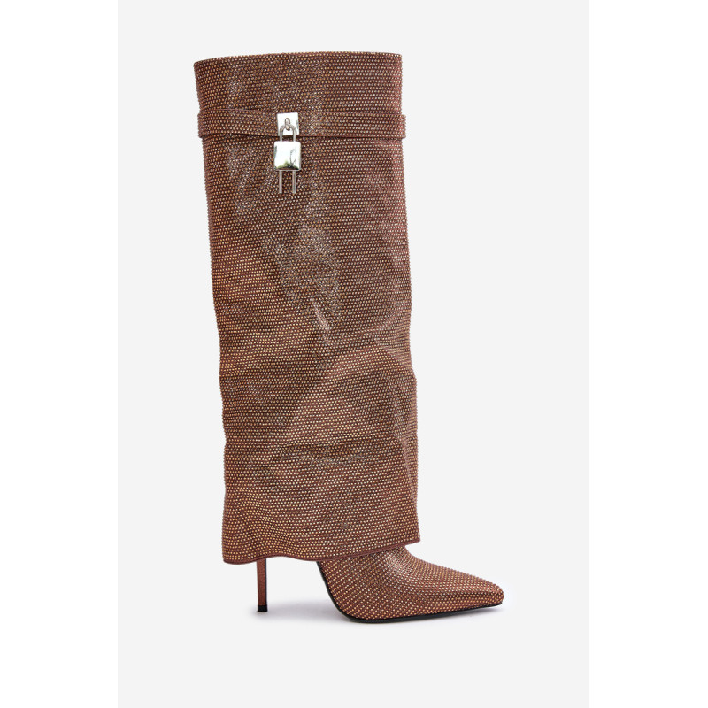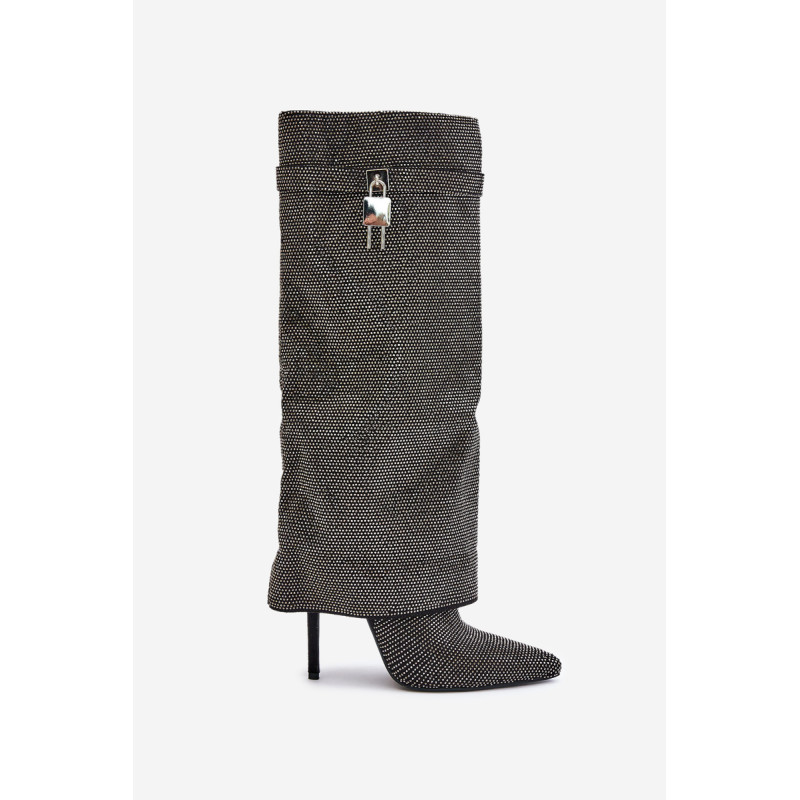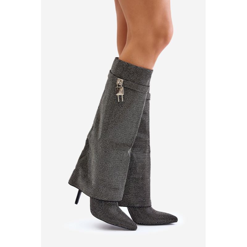 Išskirtiniai moteriški auliniai batai, norinčioms išsiskirti! Pagaminti iš medžiagos, turi apvyniotą šauną, papuoštą rhinestones, primenančiais cirkonį. Įrengti ant smailaus kulno. Vidus šiltas su maloniu liesti batų pamušalu. Kulnas yra sustiprintas, užtikrinantis tinkamą pėdos stabilizavimą. Šis modelis tikrai pridės blizgesio jūsų stiliui! Renkantis dydį, vadovaukitės dydžių lentele.