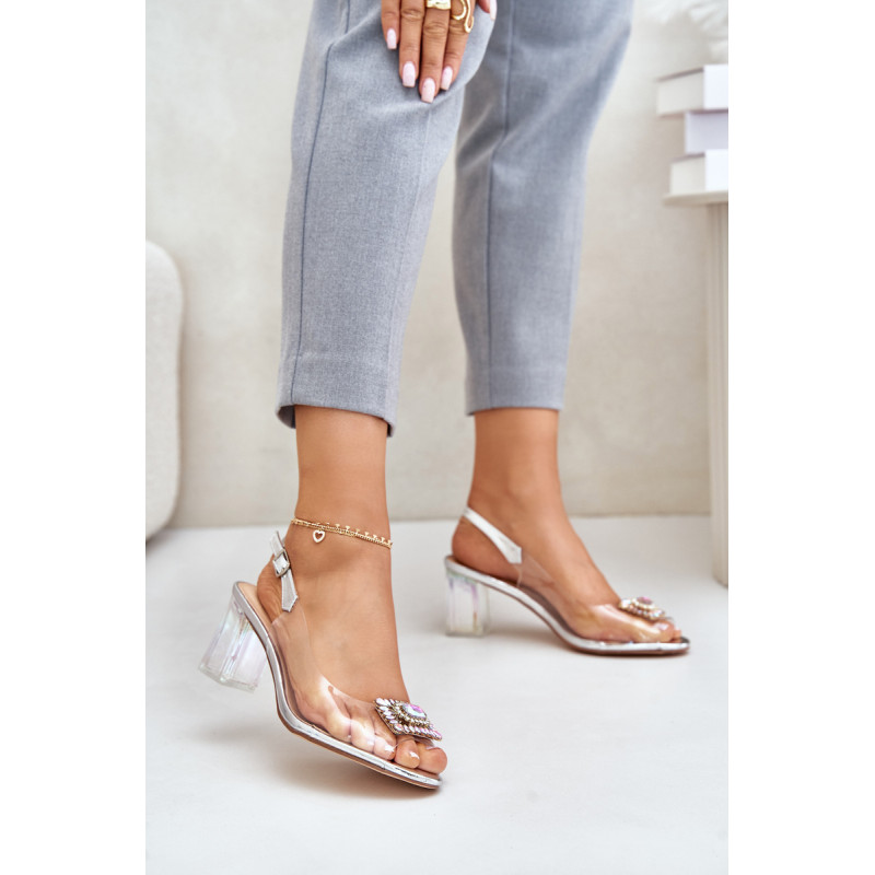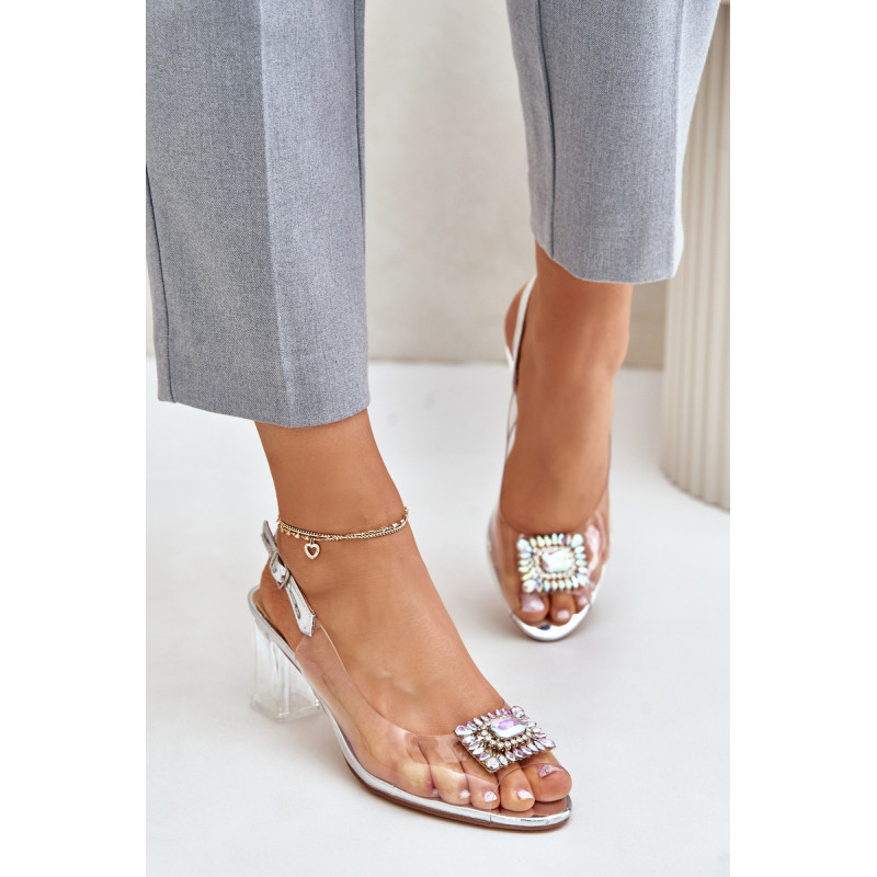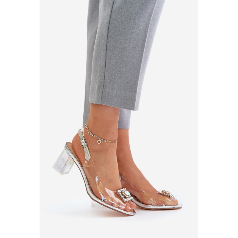 Moteriški sandalai permatomu viršumi. Pastatykite ant blokinio kulno. Priekyje yra sagė, kuri suteikia elegancijos. Minkštas vidpadis pagamintas iš natūralios odos. Puikiai tinka įvairioms progoms. Rinkdamiesi dydį, žiūrėkite dydžių lentelę.