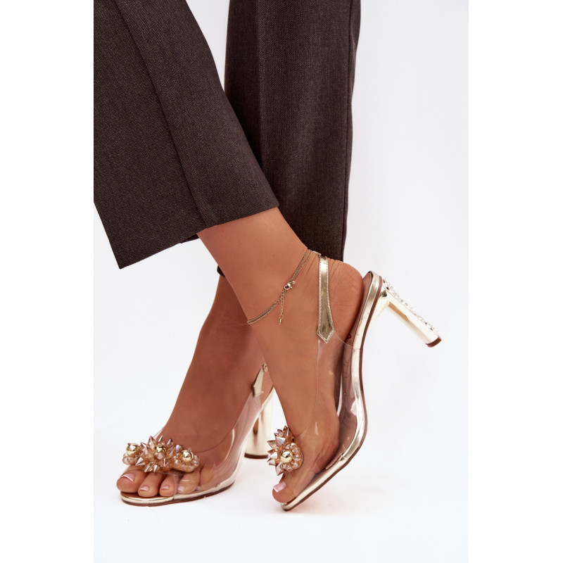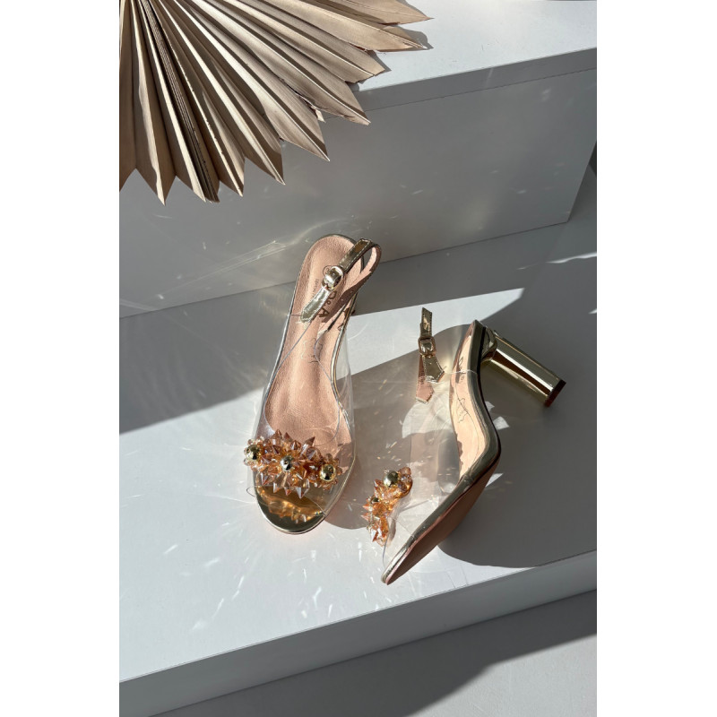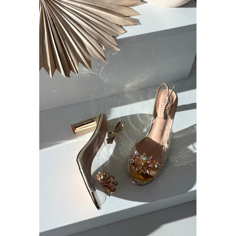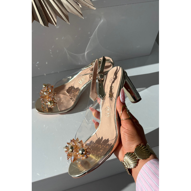 Eleganti permatomi sandalai su kvadratine kulne yra stilingas pasirinkimas ypatingoms progoms. Stabilus kulnas, papuoštas žvilgančiais kristalais, suteikia visumui prabangią, juvelyrinę išvaizdą ir tuo pačiu užtikrina komfortą bei pasitikėjimą žingsnyje. Permatoma forma suteikia lengvumo ir šiuolaikiško įvaizdžio, gražiai išryškindama koją. Šie sandalai puikiai tinka kaip papildymas vakarinėms suknelėms, elegantiškoms drabužiams ir šventiniams renginiams, kur svarbus įspūdingas detalės ir moteriškas stilius. Renkantis dydį, prašome vadovautis žemiau esančia dydžių lentele. Renkantis dydį, vadovaukitės dydžių lentele.