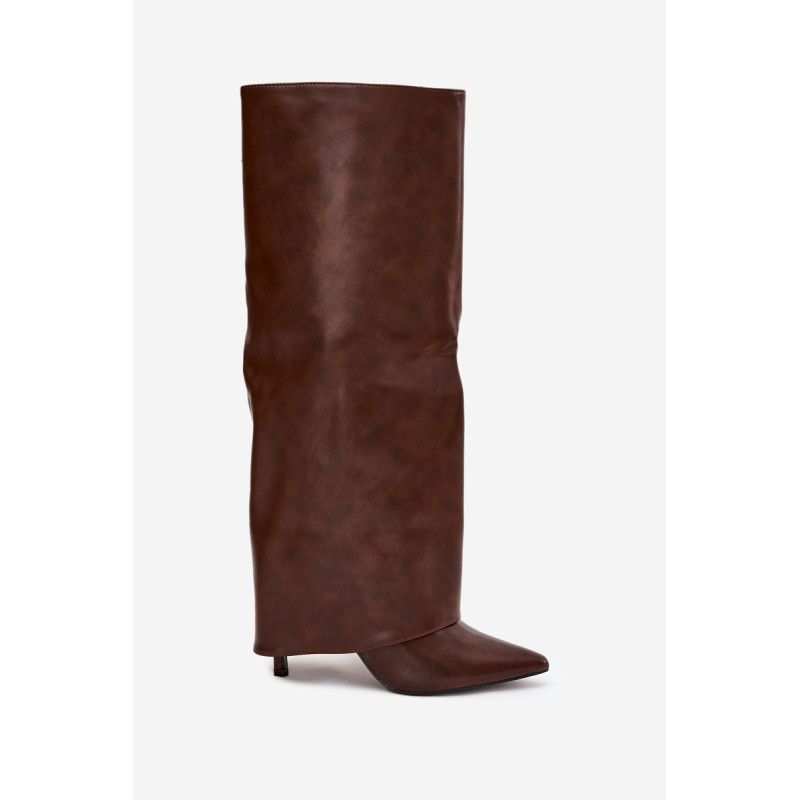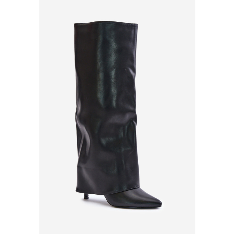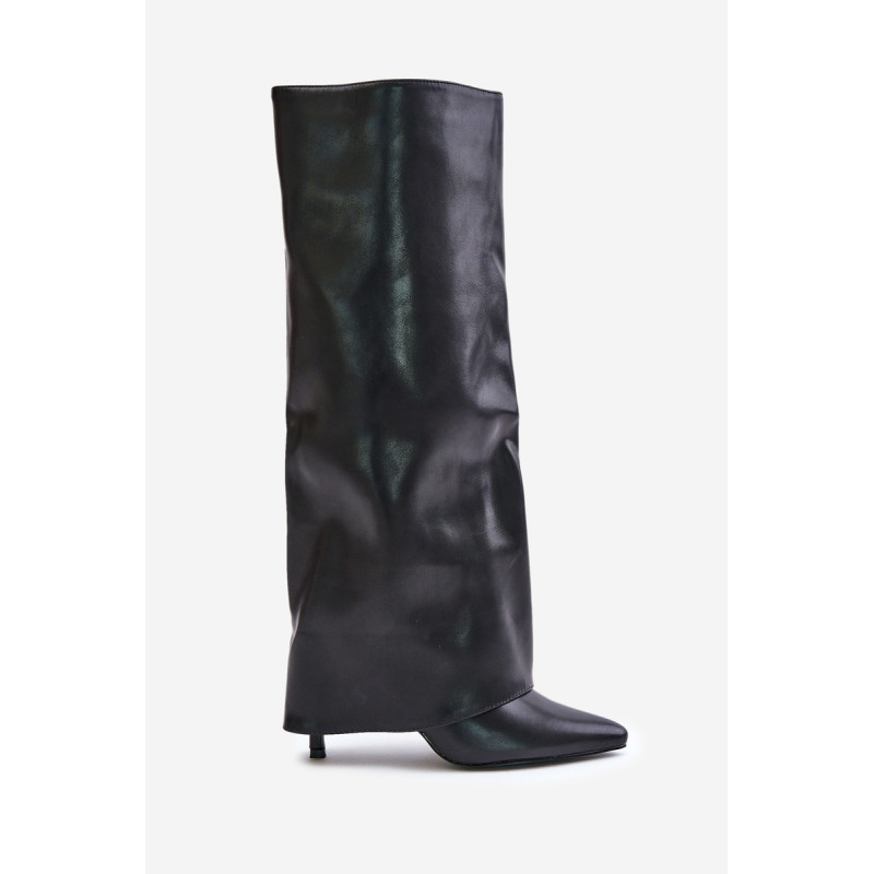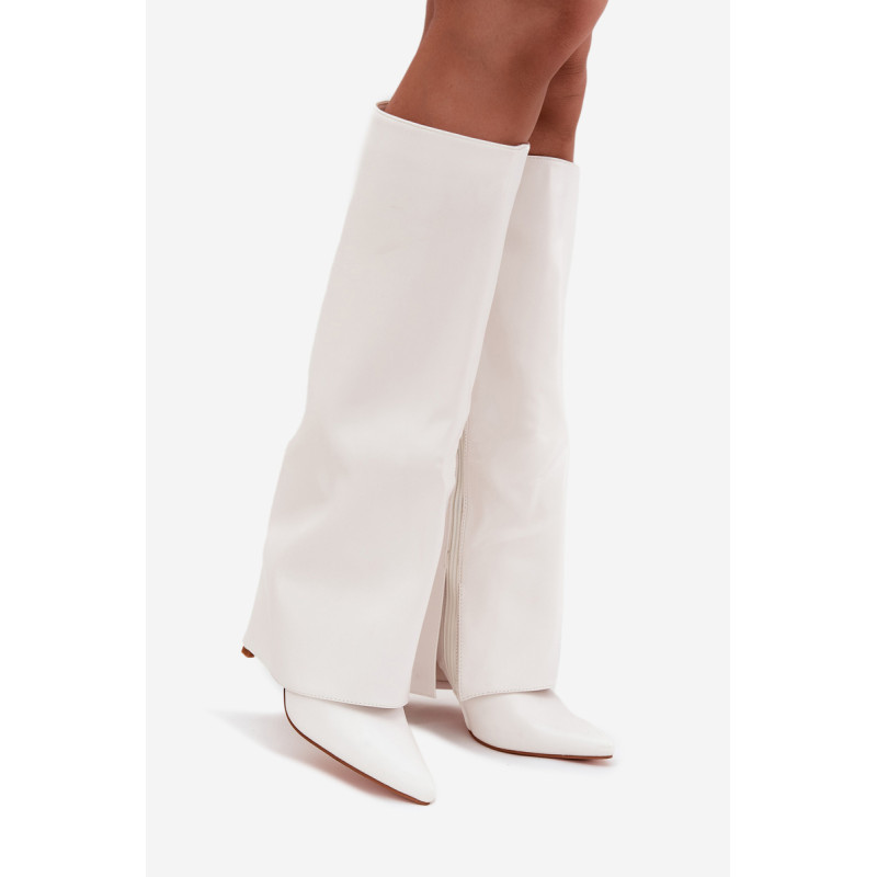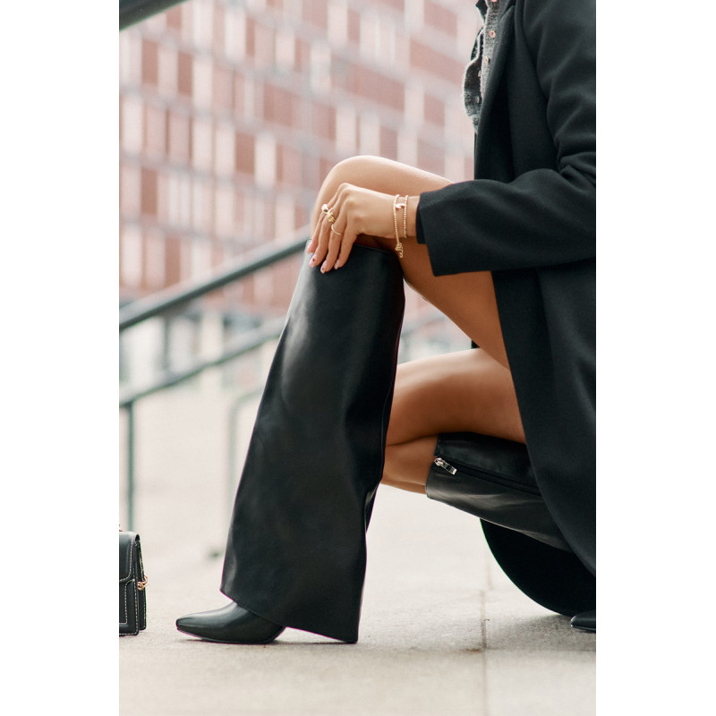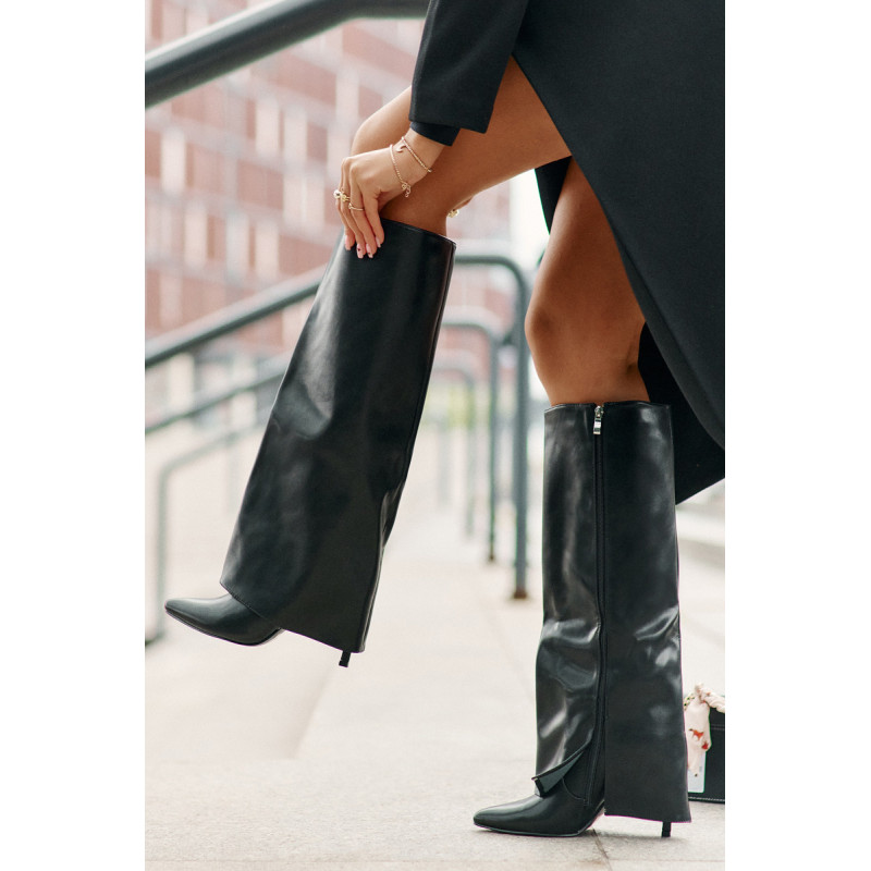 Čizme iz ekološke usnjene so značilne prevrnjenim zgornjim delom, ki elegantno prekriva peto. Model ima špičaste nosove, ki mu dodajajo stil, in stranski zadrgo, kar olajša obuvanje in sezuvanje čevljev. Postavljene na vitko peto, segajo do kolena, poudarjajo žensko silhueto. Popolne za elegantne jesensko-zimske kombinacije! Pri izbiri velikosti si oglejte tabelo velikosti.