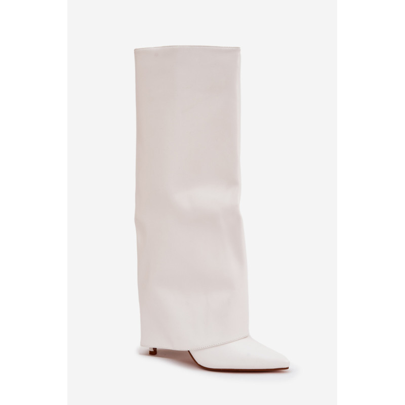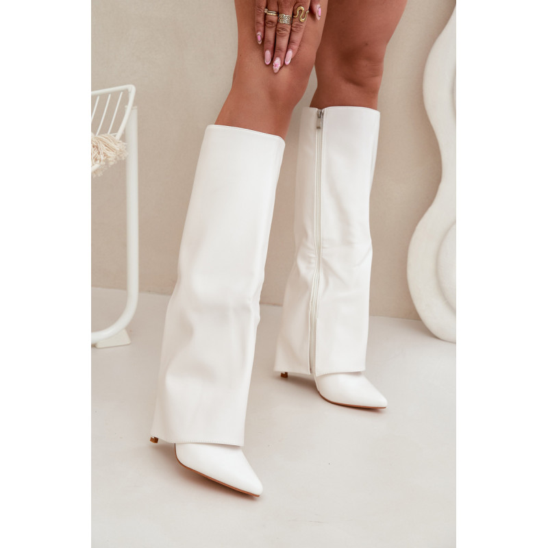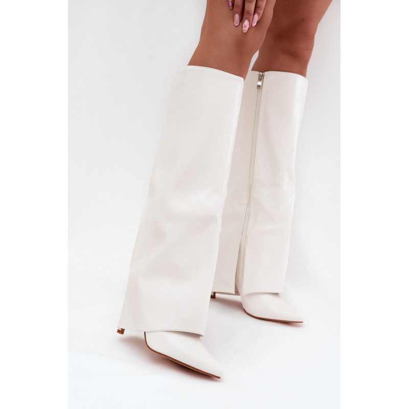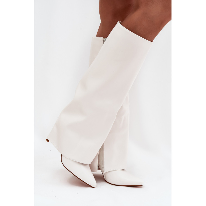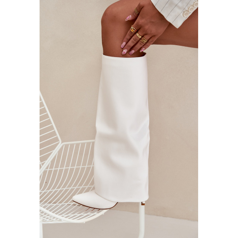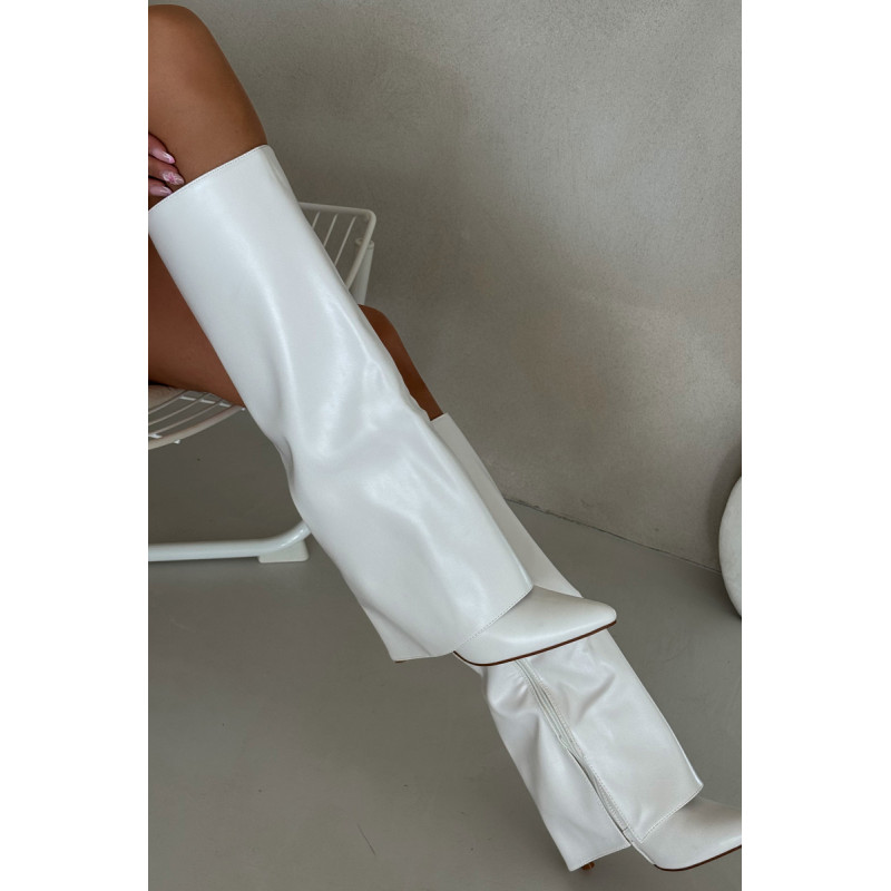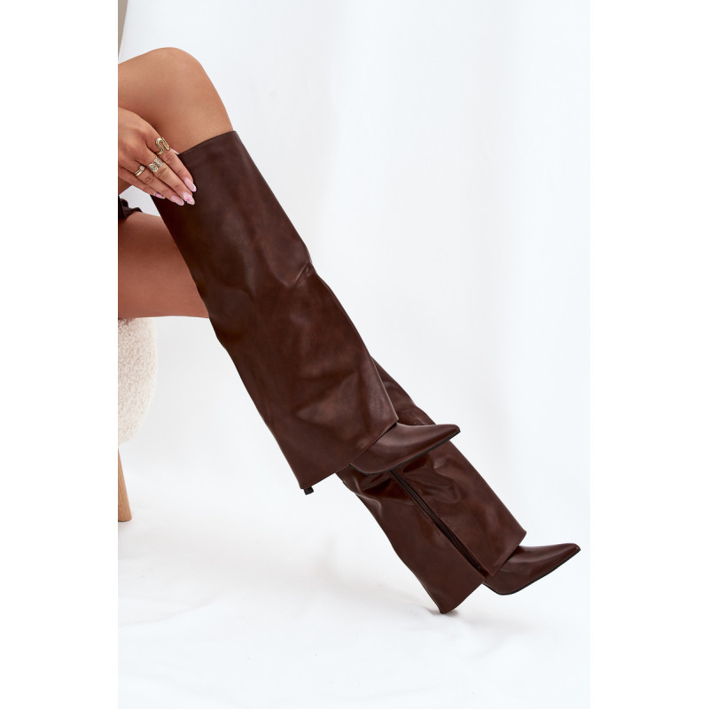 Čizme iz ekološke usnjene so značilne prevrnjenim zgornjim delom, ki elegantno prekriva peto. Model ima špičaste nosove, ki mu dodajajo stil, in stranski zadrgo, kar olajša obuvanje in sezuvanje čevljev. Postavljene na vitko peto, segajo do kolena, poudarjajo žensko silhueto. Popolne za elegantne jesensko-zimske kombinacije! Pri izbiri velikosti si oglejte tabelo velikosti.