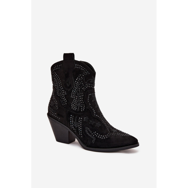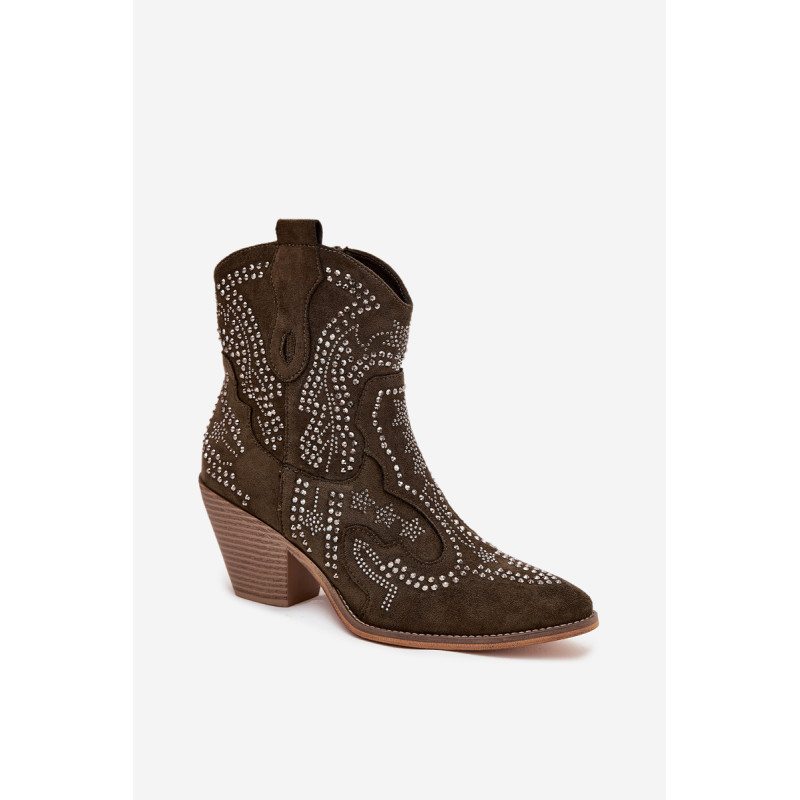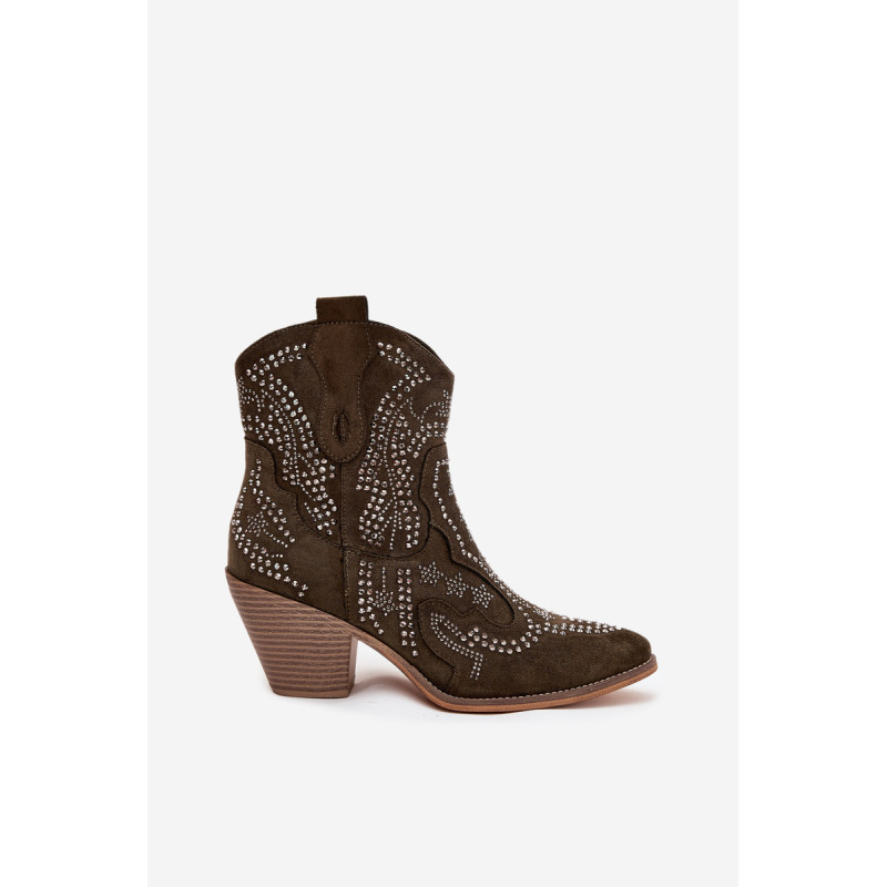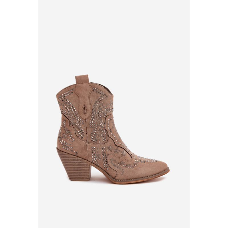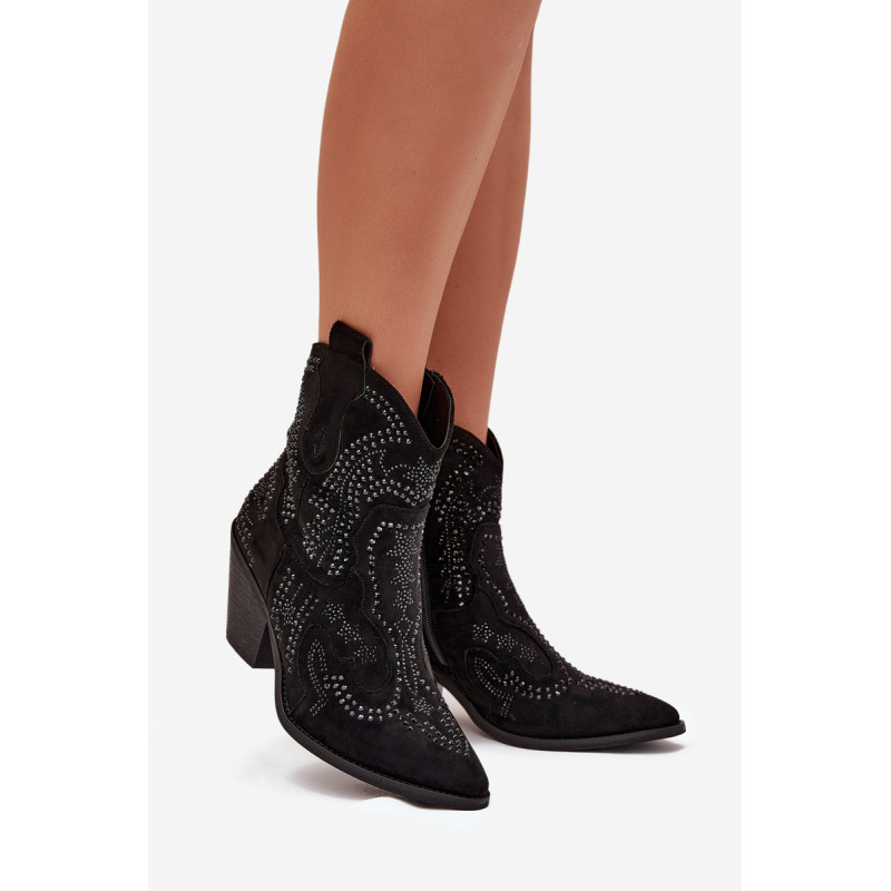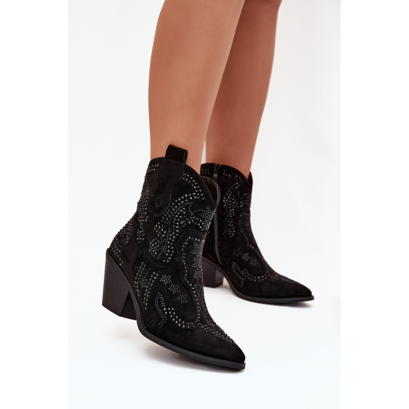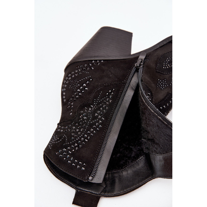 Moteriški kaubojiški batai iš eko zomšos, montuojami ant blokinio kulno, yra madingas pasiūlymas vėsesniems dienoms. Uždaryti užtrauktuku, jie užtikrina lengvą užsidėjimą, o dekoracija ant šlaunies suteikia jiems charakteringą kaubojišką stilių. Amandos formos nosys suteikia jiems subtilumo, o šilta pamušalas garantuoja komfortą ir šilumą. Puikiai tinka laisvalaikio ir boho stiliams, šie batai yra idealus pasirinkimas rudens-žiemos sezonui. Renkantis dydį, vadovaukitės dydžių lentele.