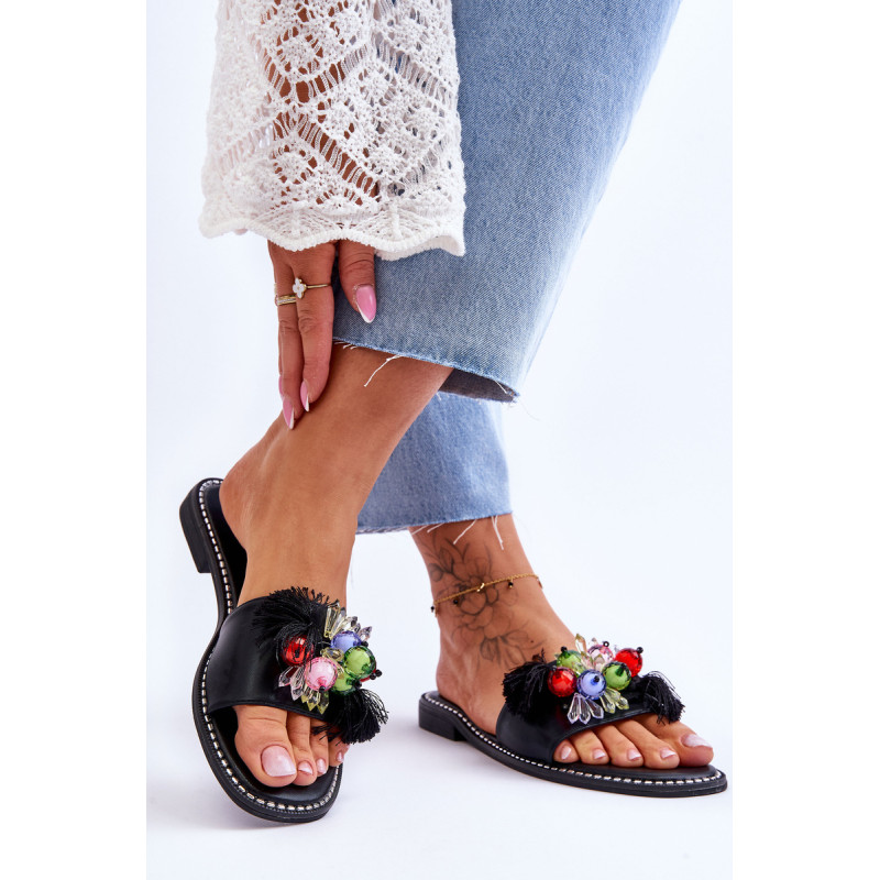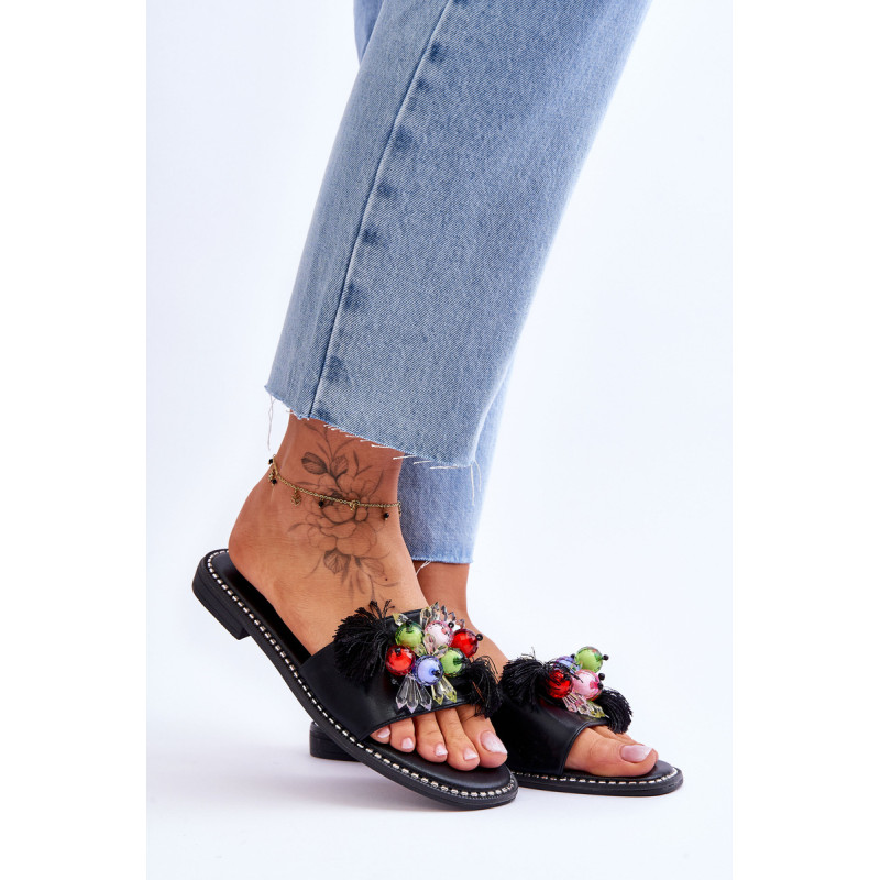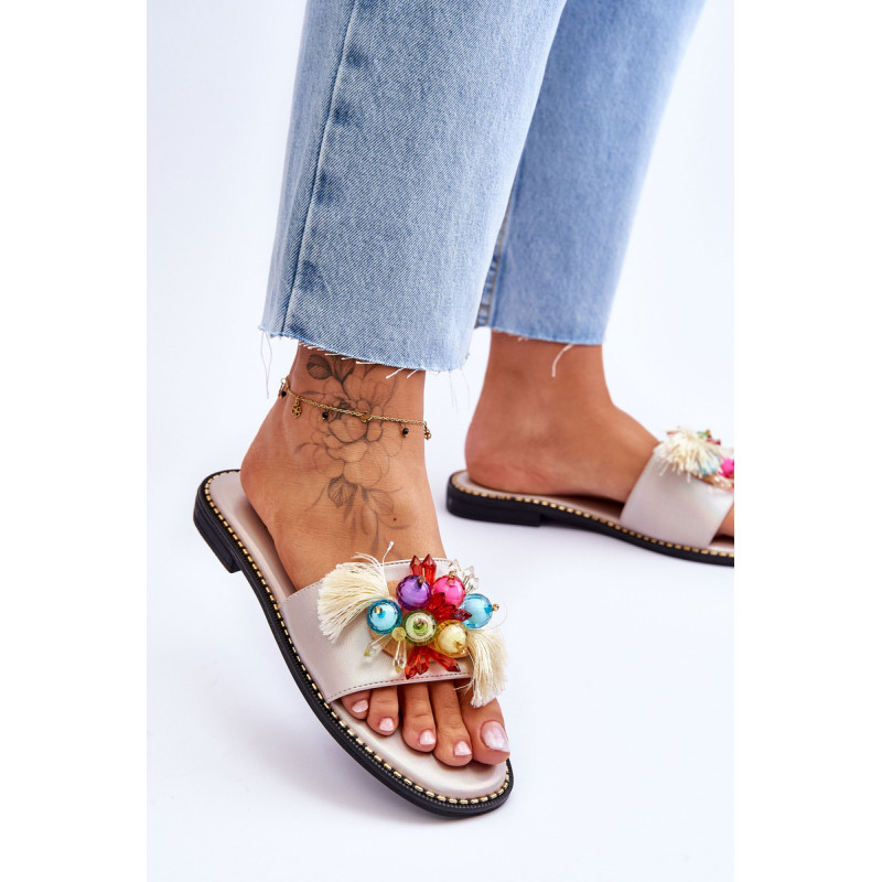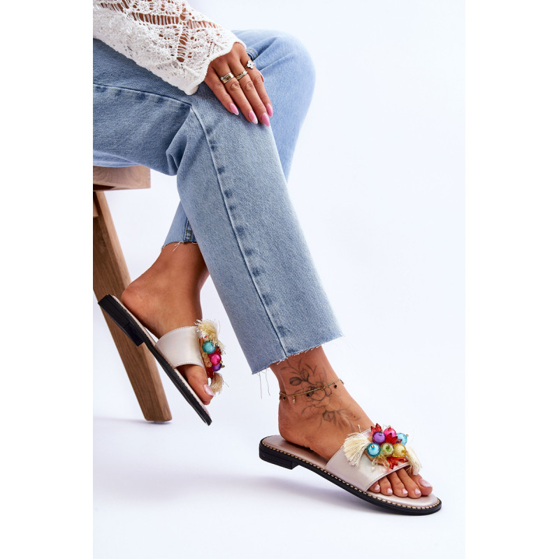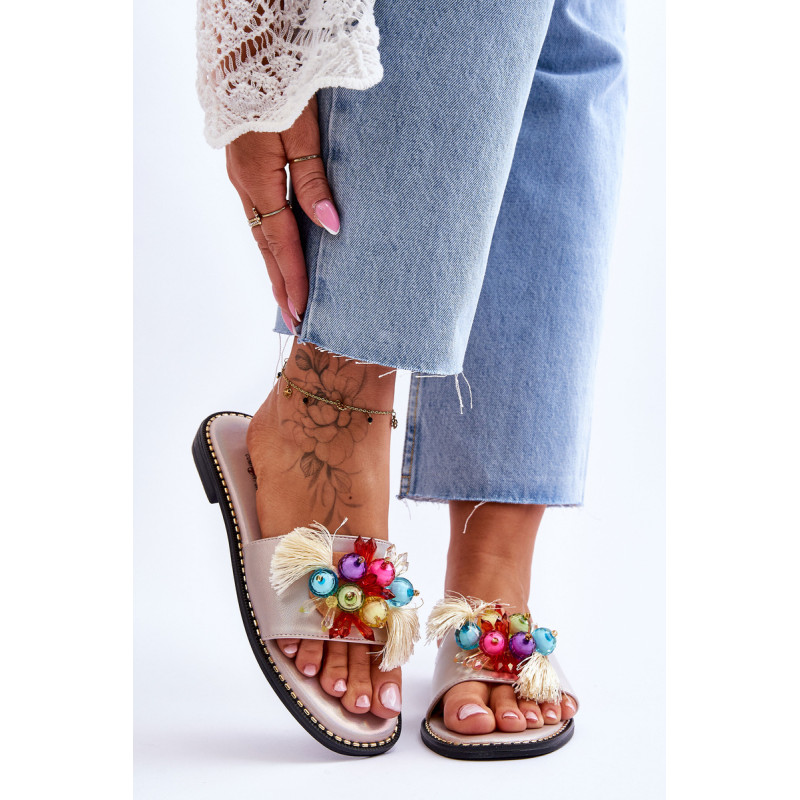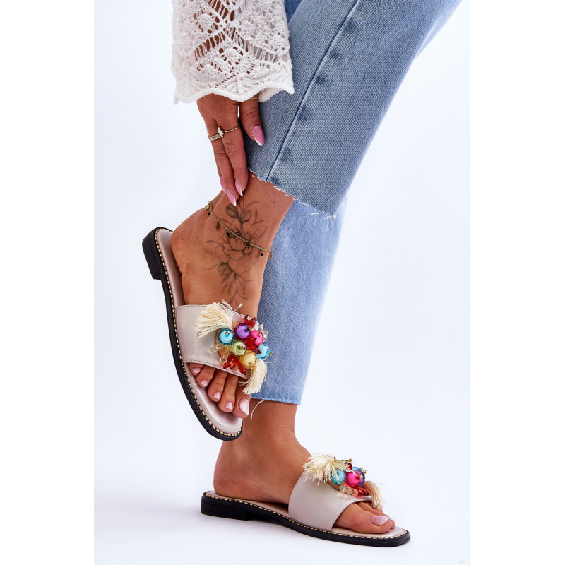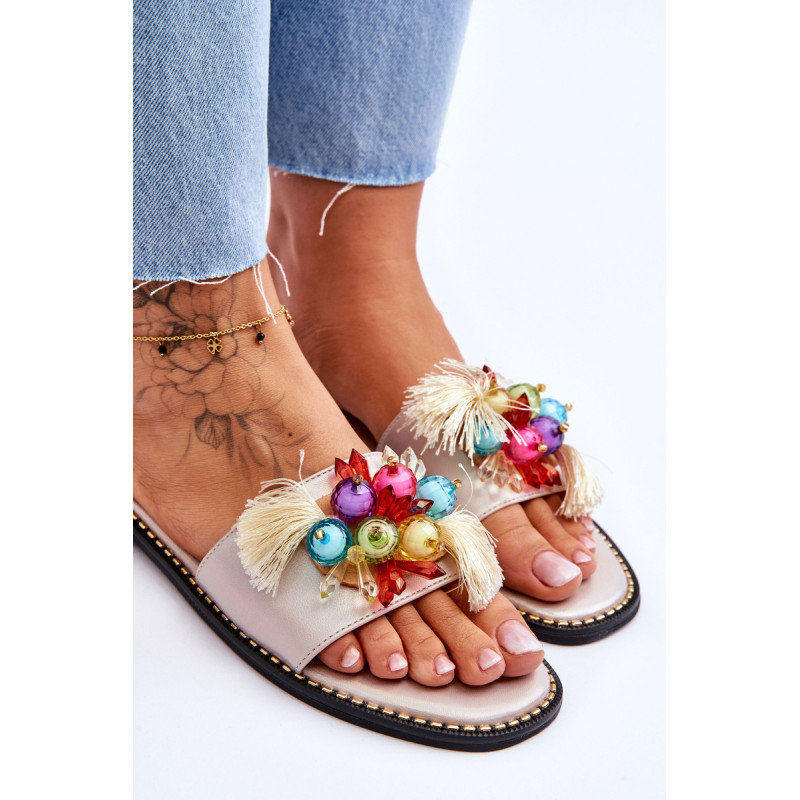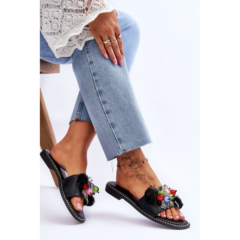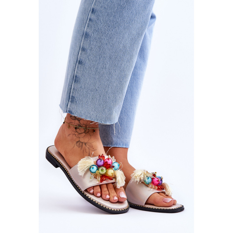 Moteriškos šlepetės pagamintos iš ekologiškos odos. Šio modelio priekyje yra karoliukų ir kutų formos ornamentai. Šlepetės buvo pastatytos ant plokščio kulno, o padas buvo dekoruotas smeigėmis. Šlepetės turi patogų Comfort įdėklą. Jūs tikrai turėtumėte juos turėti! Renkantis dydį, vadovaukitės dydžių lentele.