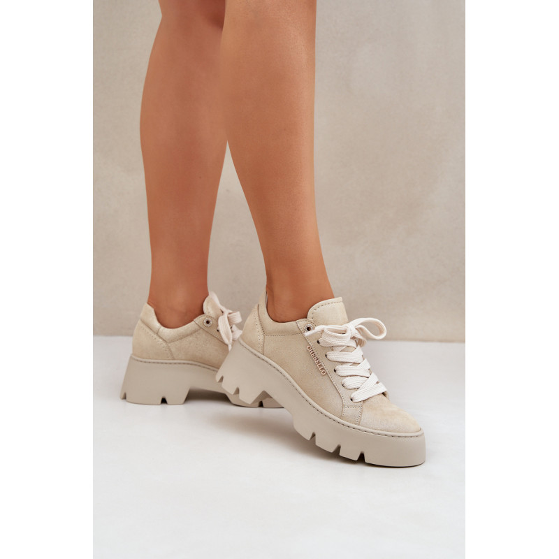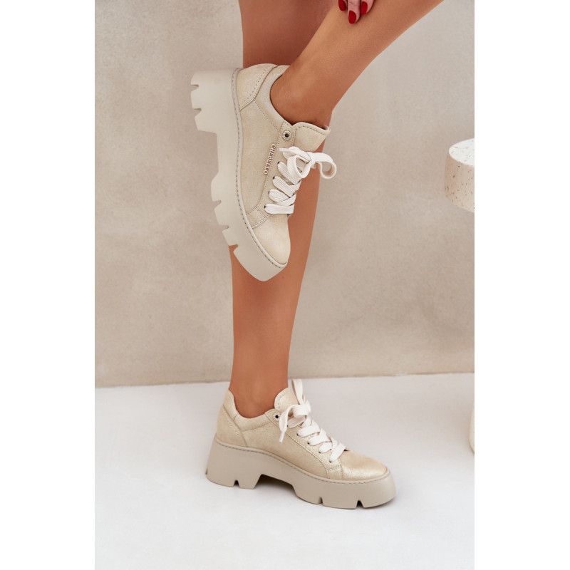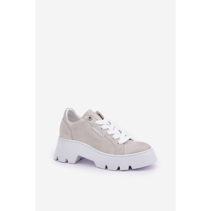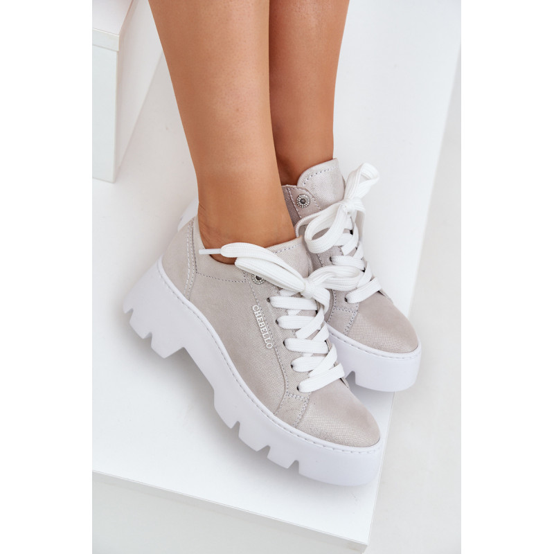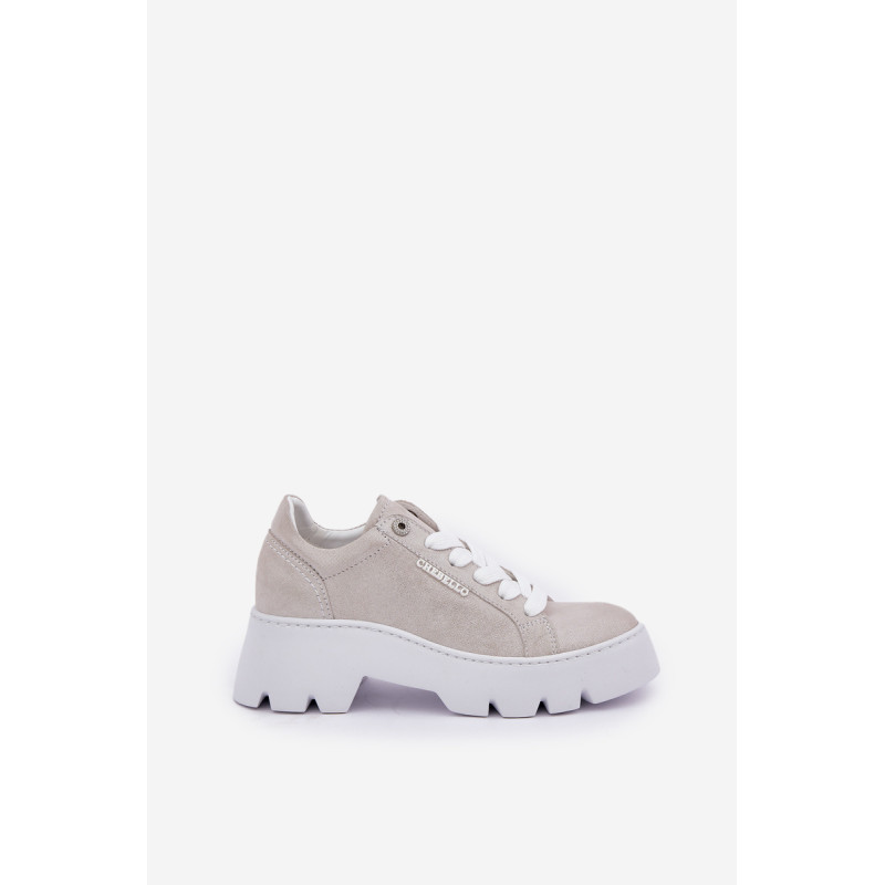 Moteriški sportbačiai iš Chebello prekės ženklo. Pagaminti iš aukštos kokybės natūralios odos, jie garantuoja ilgaamžiškumą ir komfortą. Įrengti ant platformos ir plokščiu kulnu, jie siūlo stabilumą ir komfortą visą dieną. Apvalūs pirštai suteikia jiems subtilų, moterišką charakterį, o stilingas siluetas puikiai dera tiek su kasdieniais, tiek su elegantiškais įvaizdžiais. Tai ideali pasirinktis moterims, norinčioms sujungti madą su komfortu. Renkantis dydį, vadovaukitės dydžių lentele.