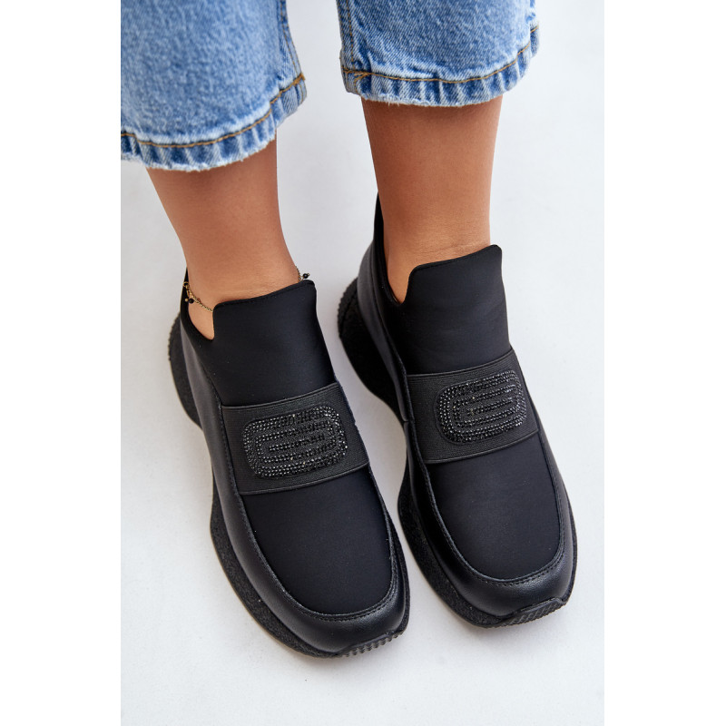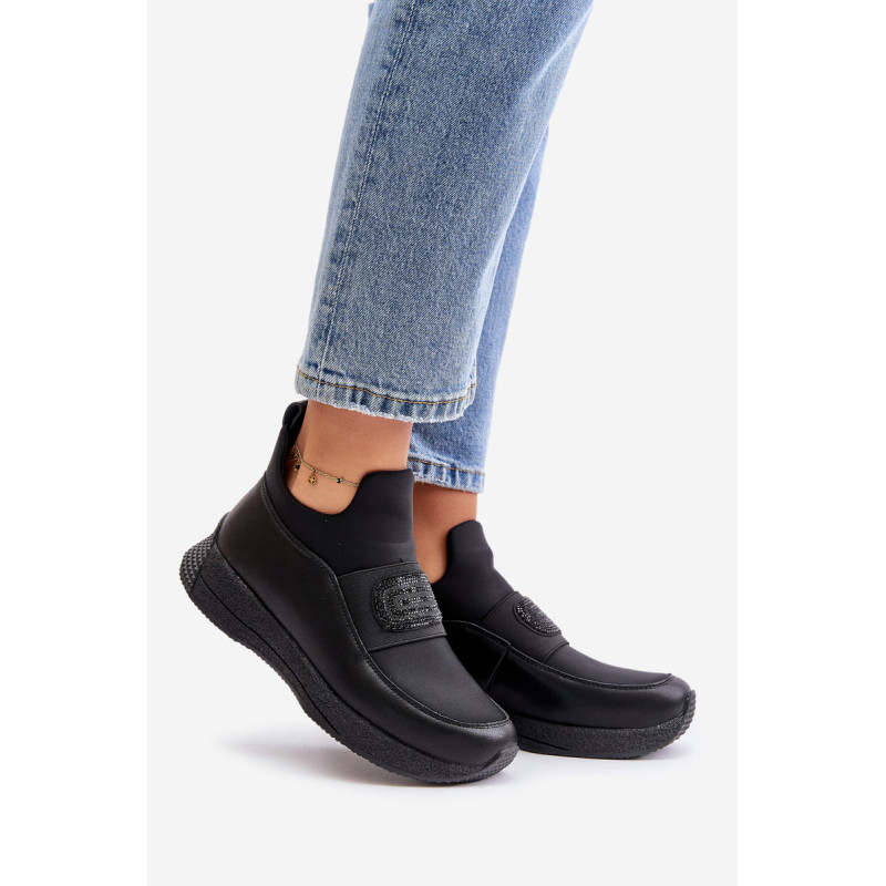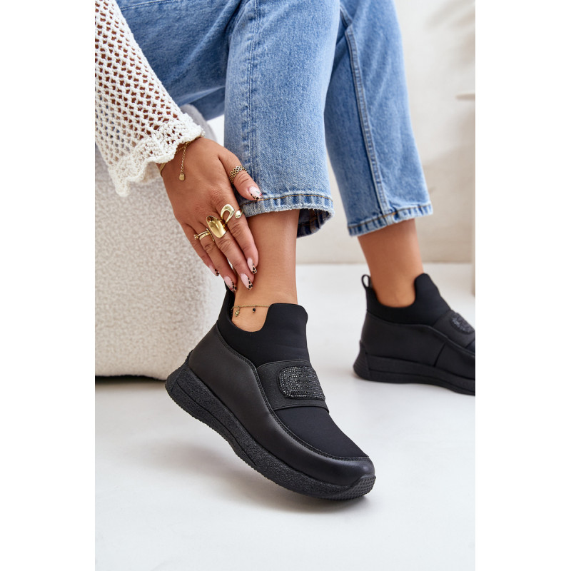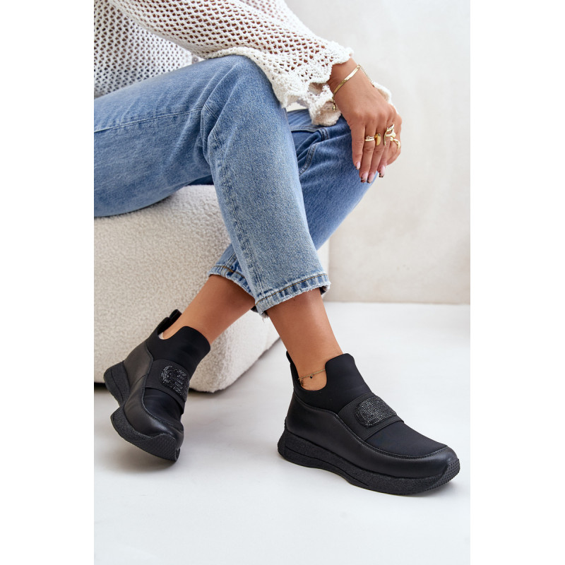 Sportiniai batai, pagaminti iš natūralios odos ir audinio derinio. Nustatyti ant platformos. Viduje izoliuoti avalynės vilna, todėl jie yra idealus pasirinkimas vėsesnėms dienoms. Priekyje yra blizgus dirželio elementas, kuris suteikia visumai elegantiškumo. Rinkdamiesi dydį žiūrėkite dydžių lentelę.