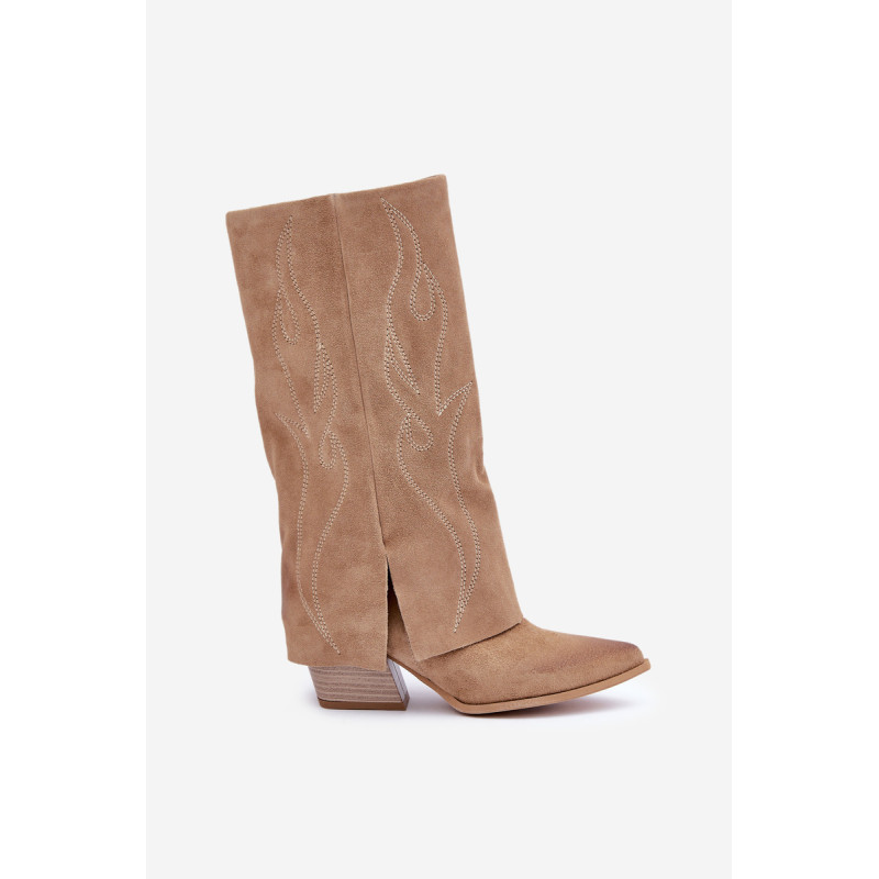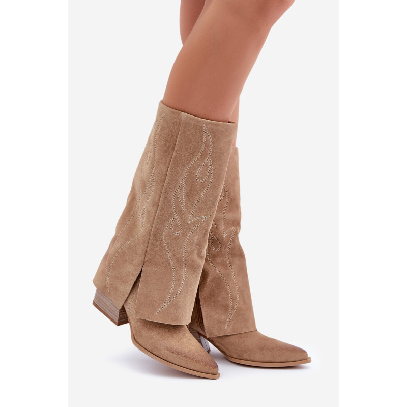 Natūralaus zomšos pagaminti ilgaauliai batai, siekiantys iki blauzdos, yra išskirtinai stilingas ir elegantiškas pasirinkimas. Charakternai smailūs pirštai suteikia jiems rafinuotą išvaizdą, o apversta aulinių su dekoratyviniais siūlais yra pagrindinis dekoratyvinis elementas, pridėdamas originalumo ir subtilaus kaubojiško akcento. Modelis užsegamas užtrauktuku, kas užtikrina patogumą naudojant. Puikiai tinka tiek kasdieniam, tiek elegantiškesniems renginiams. Renkantis dydį, vadovaukitės dydžių lentele.