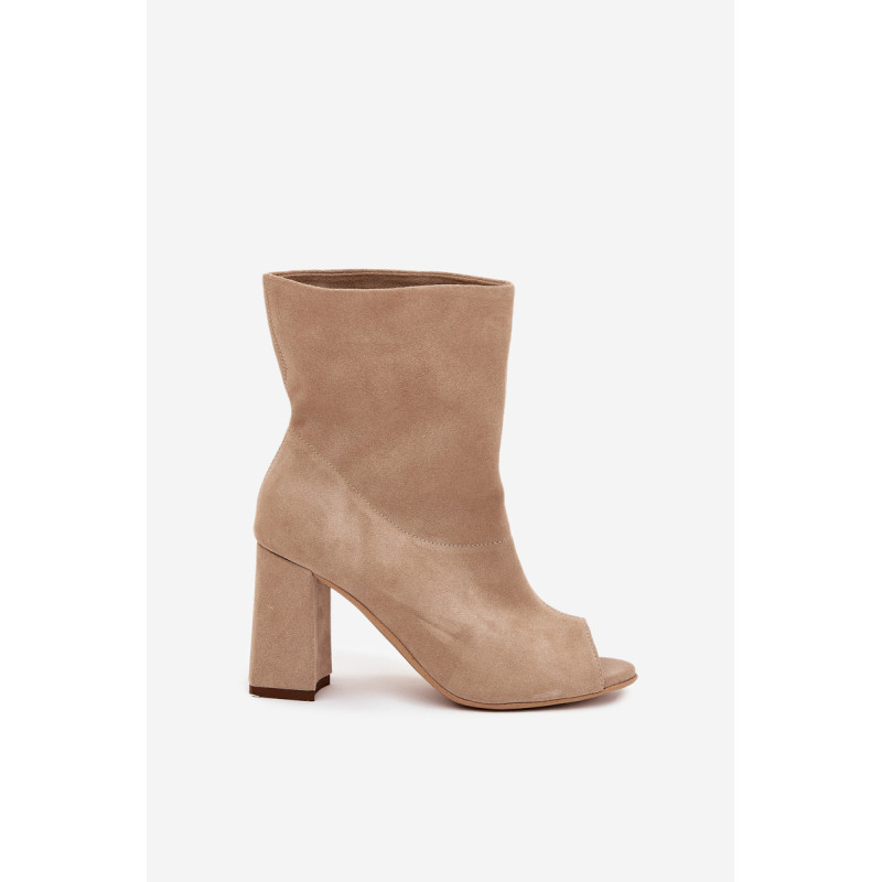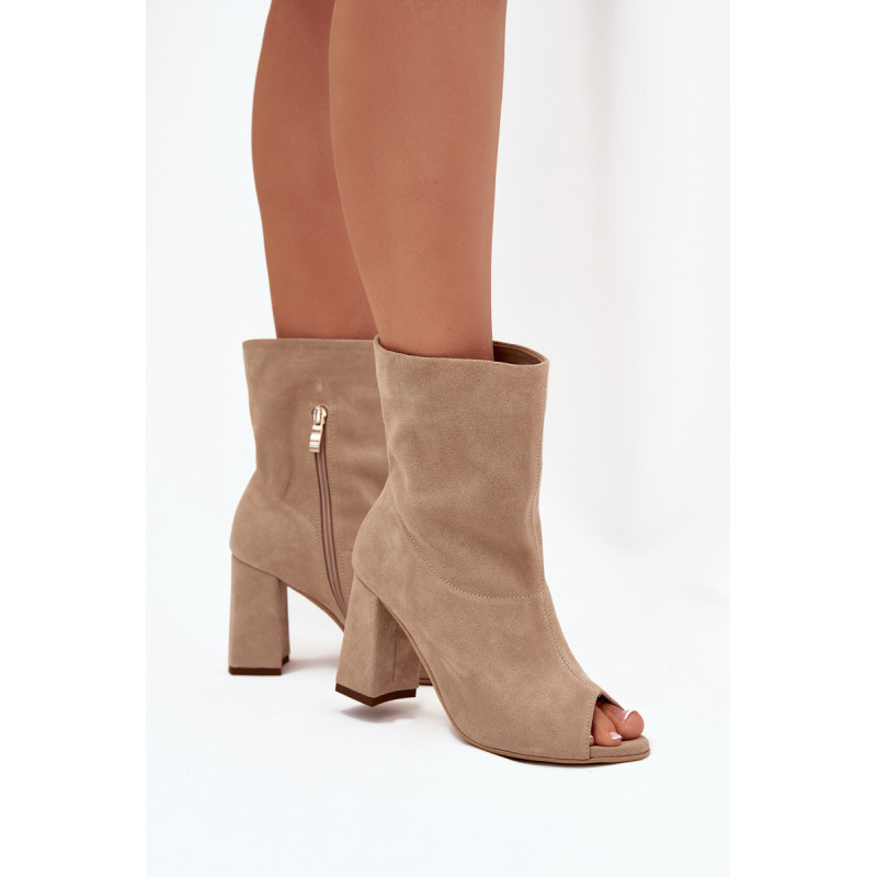 Moteriški auliniai batai, pagaminti iš natūralios zomšos, sumontuoti ant bloko kulno, yra elegantiška pasiūla, kuri sujungia klasiką su moderniu stiliumi. Modelis išsiskiria atviromis pirštų dalimis, suteikiančiomis lengvumo ir moteriškumo. Įsispiriami su papildomu užtrauktuku, garantuojantys komfortą ir lengvumą užsidėti. Virš kulkšnies siekianti viršutinė dalis pabrėžia jų subtilų, bet ryškų dizainą, todėl jie puikiai tinka elegantiškiems pasimatymams ir vakariniams susitikimams. Renkantis dydį, vadovaukitės dydžių lentele.
