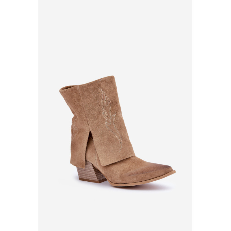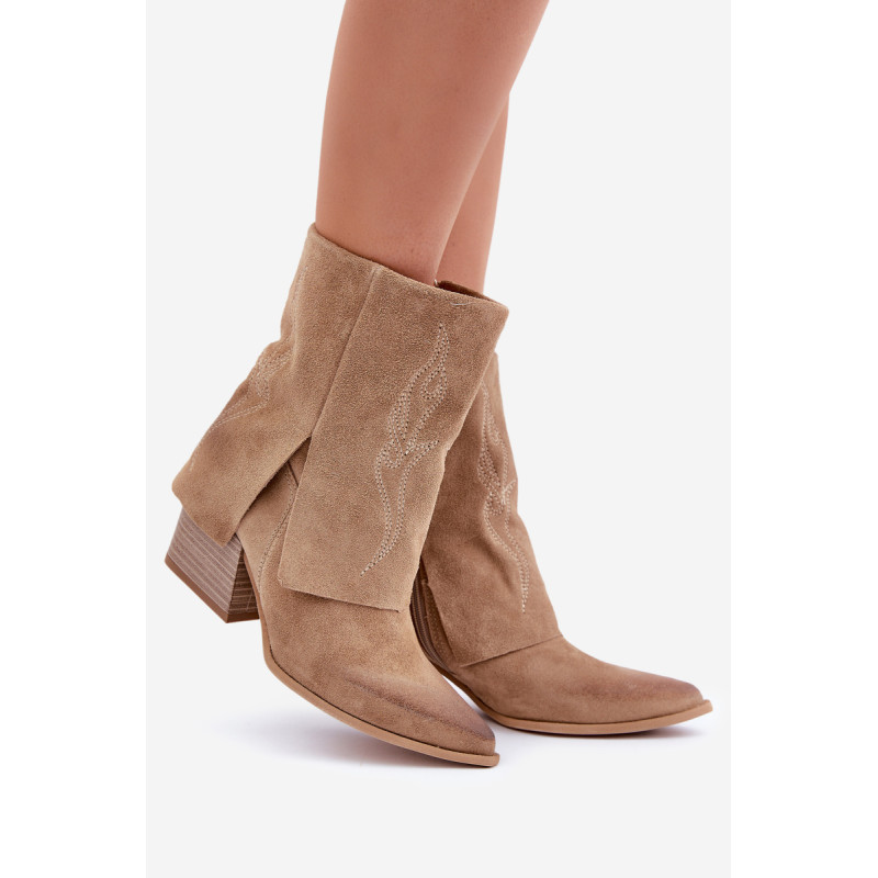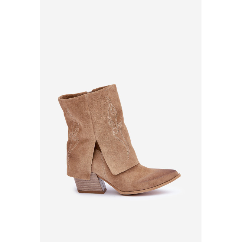 Natūralaus zomšo cowboy batai yra ideali elegancijos ir stiliaus kombinacija. Įrengti ant stabilaus bloko kulno, jie užtikrina komfortą ir pailgina siluetą. Modelis užsegamas šone užtrauktuku, kas palengvina užsidėjimą, o apversta blauzdos dalis, papuošta subtiliais siūlais, suteikia charakterį ir pabrėžia cowboy stilių. Madingi ir elegantiški, jie yra puikus pasirinkimas tiek kasdieniams, tiek rafinuotesniems įvaizdžiams. Renkantis dydį, vadovaukitės dydžių lentele.