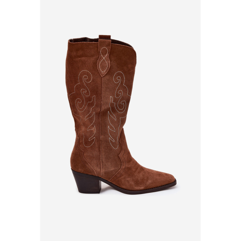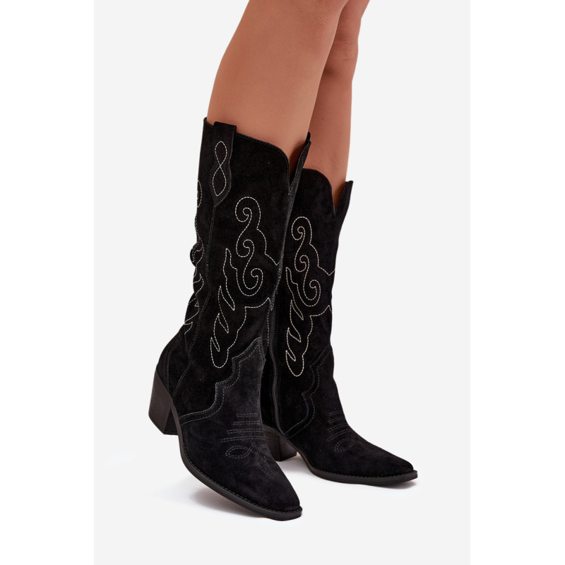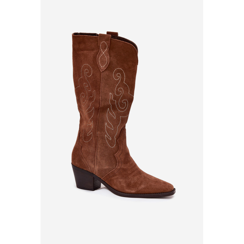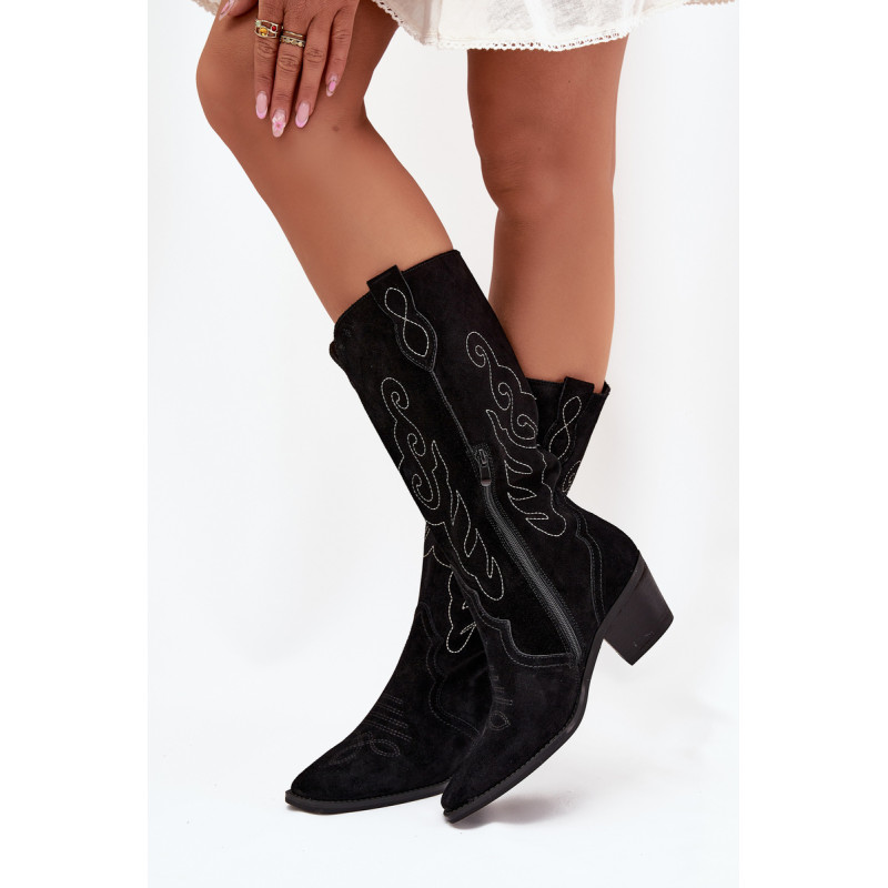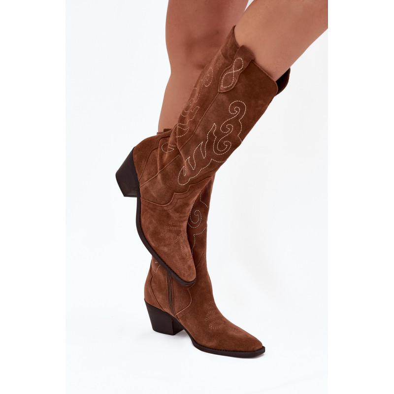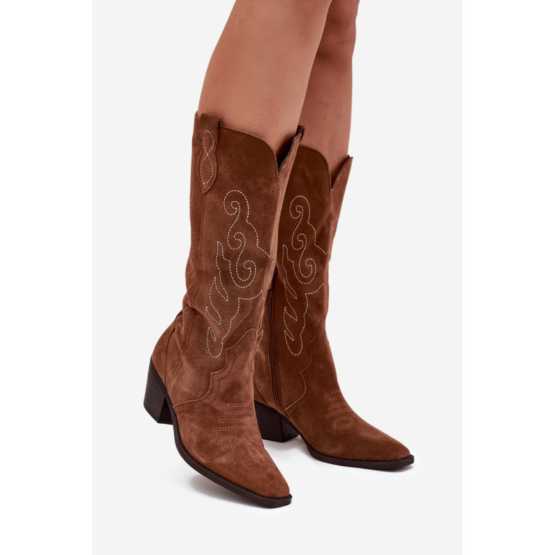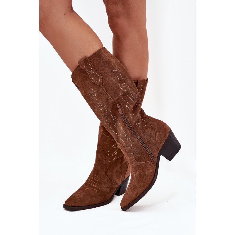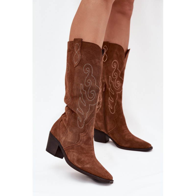 Moteriški kaubojiško stiliaus aulinukai – itin madinga avalynė pavasario-rudens sezonui. Pagaminta iš natūralios zomšos. Dėl stabilaus, žemo kulno jie yra patogūs ir puikiai tinka dėvėti kasdien. Užsegamas modelis su papildomu užtrauktuku leidžia lengvai apsiauti batus. Kotas siekia šiek tiek žemiau kelio. Odinis, minkštas vidpadis suteikia komfortą nešiojant. Šie batai puikiai papildys įvairius stilius. Jie tikrai turėtų būti jūsų garderobe! Rinkdamiesi dydį, žiūrėkite dydžių lentelę.