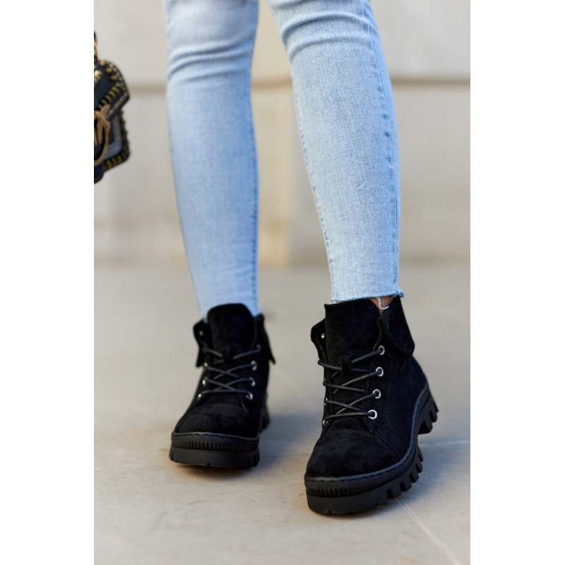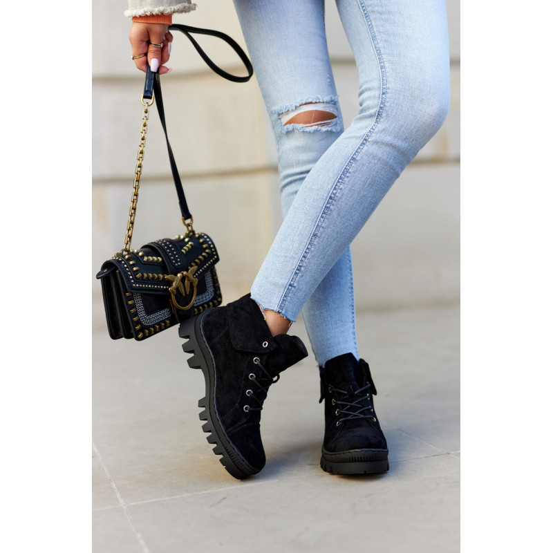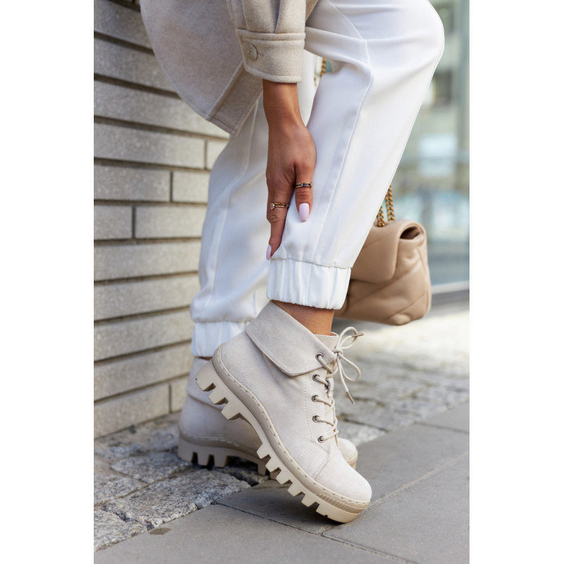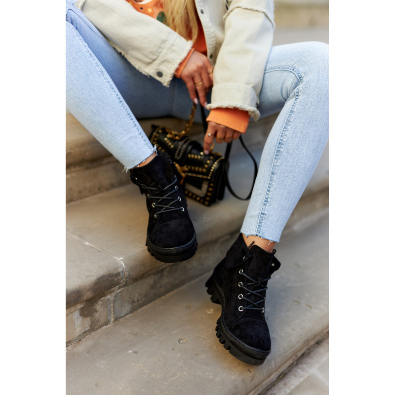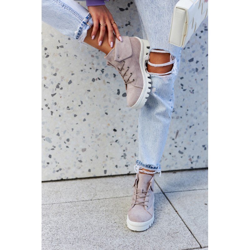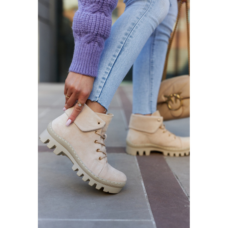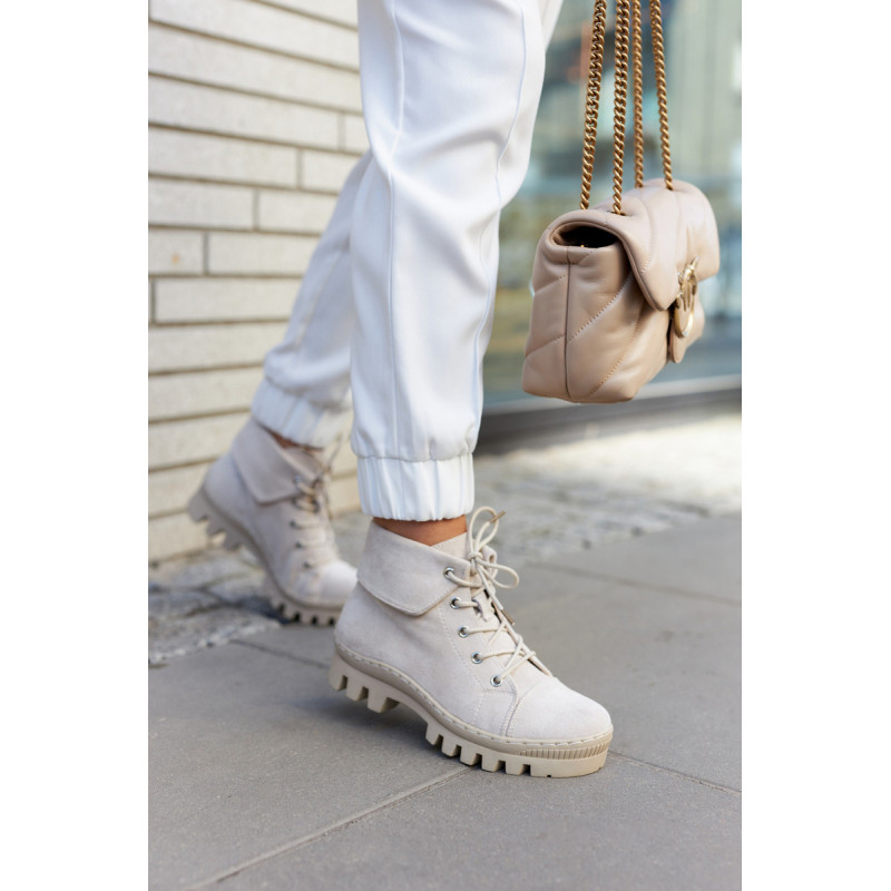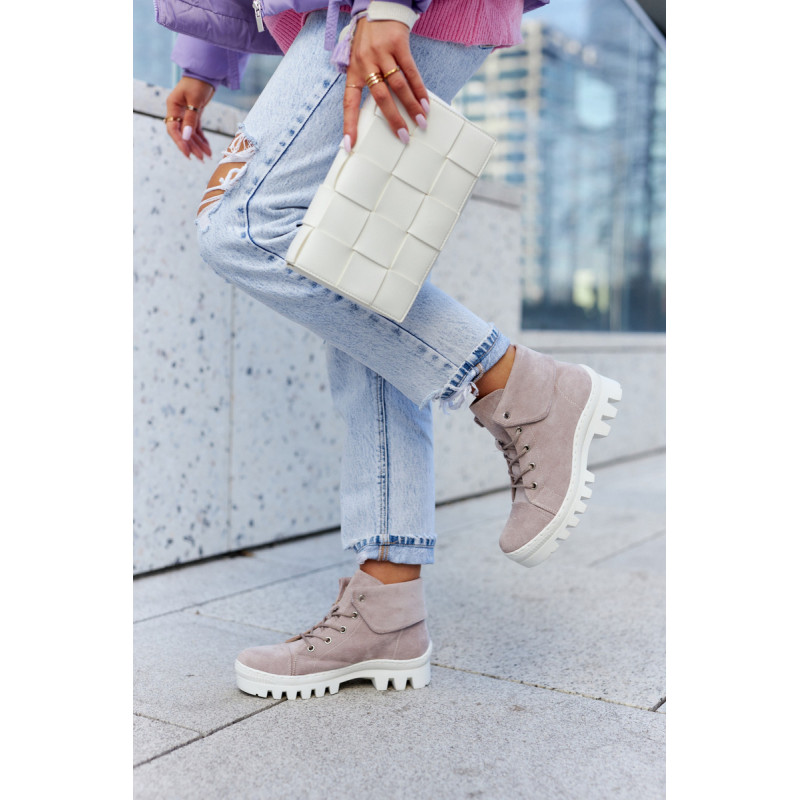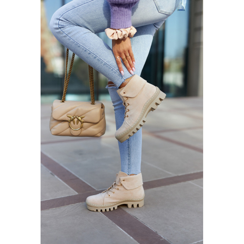 Trappers pagaminti iš ekologiškos zomšos, su apvaliais raišteliais. Jie montuojami ant storo pado su madingomis išpjovomis pade. Kietas, suapvalintas pirštas. Viršutinė kulkšnies dalis, kuri papildomai šiek tiek išlenkta. Puikūs batai kasdieniam stiliui. Jie turi minkštą, ekologišką odinį vidpadį ir standintą kulną. Tobuli batai pavasariui, privalai juos turėti! Renkantis dydį, naudokite dydžių lentelę.