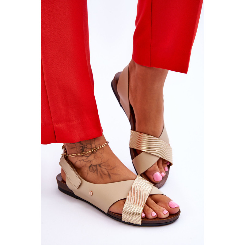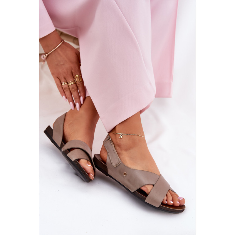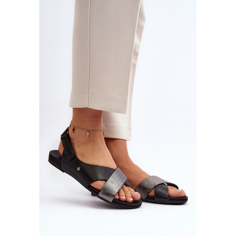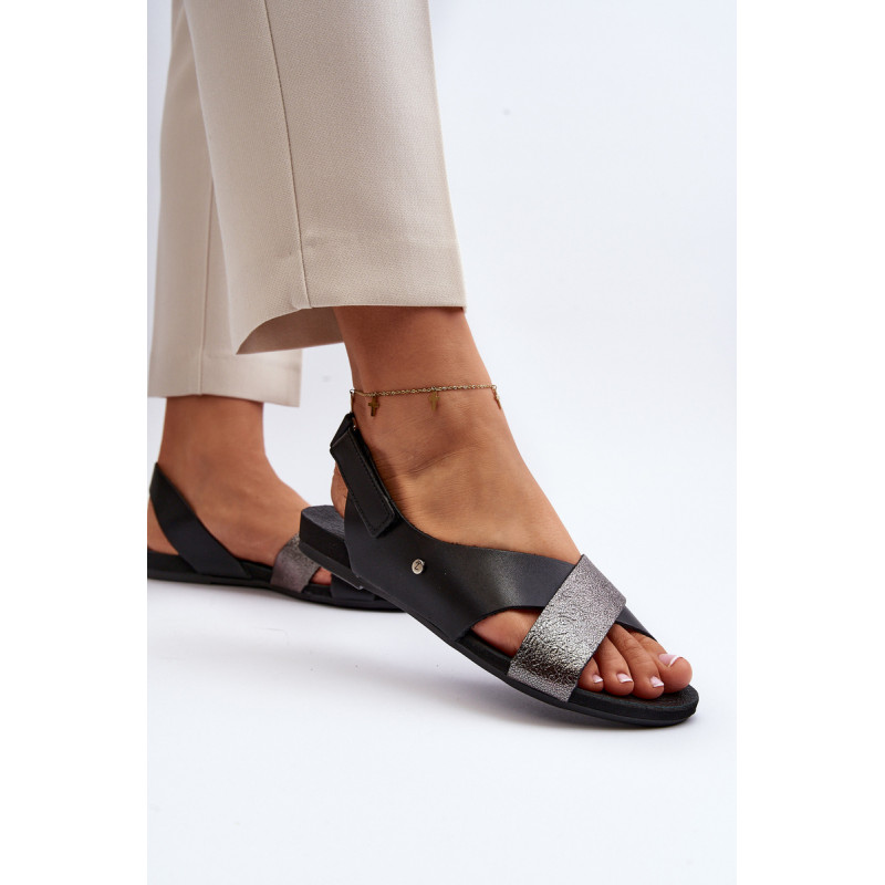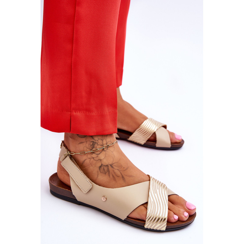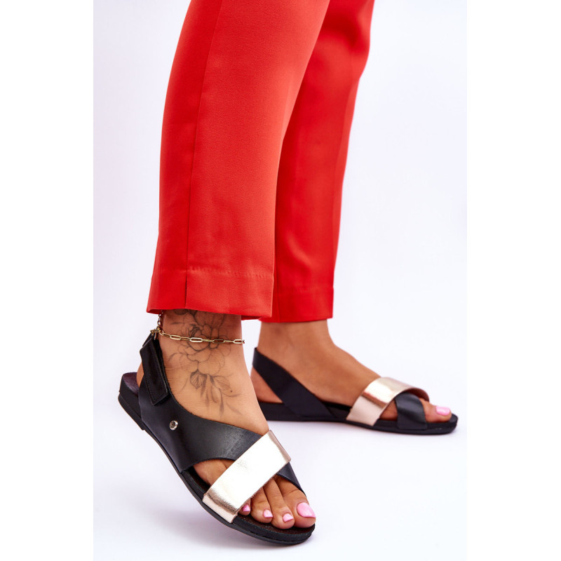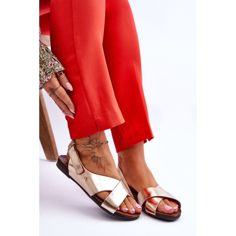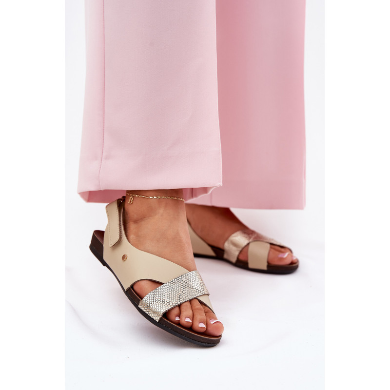 Klasikiniai ir patogūs sandalai pagaminti iš natūralios odos. Jie turi Velcro užsegimą. Šis modelis pastatytas ant plokščio kulno su neslidžiu padu. Be to, viršutinės dalies šone yra emblema su logotipu. Sandalai turi atvirą kulną ir pirštus. Puikus modelis šiltoms dienoms! Rinkdamiesi dydį, vadovaukitės dydžių lentele.