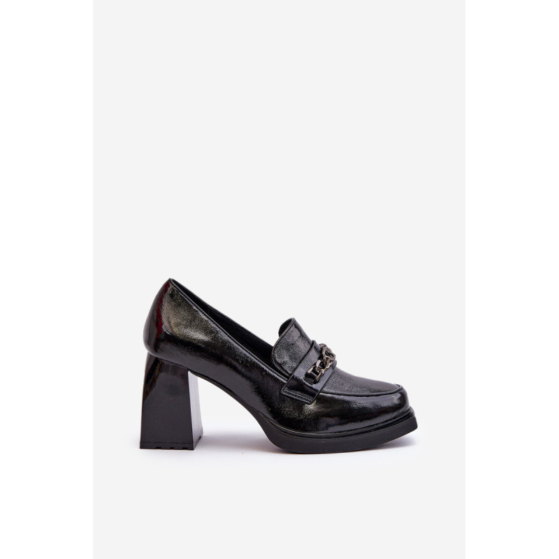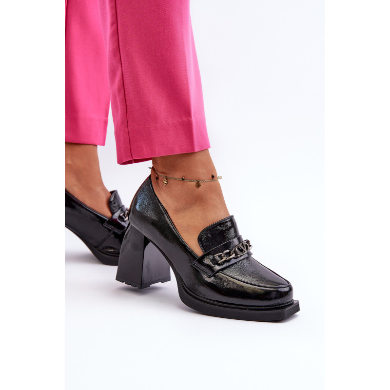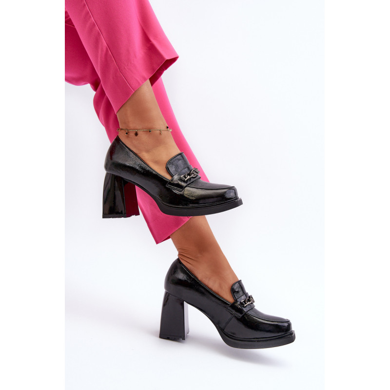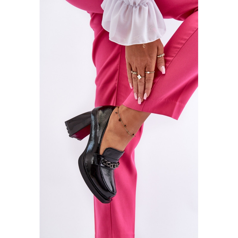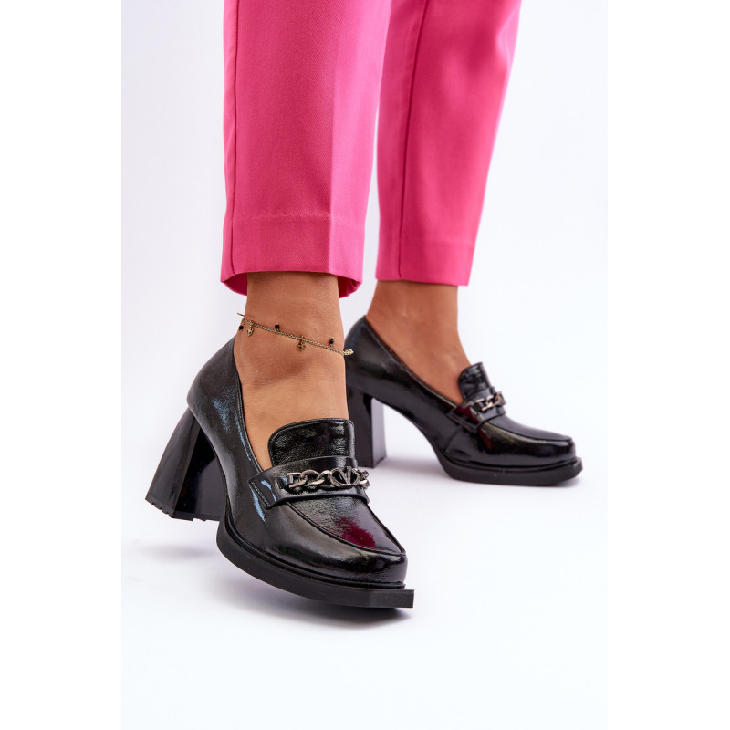 Odinės pompos yra puikus pasirinkimas kiekvienai moteriai, vertinančiai madingą ir patogią avalynę! Šis modelis pastatytas ant subtilios platformos ir masyvaus, stulpelio formos aukšto kulno. Be to, jie turi sustiprintą kulno skaitiklį. Priekinė dalis dekoruota dirželiu ir grandinėle. Puikus modelis daugeliui stilių! Rinkdamiesi dydį, žiūrėkite dydžių lentelę.