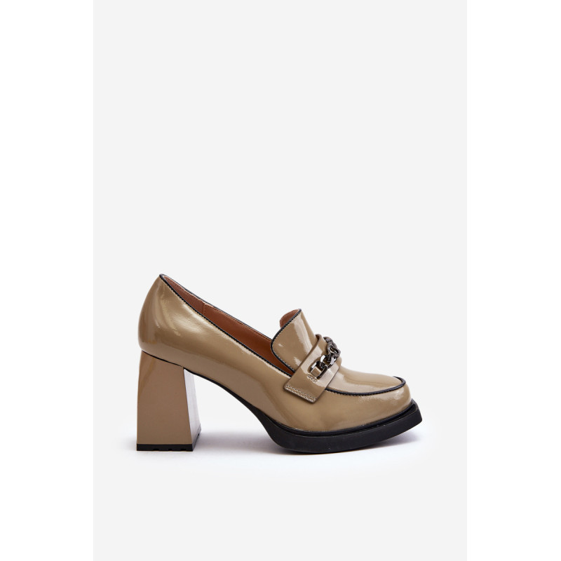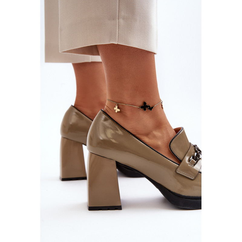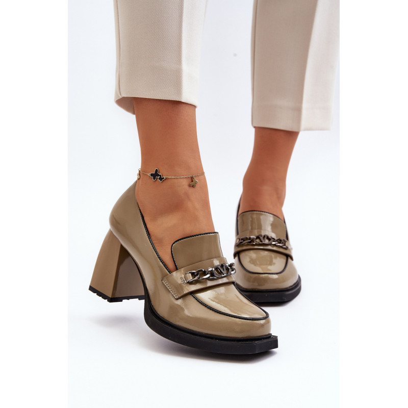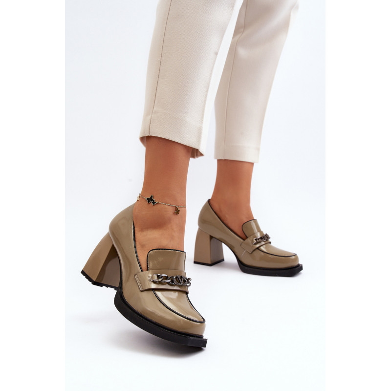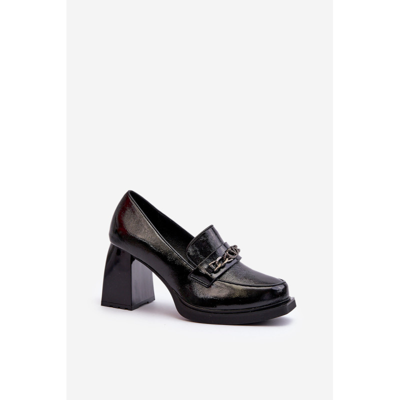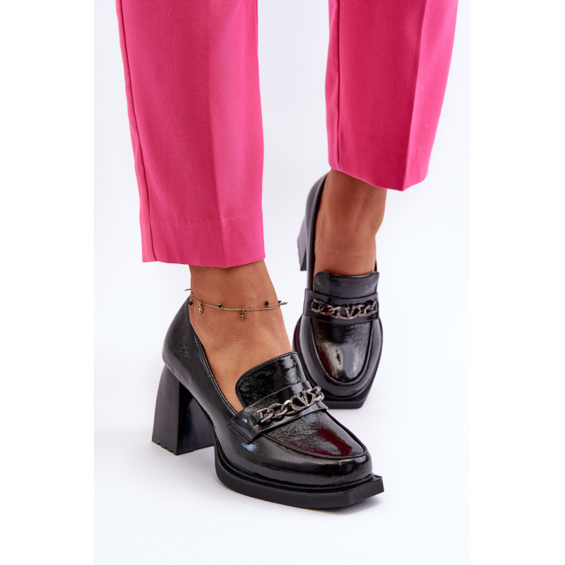 Odinės pompos yra puikus pasirinkimas kiekvienai moteriai, vertinančiai madingą ir patogią avalynę! Šis modelis pastatytas ant subtilios platformos ir masyvaus, stulpelio formos aukšto kulno. Be to, jie turi sustiprintą kulno skaitiklį. Priekinė dalis dekoruota dirželiu ir grandinėle. Puikus modelis daugeliui stilių! Rinkdamiesi dydį, žiūrėkite dydžių lentelę.
