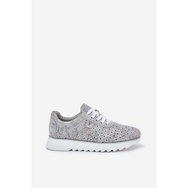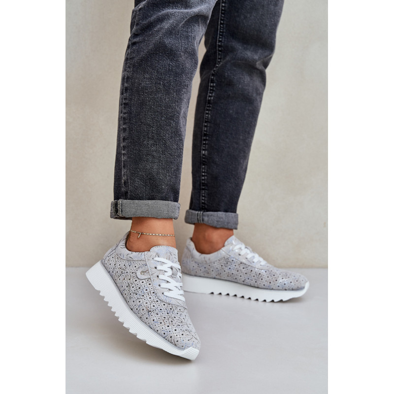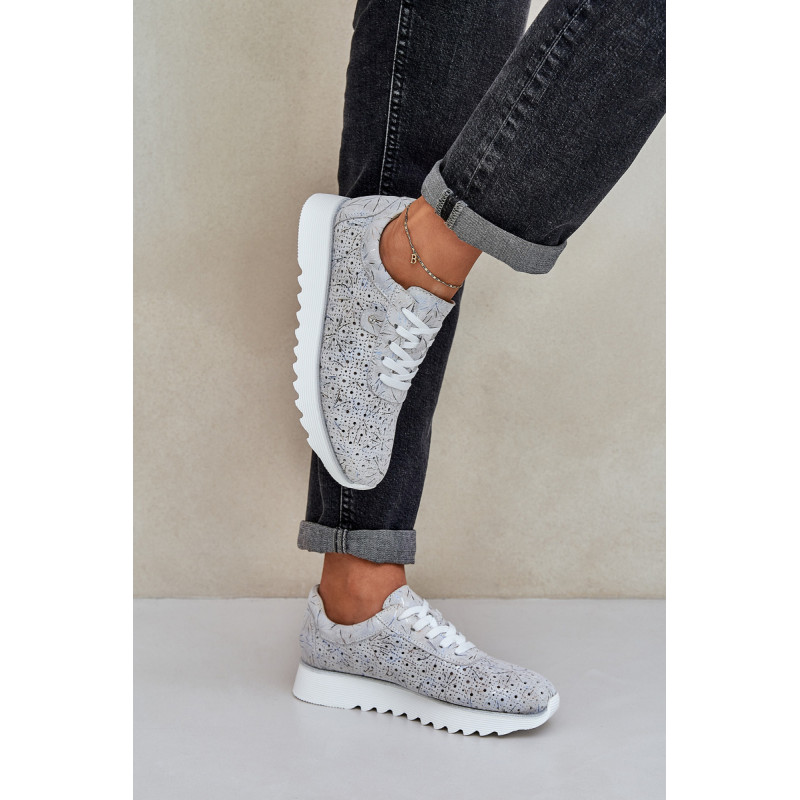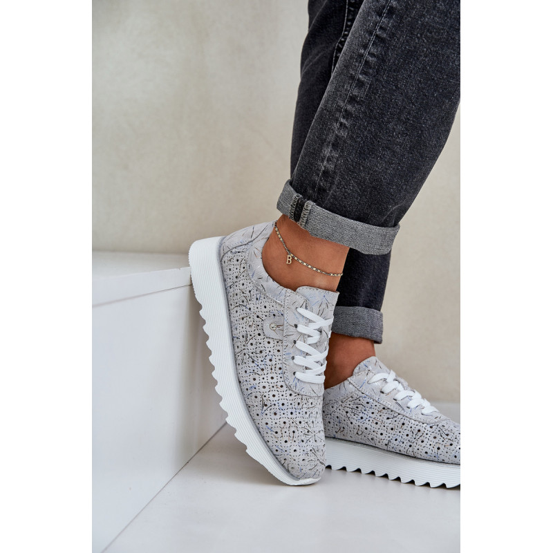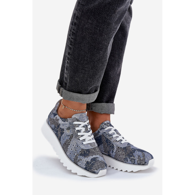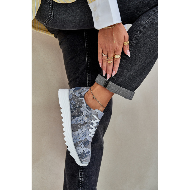 Sportiniai batai su raštuotu, perforuotu viršumi yra stilingas kasdienio dėvėjimo variantas. Įrengti ant blizgios platformos, jie prideda spindesio kiekvienam įvaizdžiui. Pagaminti iš natūralios zomšos, garantuoja patvarumą, o minkštas odinis padas užtikrina komfortą visą dieną. Tobulas komforto ir madingo įvaizdžio derinys. Renkantis dydį, vadovaukitės dydžių lentele.