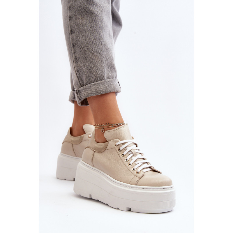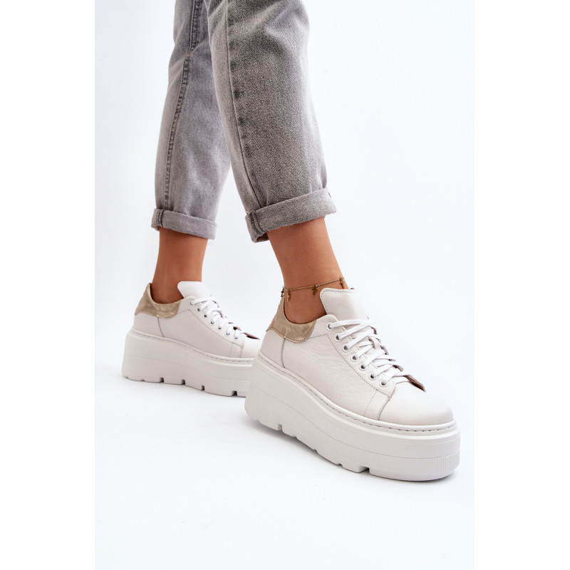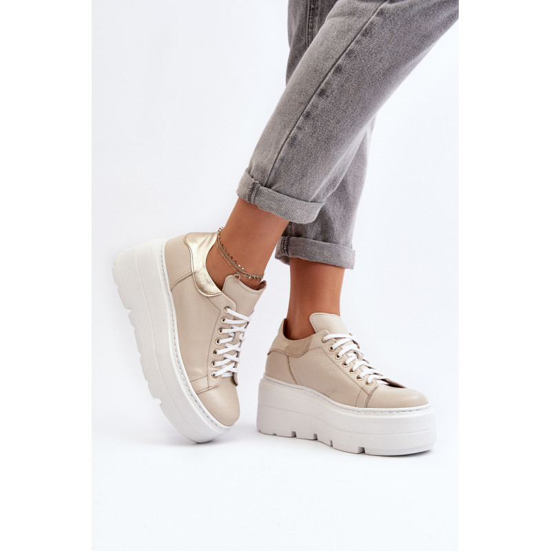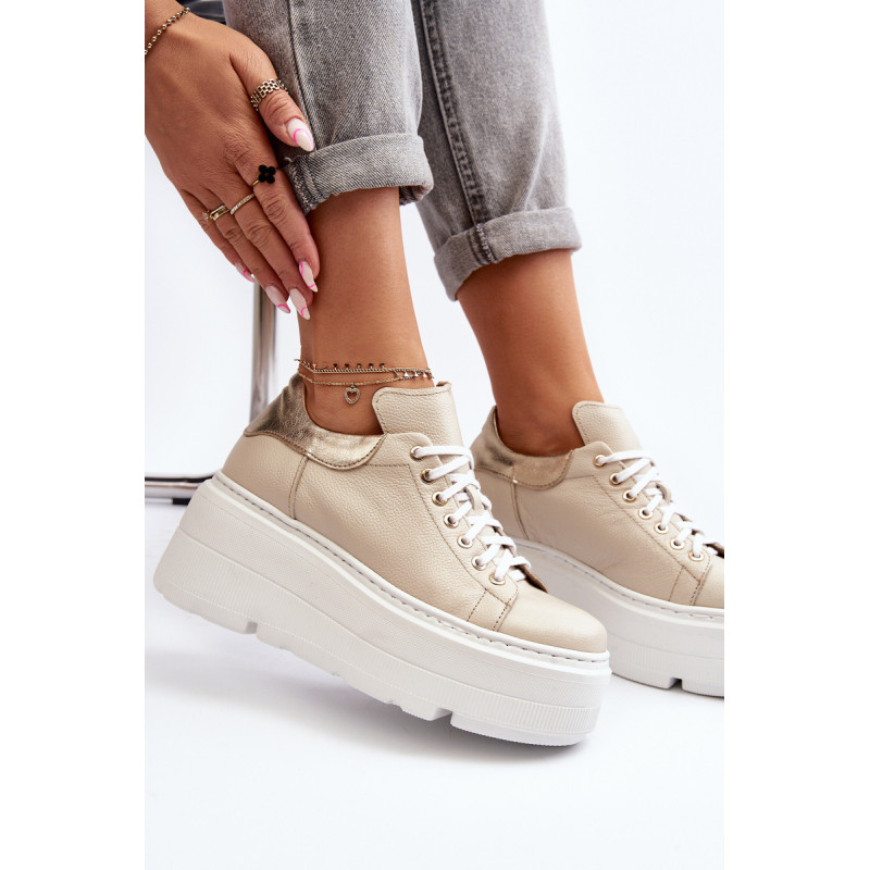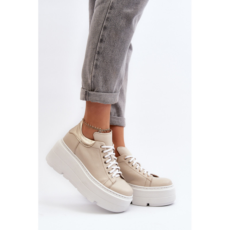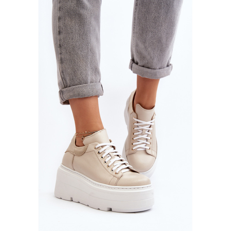 Moteriški sportiniai batai iš natūralios odos. Masyvi platforma daro juos itin stilingus. Odinis vidpadis suteikia komforto naudojimo metu. Suapvalinti kojų pirštai. Puikiai tinka kasdienei stilizacijai! Rinkdamiesi dydį, žiūrėkite dydžių lentelę.