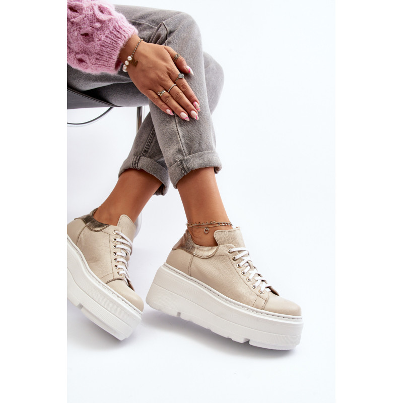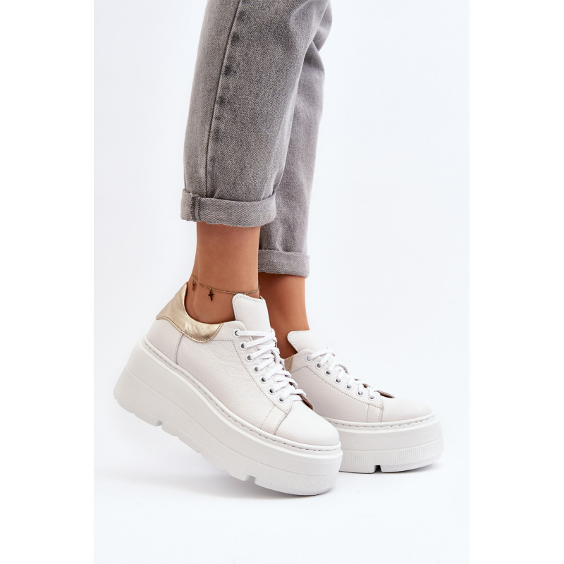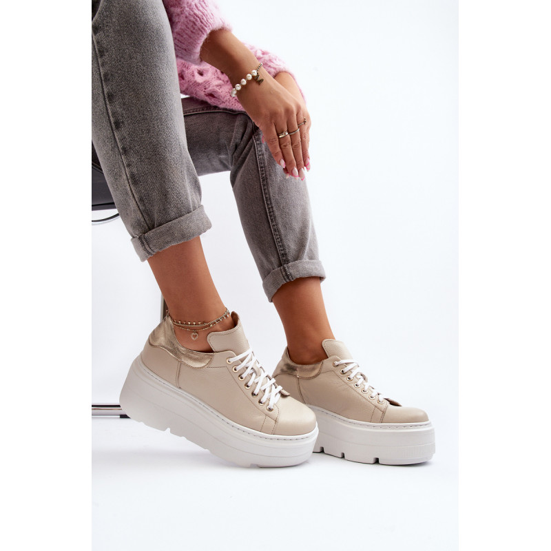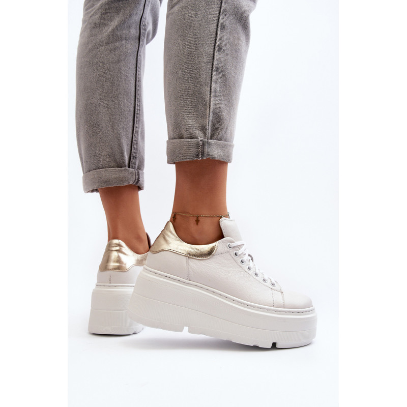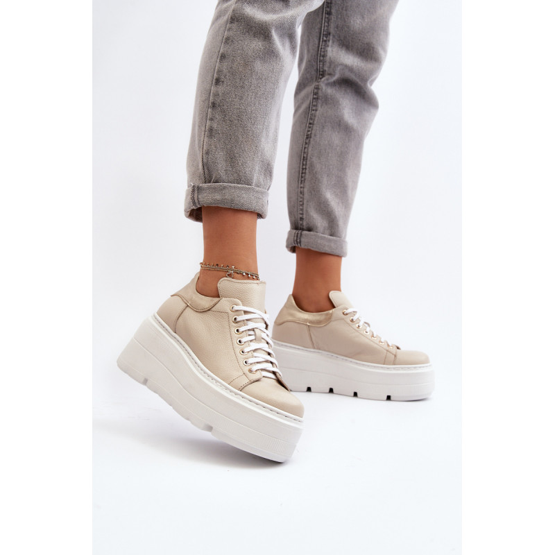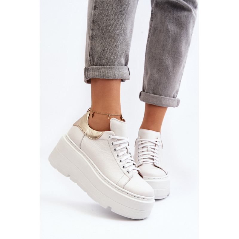 Moteriški sportiniai batai iš natūralios odos. Masyvi platforma daro juos itin stilingus. Odinis vidpadis suteikia komforto naudojimo metu. Suapvalinti kojų pirštai. Puikiai tinka kasdienei stilizacijai! Rinkdamiesi dydį, žiūrėkite dydžių lentelę.