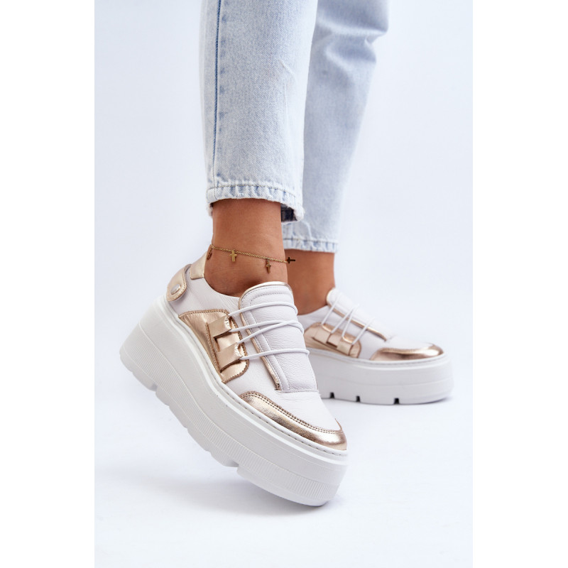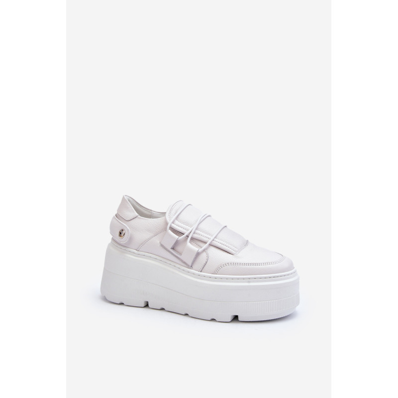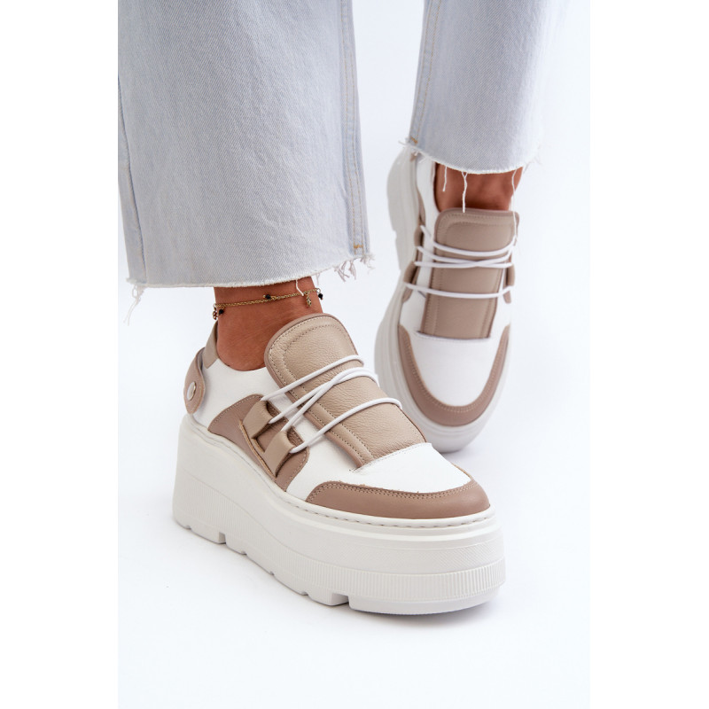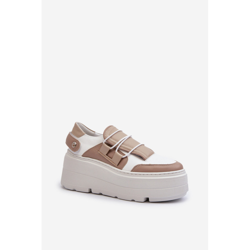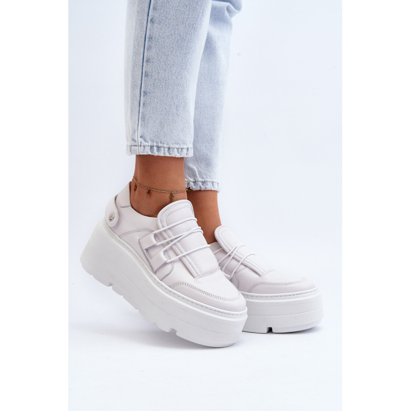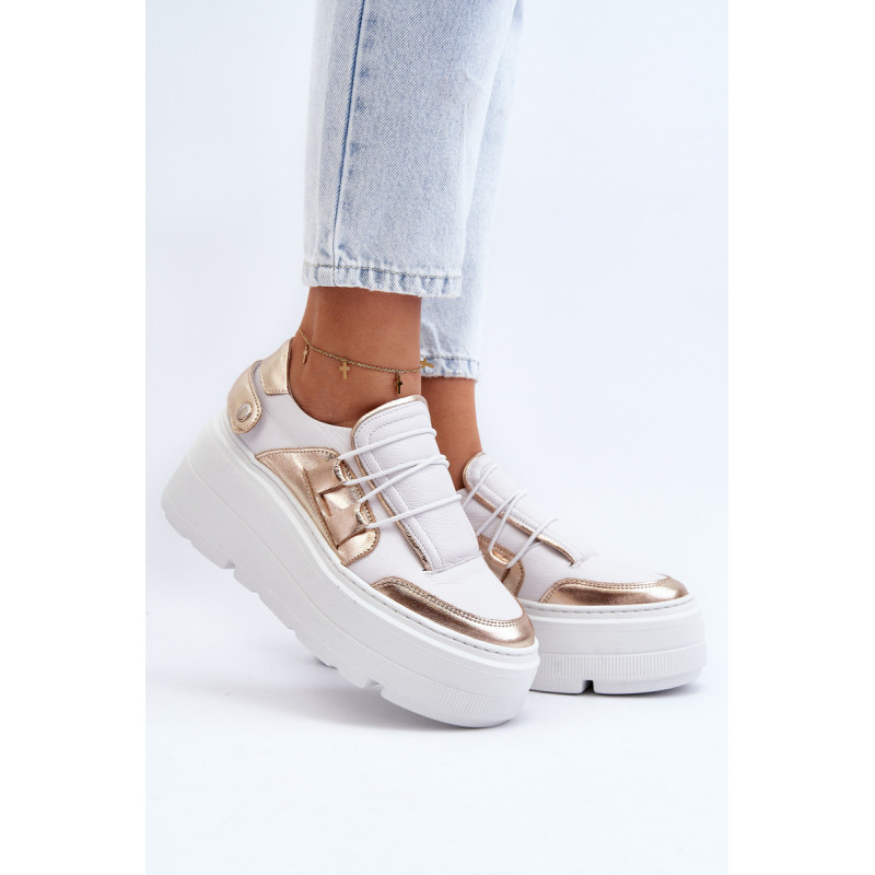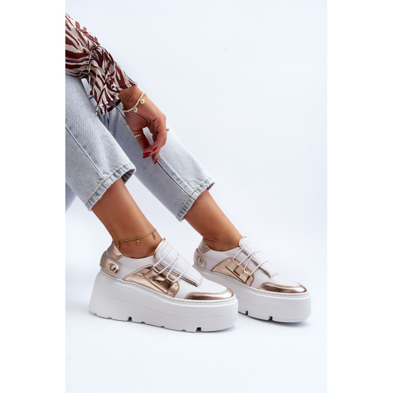 Moteriški sportiniai batai iš natūralios odos. Masyvi platforma daro juos itin stilingus. Odinis vidpadis suteikia komforto naudojimo metu. Suapvalinti kojų pirštai. Puikiai tinka kasdienei stilizacijai! Rinkdamiesi dydį, žiūrėkite dydžių lentelę.