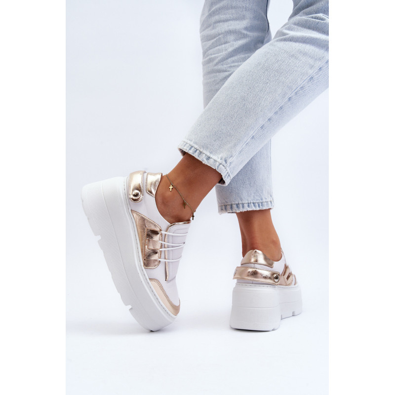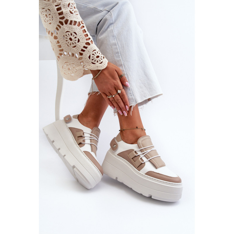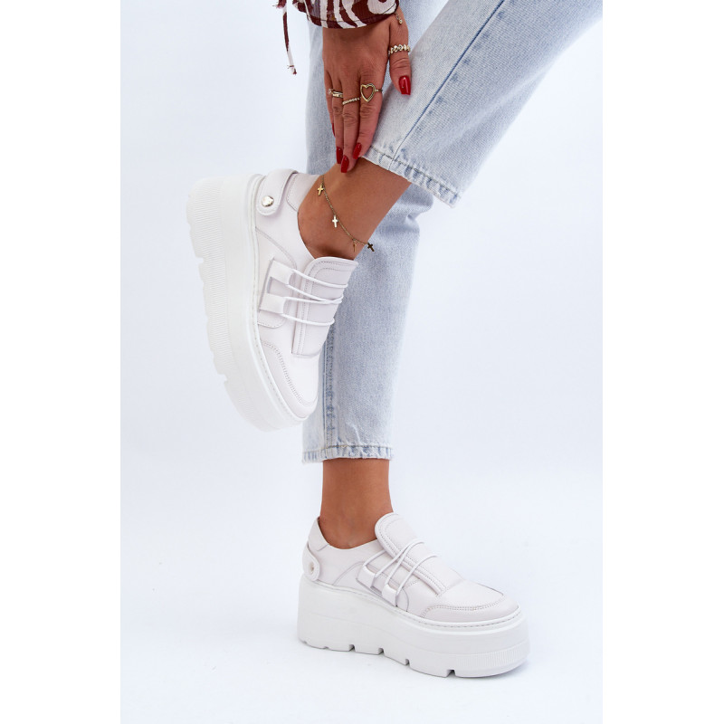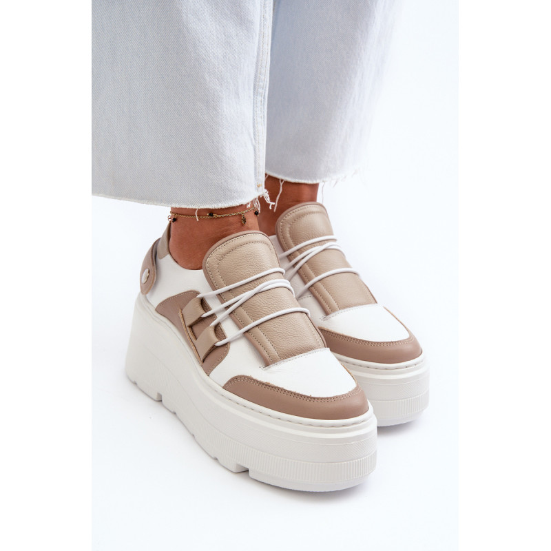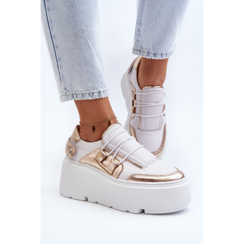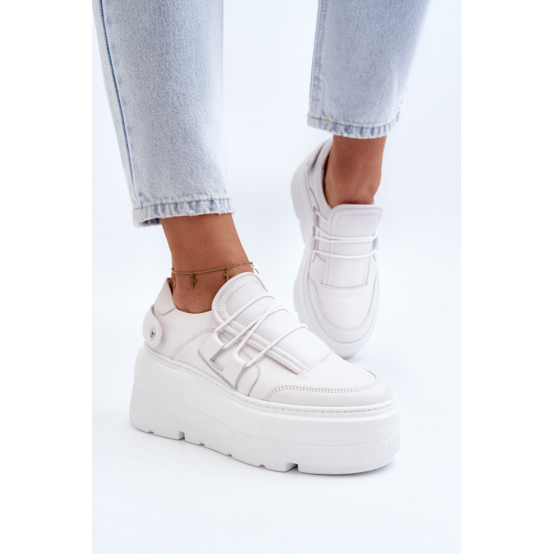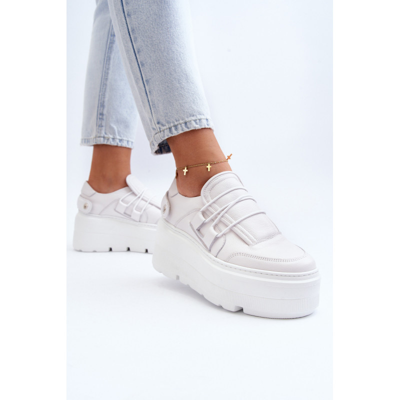 Moteriški sportiniai batai iš natūralios odos. Masyvi platforma daro juos itin stilingus. Odinis vidpadis suteikia komforto naudojimo metu. Suapvalinti kojų pirštai. Puikiai tinka kasdienei stilizacijai! Rinkdamiesi dydį, žiūrėkite dydžių lentelę.