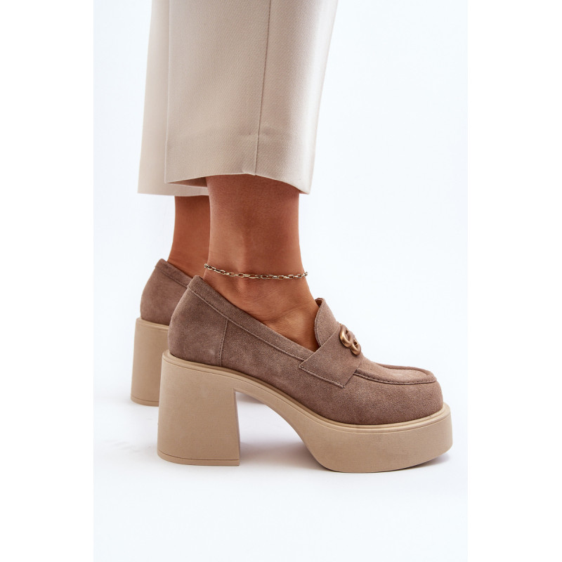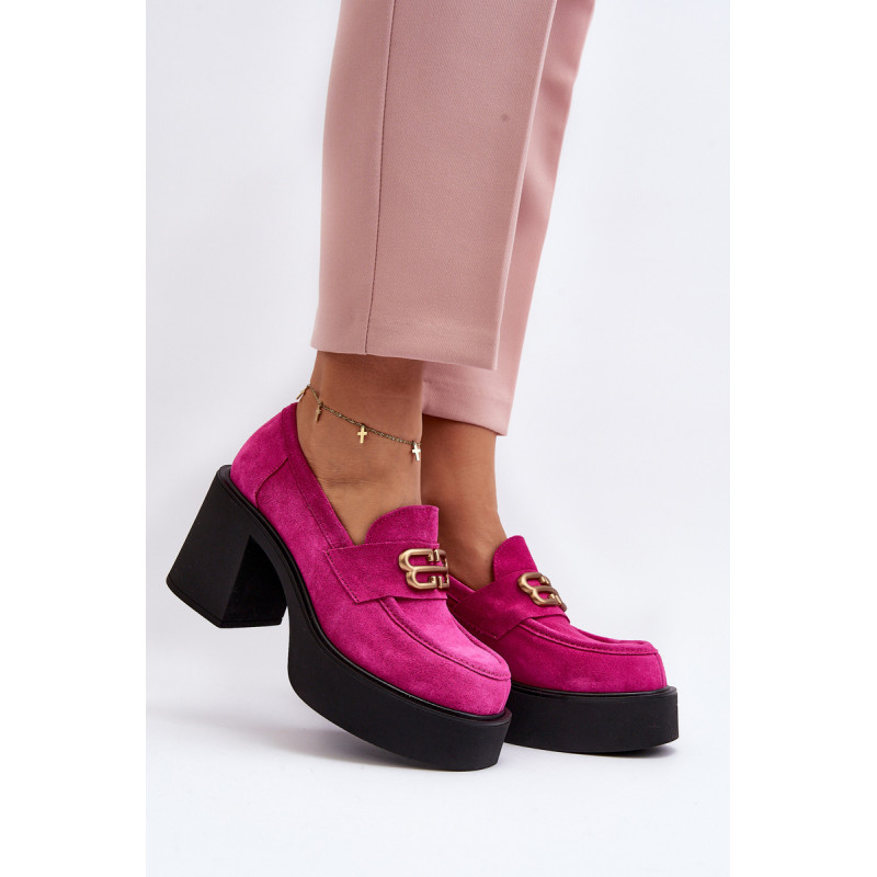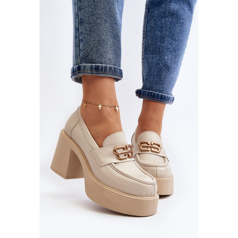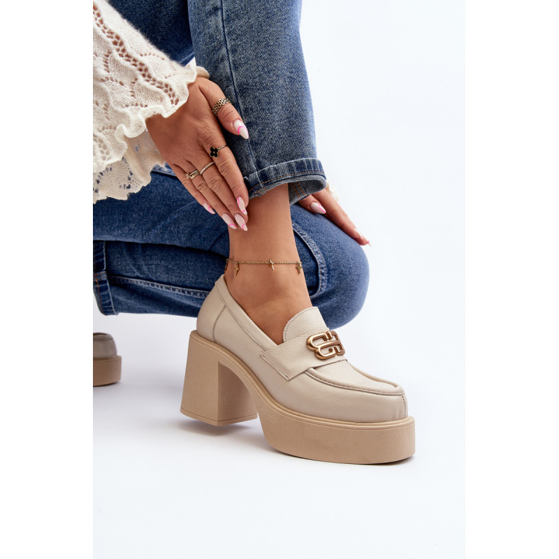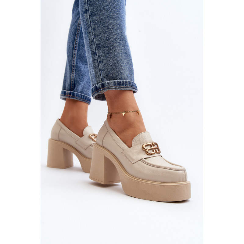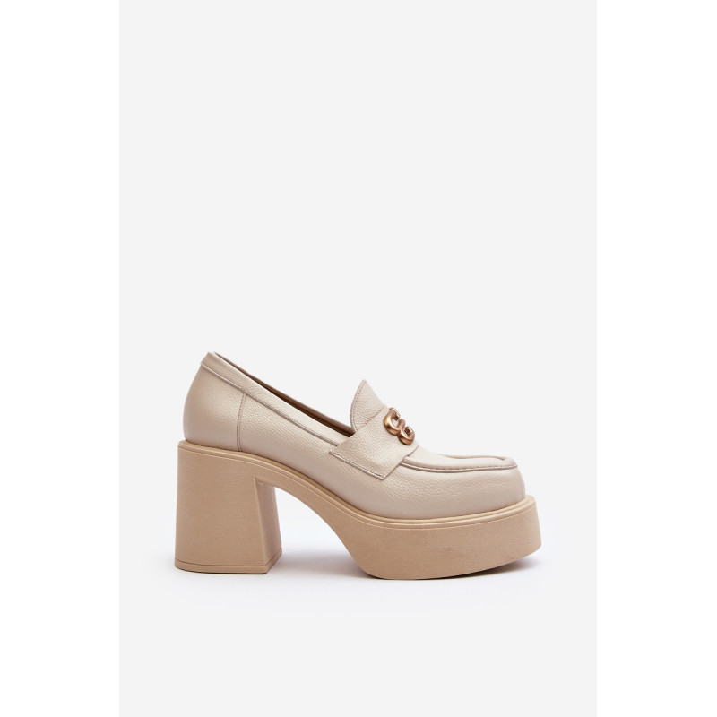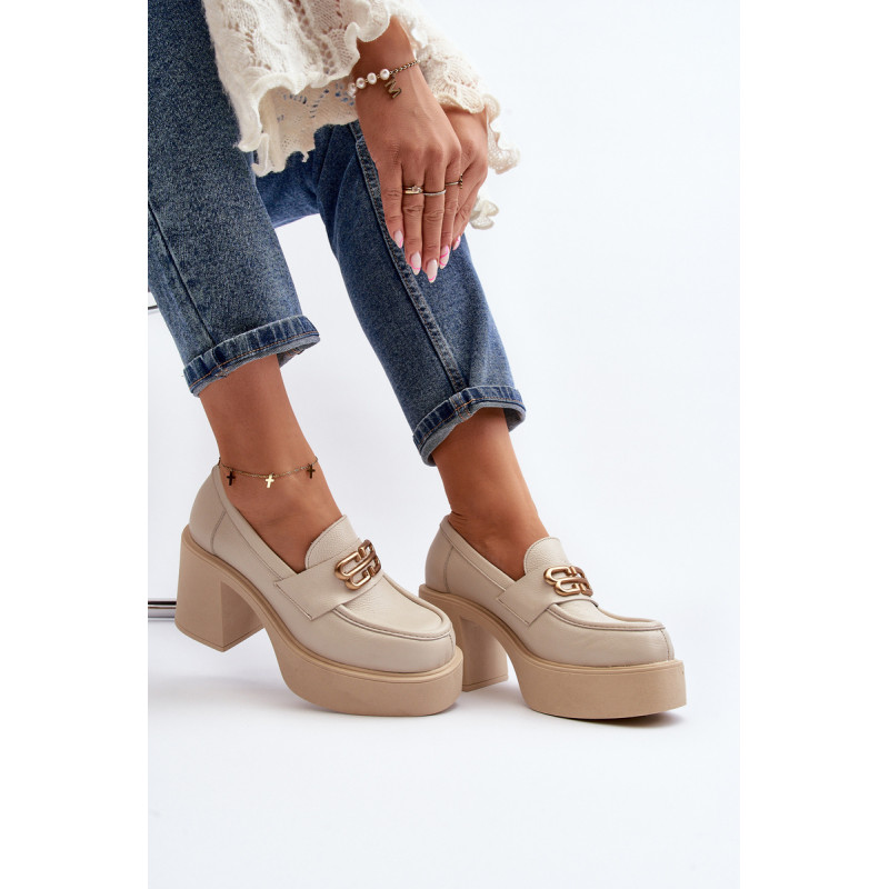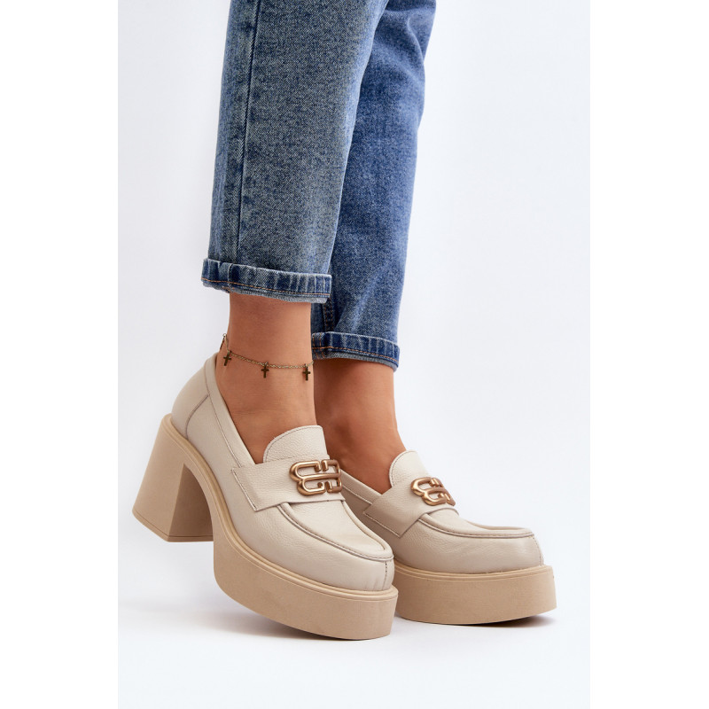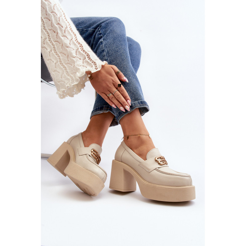 Moteriški aukštakulniai batai, kurių viršutinė dalis pagaminta iš natūralios odos. Nustatykite ant storo pado ir kulno masyvios kolonos pavidalu. Šis modelis turi apvalius pirštus. Odinis vidpadis suteiks komforto naudojimo metu. Priekyje yra dirželis ir dekoracija. Rinkdamiesi dydį žiūrėkite dydžių lentelę.