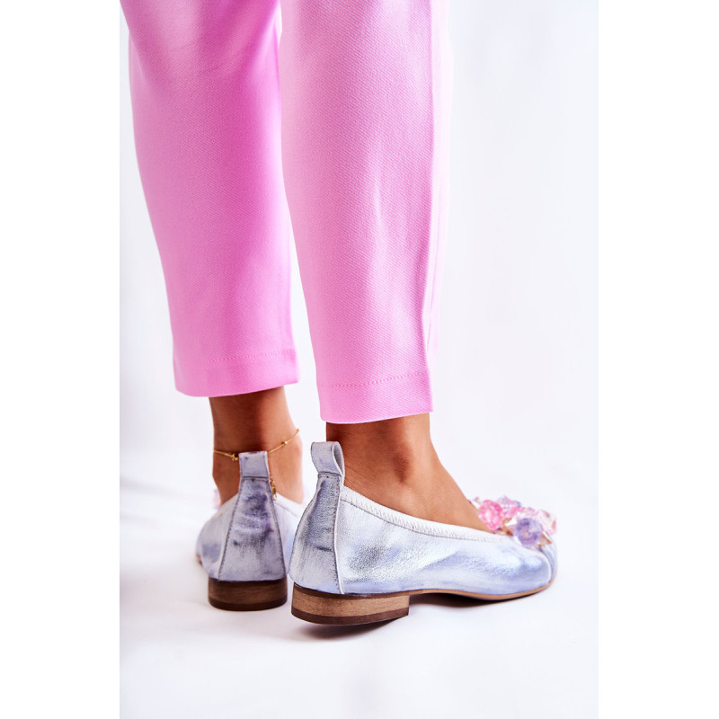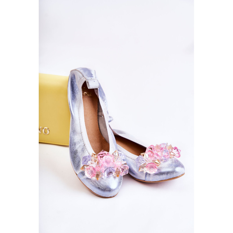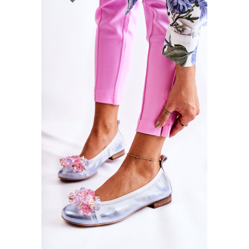 Moteriškos balerinos iš aukštos kokybės natūralios odos. Jie turi šiek tiek suapvalintą pirštą. Užsegamas modelis su raišteliu. Jie montuojami ant žemo, plokščio kulno. Priekyje yra krištolo formos ornamentas. Vidpadis iš natūralios odos yra minkštas ir patogus naudoti. Komfortas garantuotas! Šį modelį tikrai turėtumėte turėti savo garderobe! Renkantis dydį, naudokite dydžių lentelę.