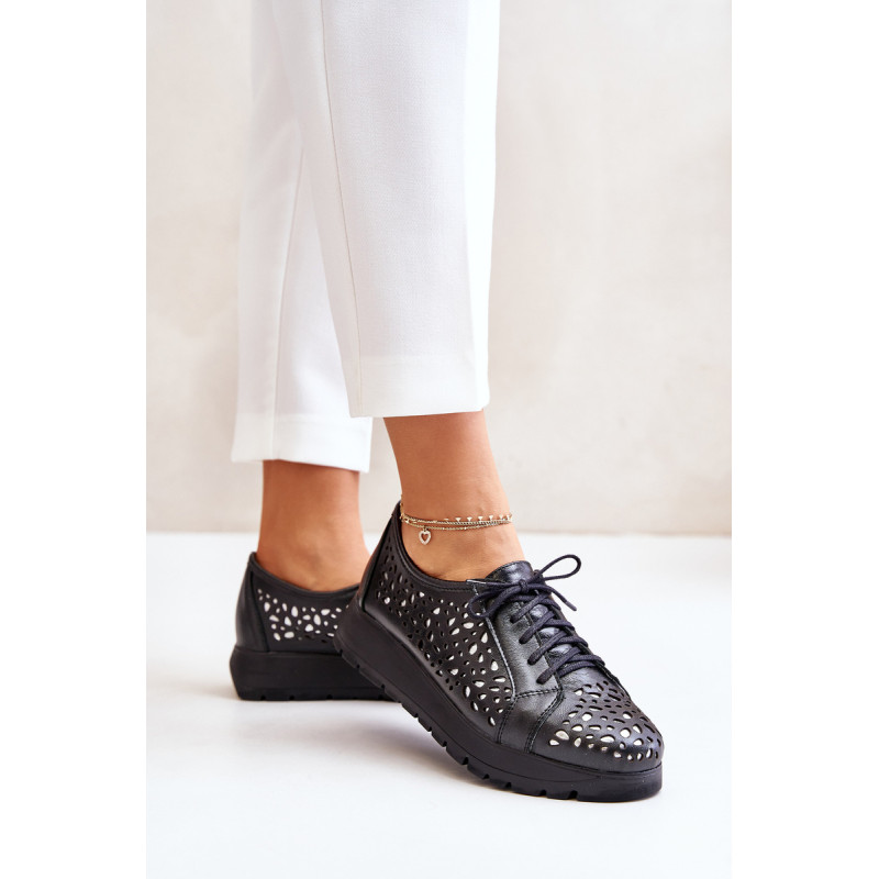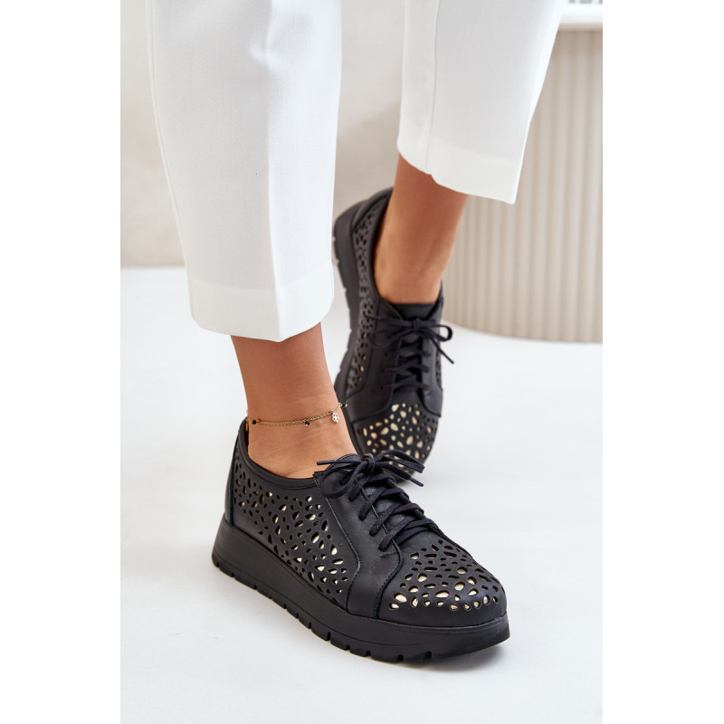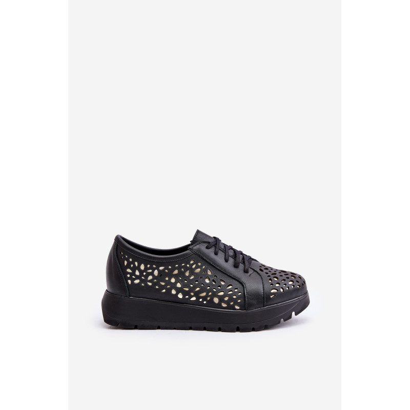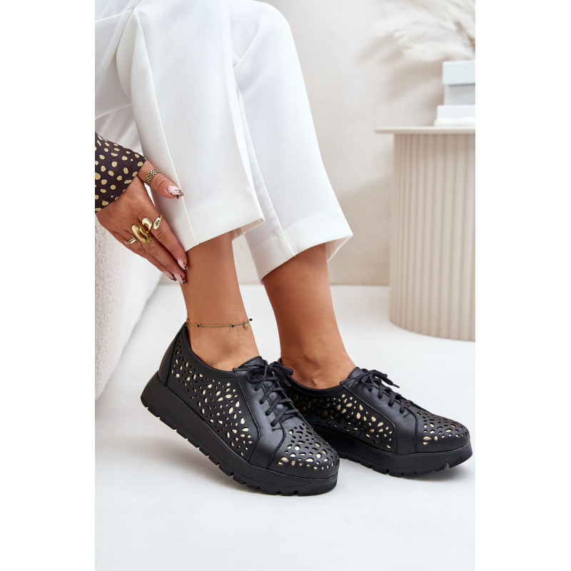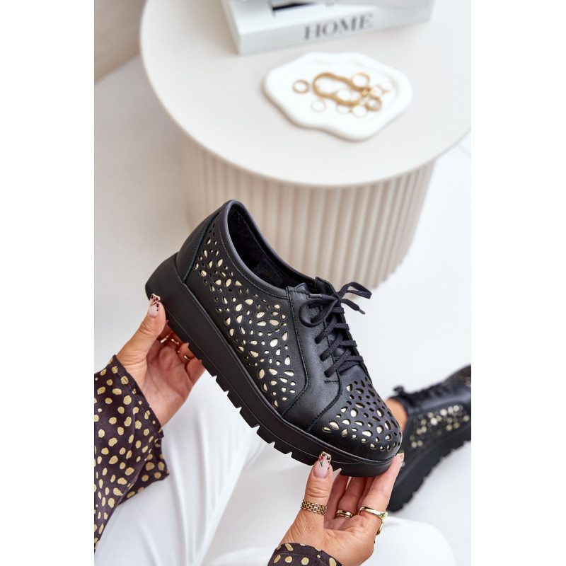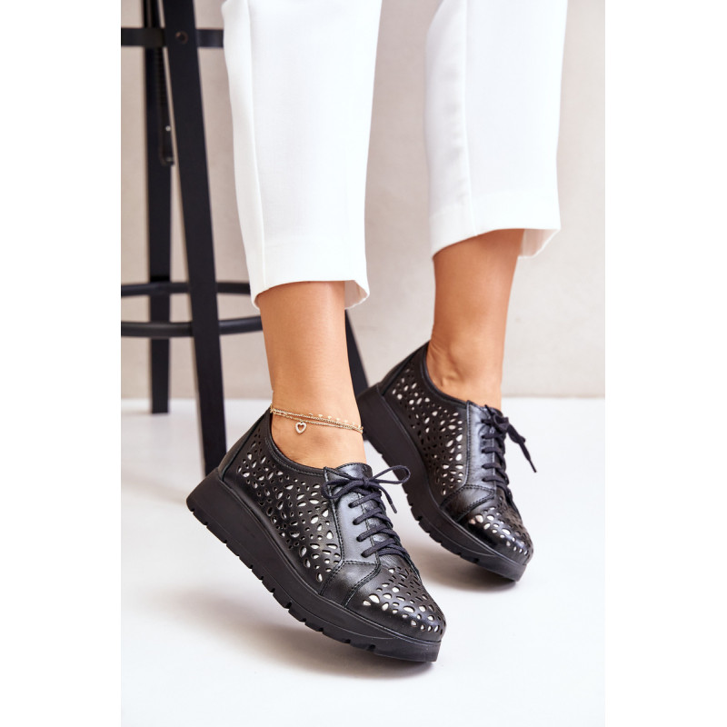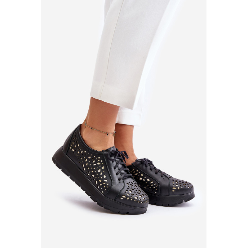 Moteriški batai, pagaminti iš natūralios odos, pastatyti ant platformos, kad būtų patogiau. Pirštai suapvalinti. Viršus puoštas ažūriniu raštu, kuris suteikia lengvumo ir stiliaus. Šie batai, puikiai tinkantys įvairiems stiliams, puikiai papildys bet kokį garderobą, suteikdami madingą ir patogią išvaizdą kasdienai. Rinkdamiesi dydį, žiūrėkite dydžių lentelę.