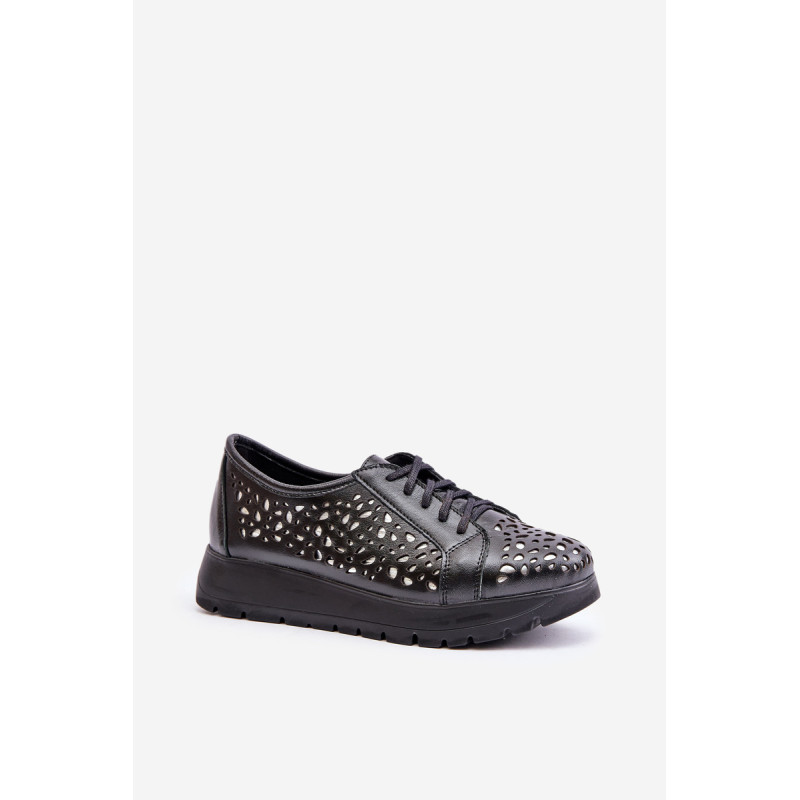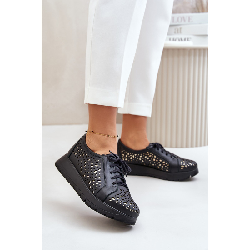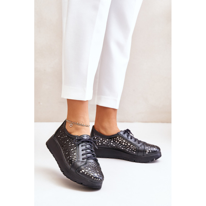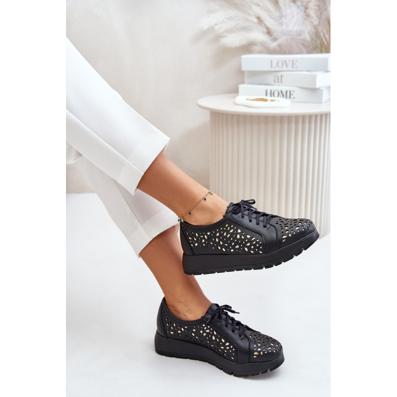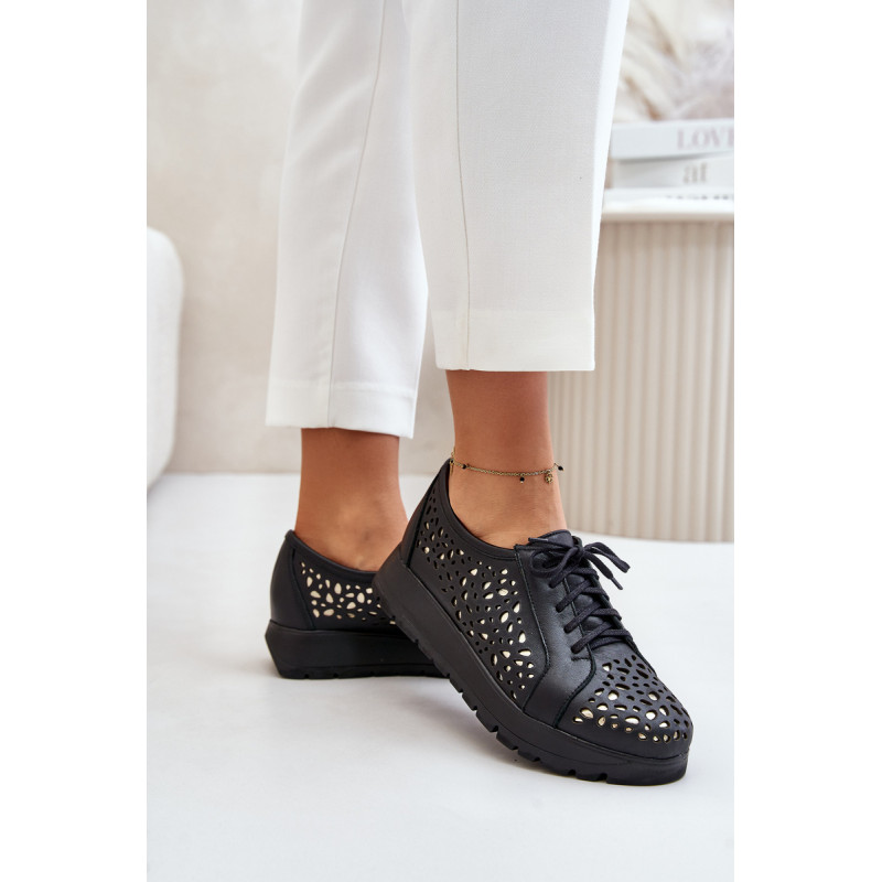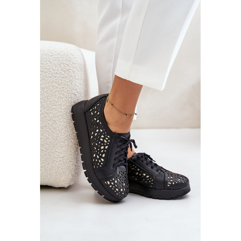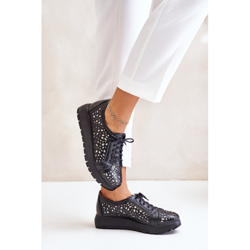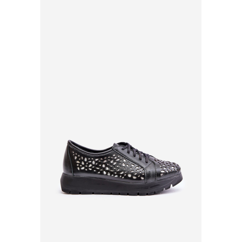 Moteriški batai, pagaminti iš natūralios odos, pastatyti ant platformos, kad būtų patogiau. Pirštai suapvalinti. Viršus puoštas ažūriniu raštu, kuris suteikia lengvumo ir stiliaus. Šie batai, puikiai tinkantys įvairiems stiliams, puikiai papildys bet kokį garderobą, suteikdami madingą ir patogią išvaizdą kasdienai. Rinkdamiesi dydį, žiūrėkite dydžių lentelę.