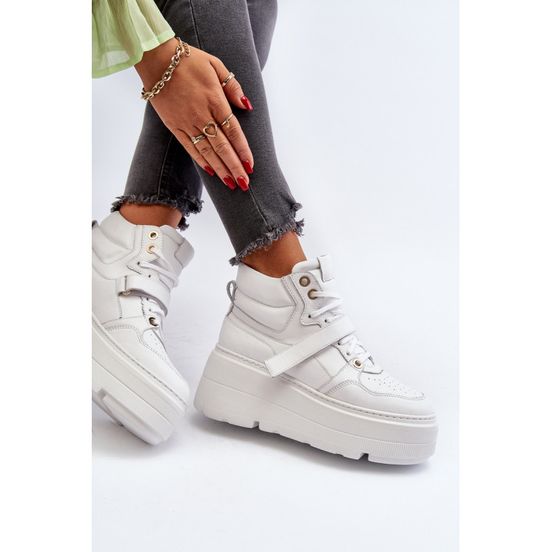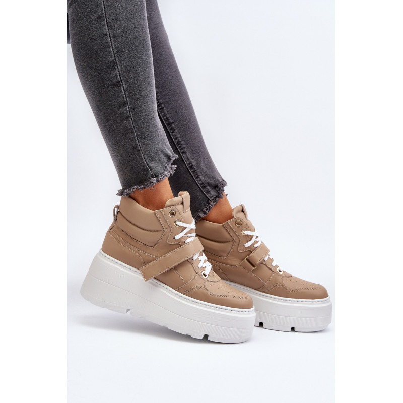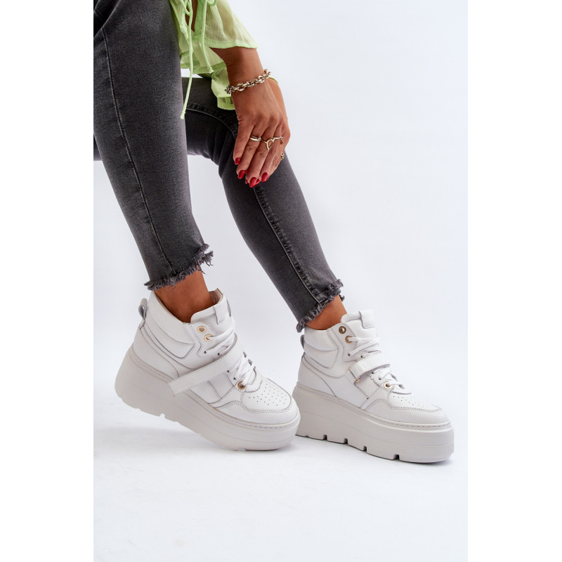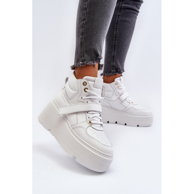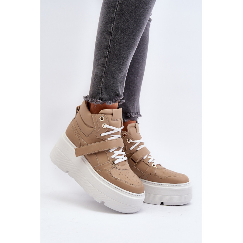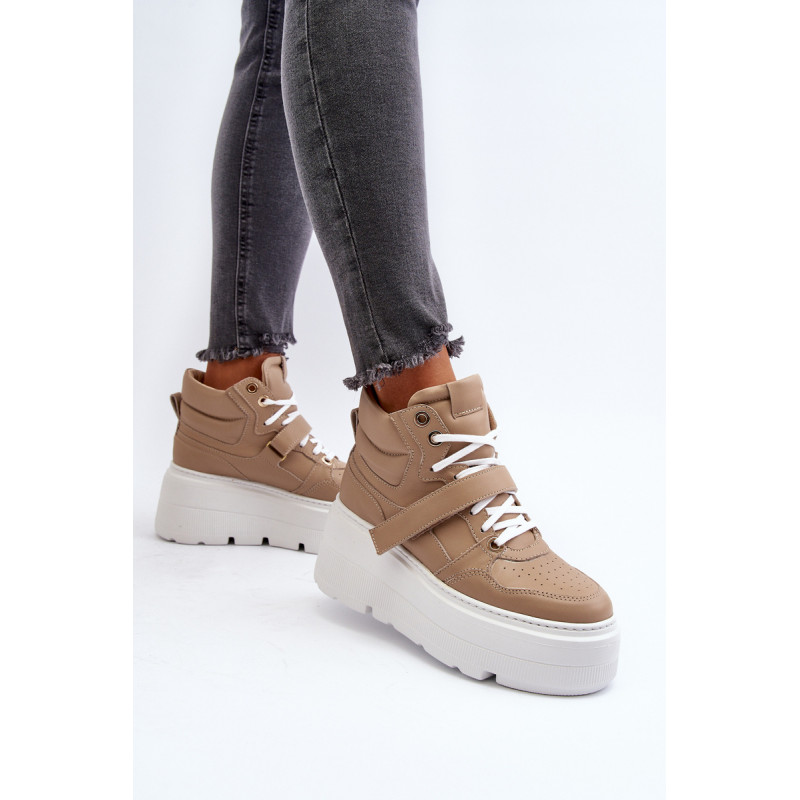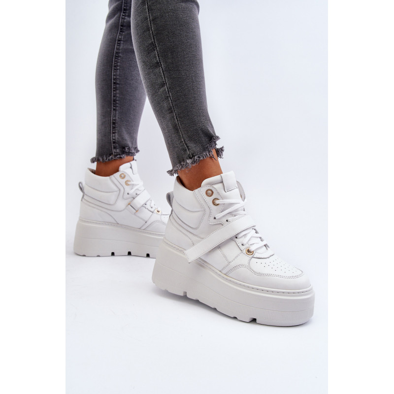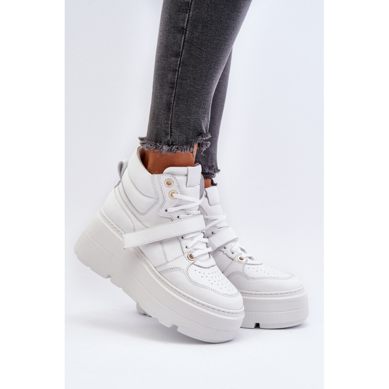 Moteriški sportbačiai, pagaminti iš aukštos kokybės natūralios odos. Suvarstymas, praturtintas papildomu Velcro užsegimu, užtikrina puikų prigludimą prie pėdos, suteikia stabilumo einant. Platforma ne tik suteikia charakterio visam stiliui, bet ir suteikia stabilumo bei komforto einant. Šie sportbačiai, puikiai tinkantys pasivaikščiojimui po miestą ir vakarui su draugais, yra nepakeičiamas kiekvienos madingos moters drabužių spintos elementas. Rinkdamiesi dydį, žiūrėkite dydžių lentelę.