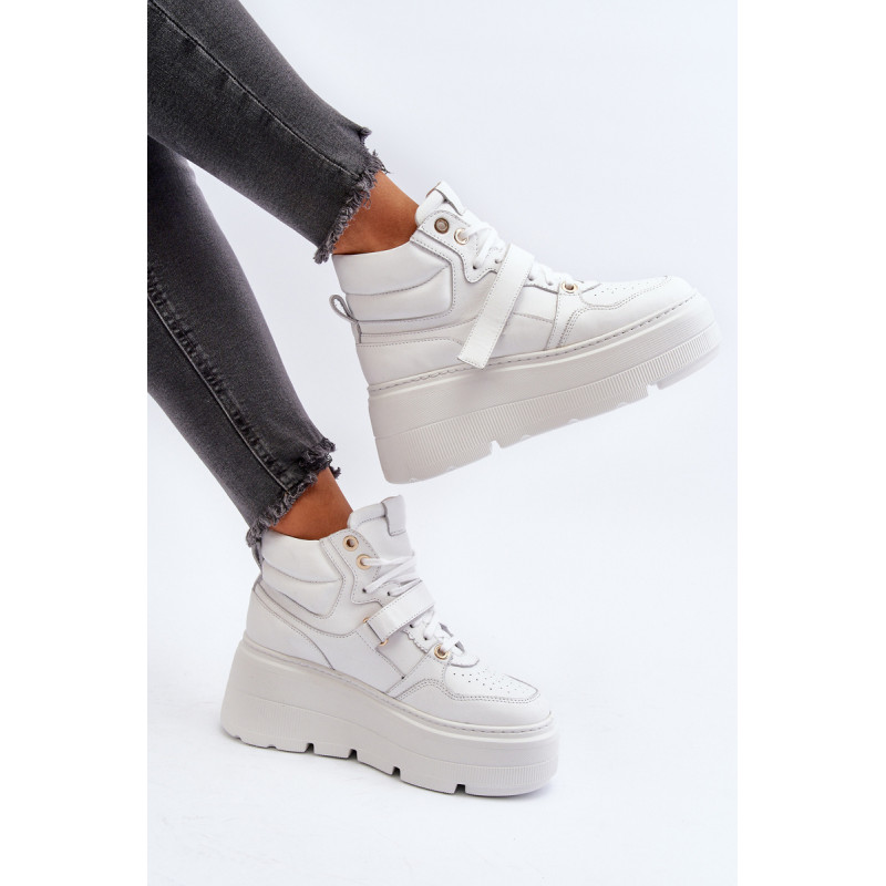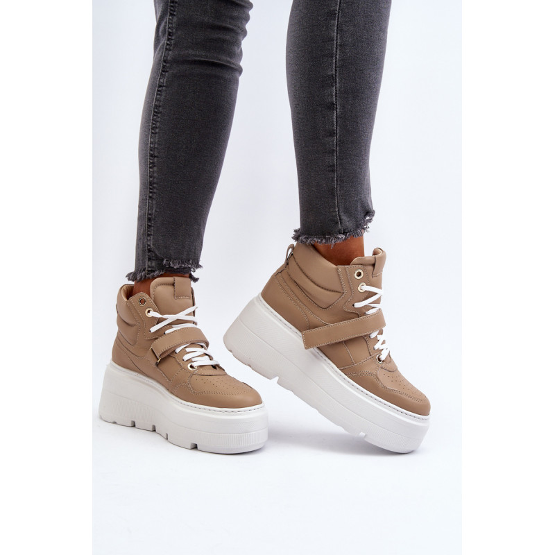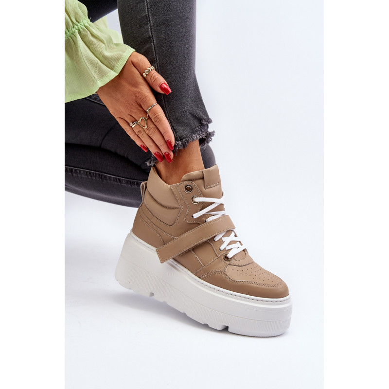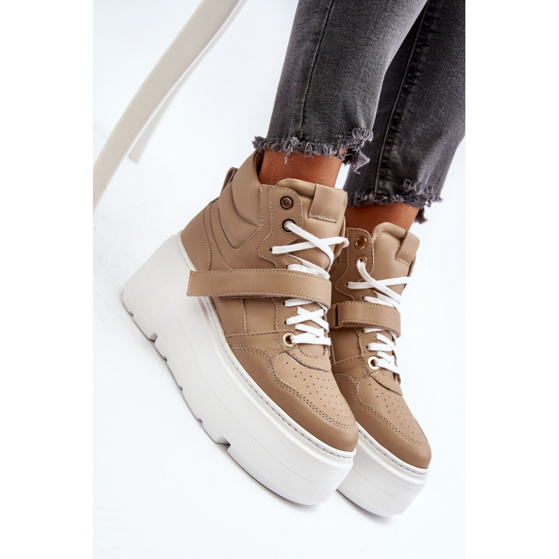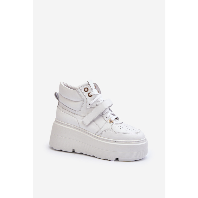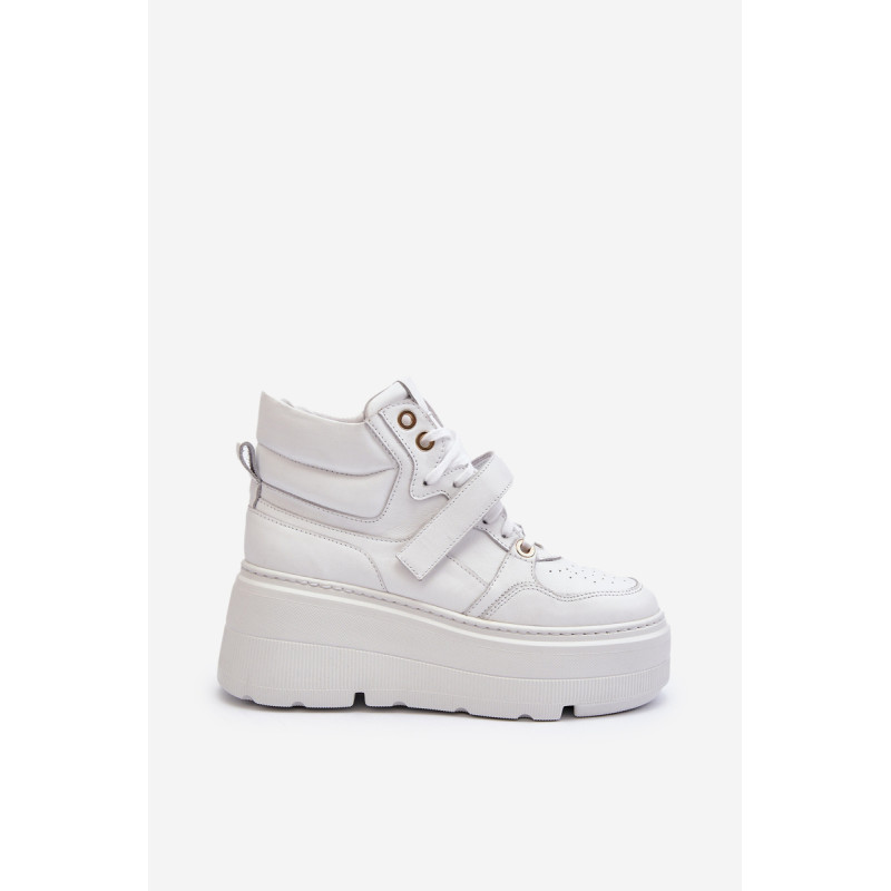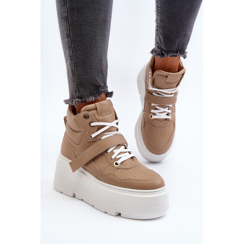 Moteriški sportbačiai, pagaminti iš aukštos kokybės natūralios odos. Suvarstymas, praturtintas papildomu Velcro užsegimu, užtikrina puikų prigludimą prie pėdos, suteikia stabilumo einant. Platforma ne tik suteikia charakterio visam stiliui, bet ir suteikia stabilumo bei komforto einant. Šie sportbačiai, puikiai tinkantys pasivaikščiojimui po miestą ir vakarui su draugais, yra nepakeičiamas kiekvienos madingos moters drabužių spintos elementas. Rinkdamiesi dydį, žiūrėkite dydžių lentelę.