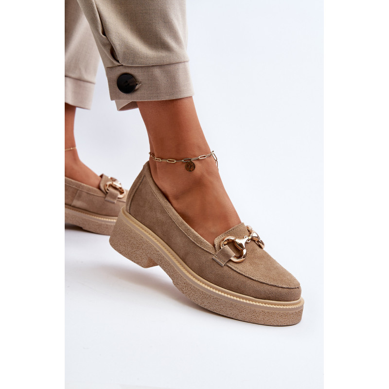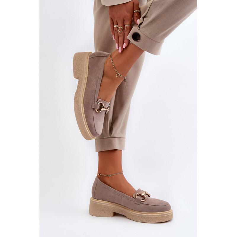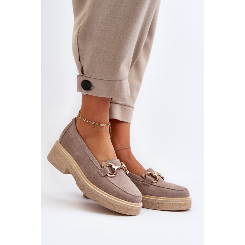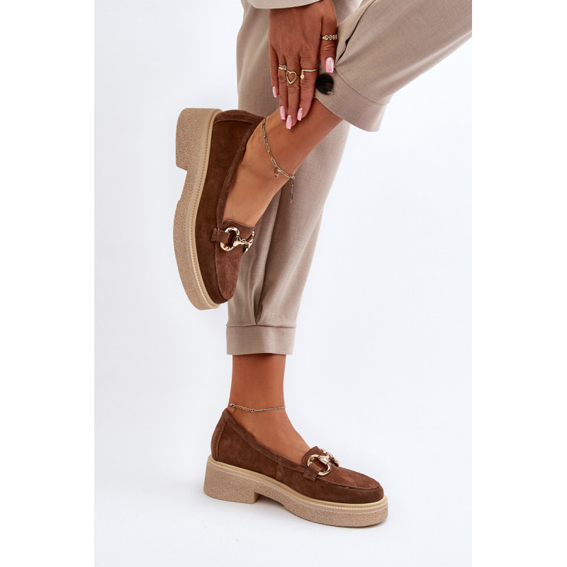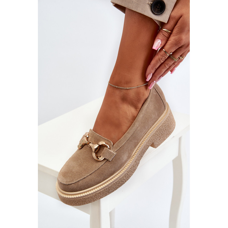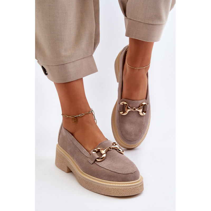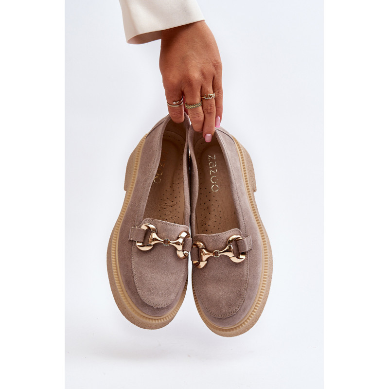 Šie elegantiški moteriški mokasinai iš natūralios zomšos yra ne tik išskirtinai stilingi, bet ir nepaprastai patogūs. Jų priekį puošia auksinė puošyba, kuri suteikia joms prabangos ir elegancijos. Nustatykite ant platformos ir plokščio kulno. Profiliuotas vidpadis suteiks komforto naudojimo metu. Itin madingas dizainas, kurį galite naudoti daugeliui stilių! Rinkdamiesi dydį žiūrėkite dydžių lentelę.