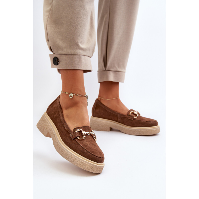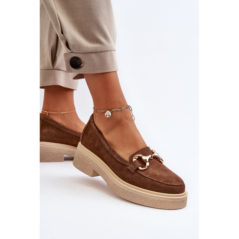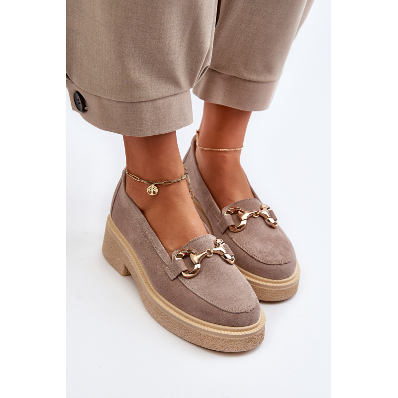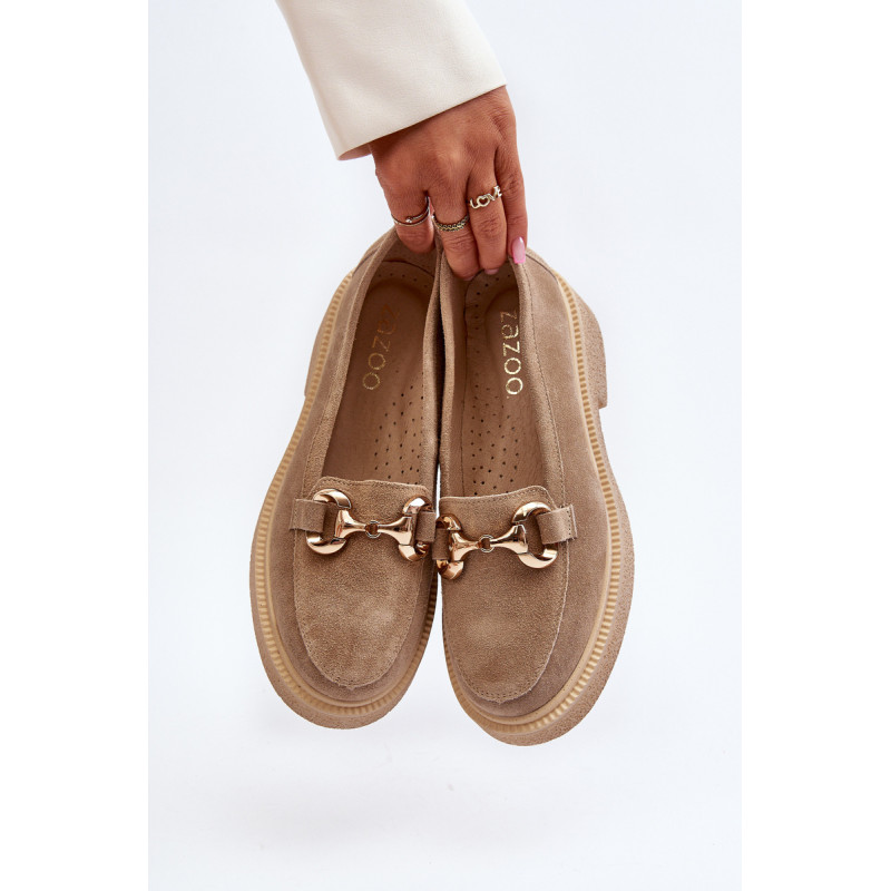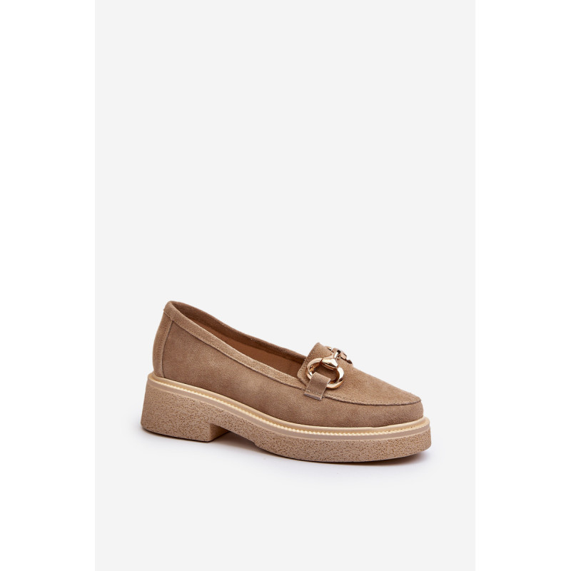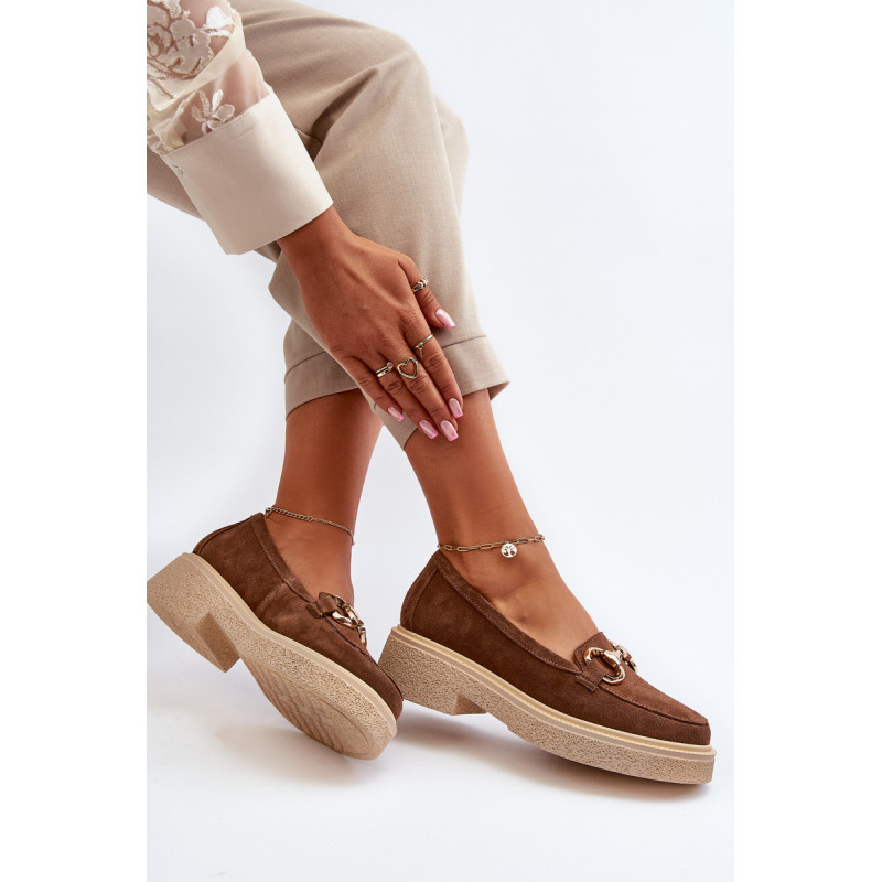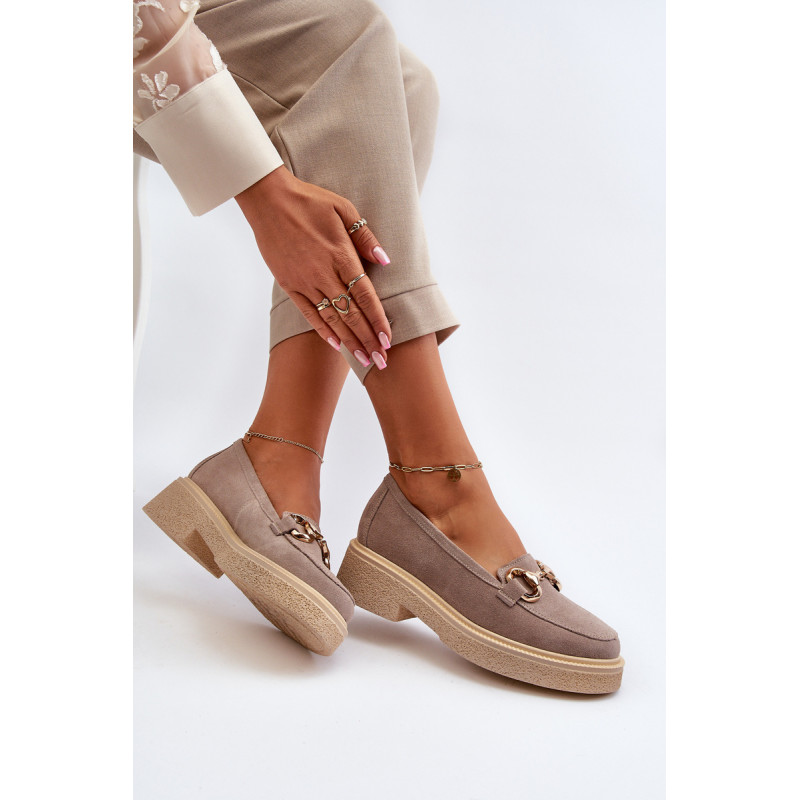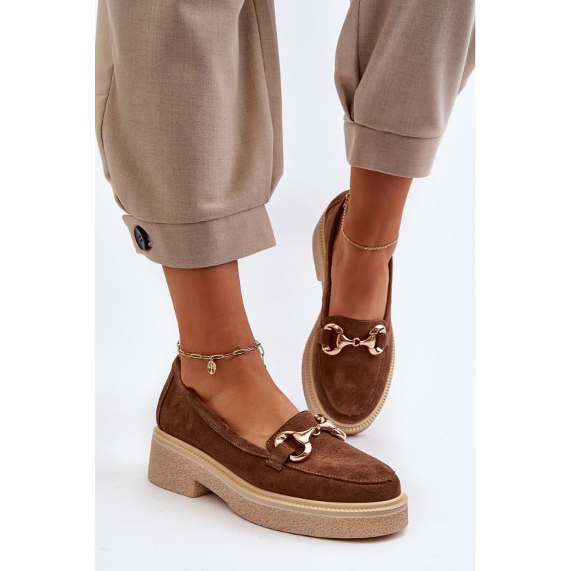 Šie elegantiški moteriški mokasinai iš natūralios zomšos yra ne tik išskirtinai stilingi, bet ir nepaprastai patogūs. Jų priekį puošia auksinė puošyba, kuri suteikia joms prabangos ir elegancijos. Nustatykite ant platformos ir plokščio kulno. Profiliuotas vidpadis suteiks komforto naudojimo metu. Itin madingas dizainas, kurį galite naudoti daugeliui stilių! Rinkdamiesi dydį žiūrėkite dydžių lentelę.