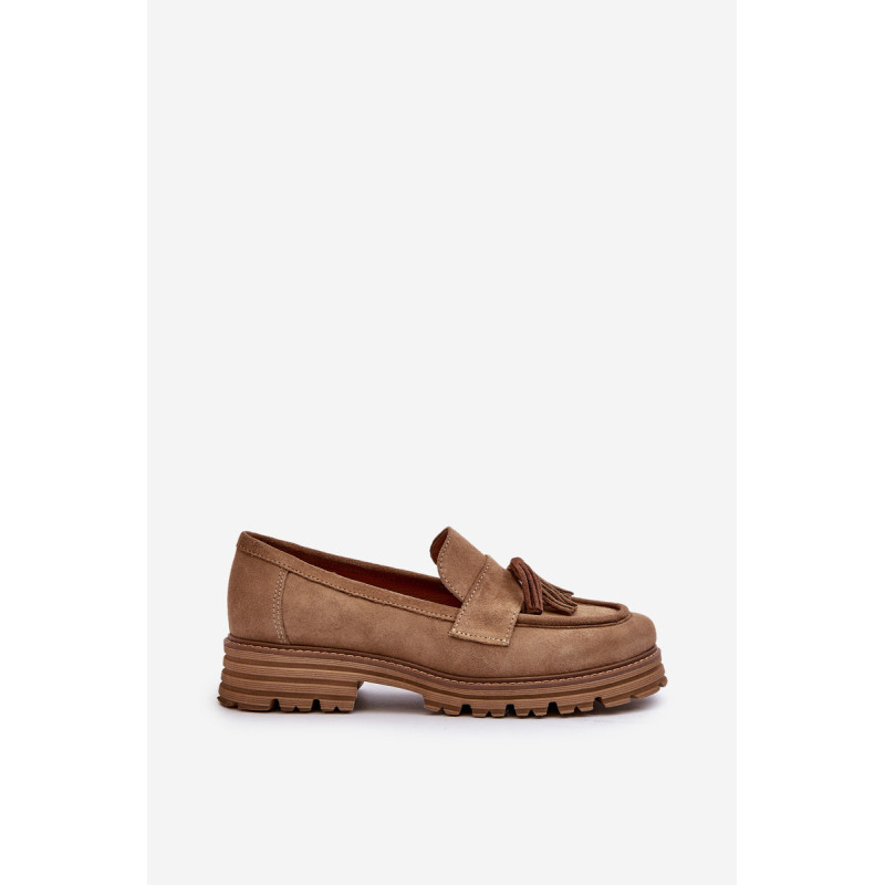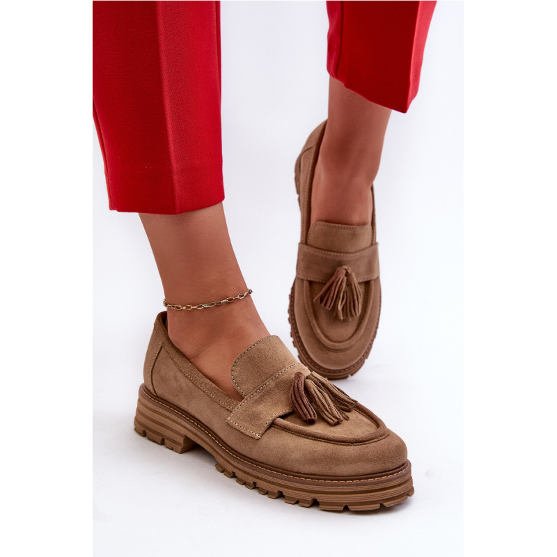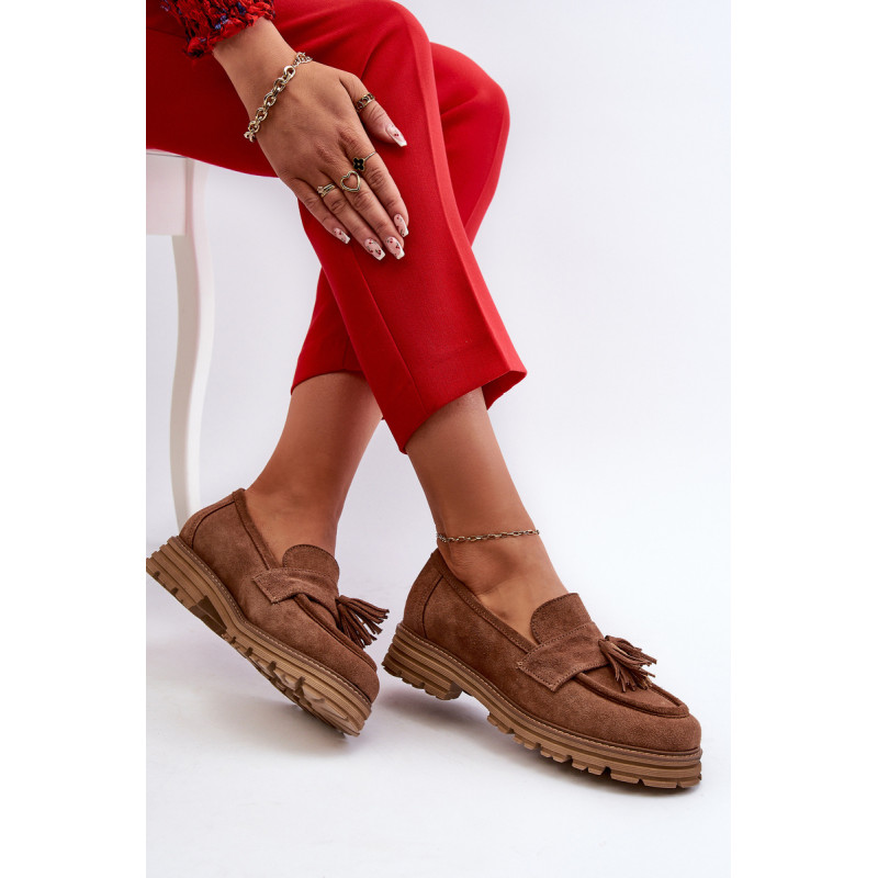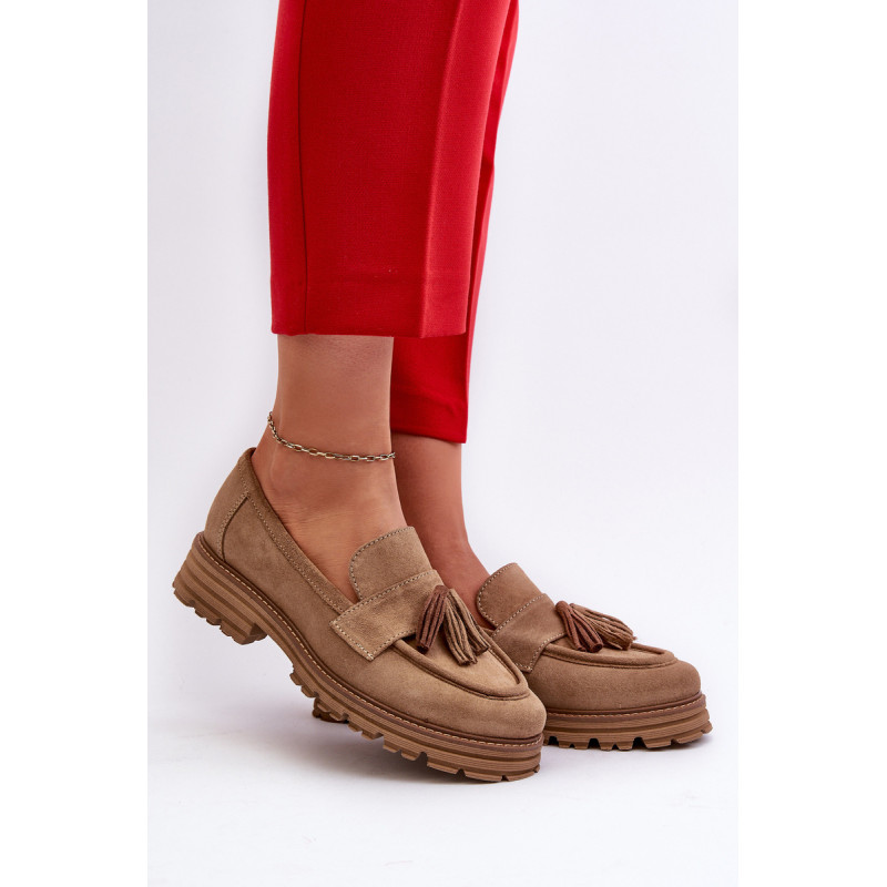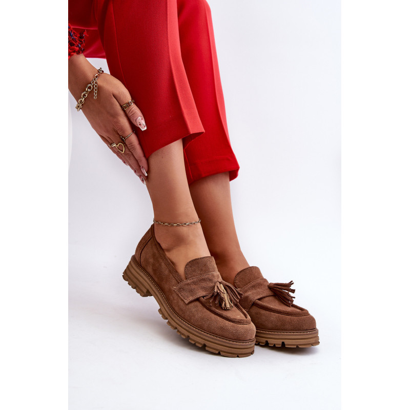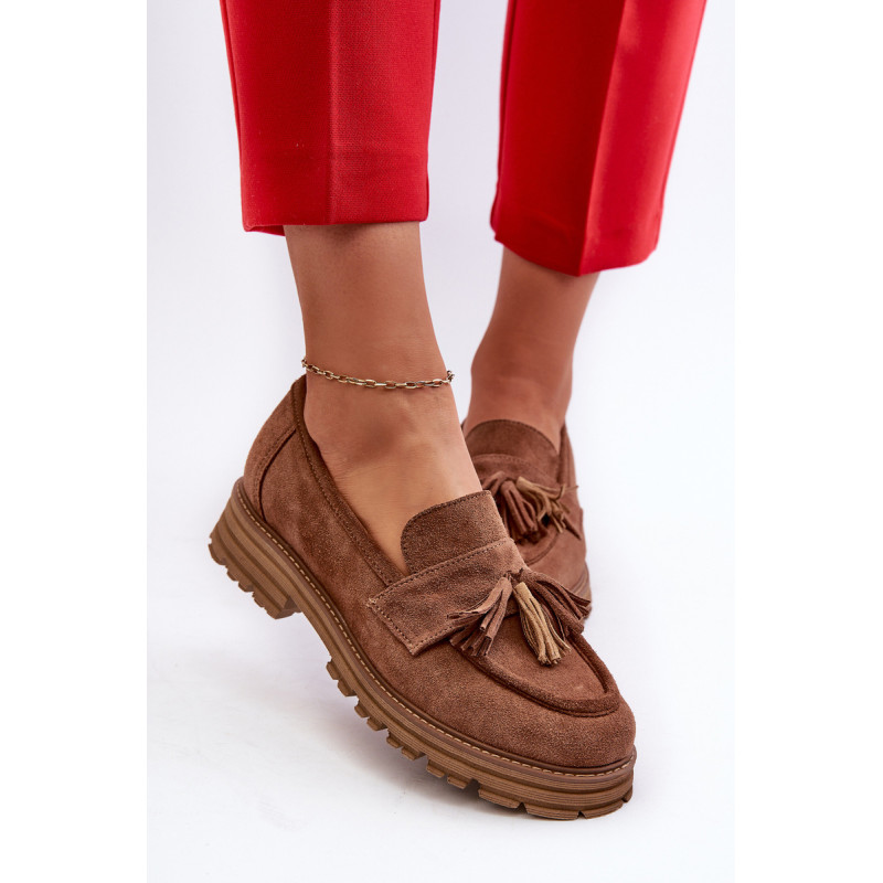 Moteriški mokasinai iš natūralios zomšos yra labai stilingi ir patogūs. Priekis dekoruotas kutais. Nustatyti ant platformos ir plokščio kulno, suteikiančio pasitikėjimo einant. Lengvos profiliuotos odos vidpadis užtikrins komfortą. Madingas stilius, kuris derės prie įvairių aprangų. Rinkdamiesi dydį, žiūrėkite dydžių lentelę.
