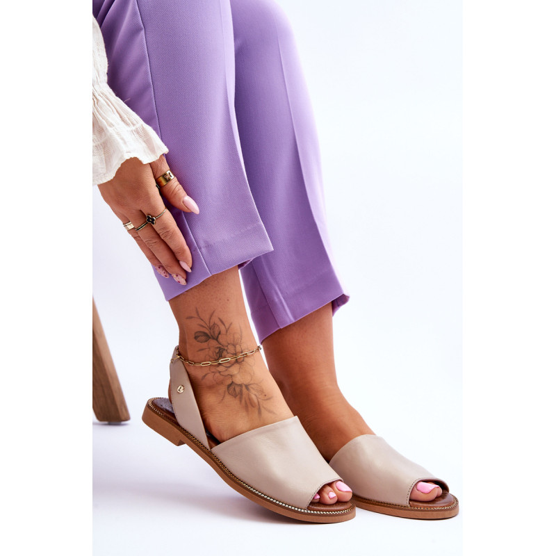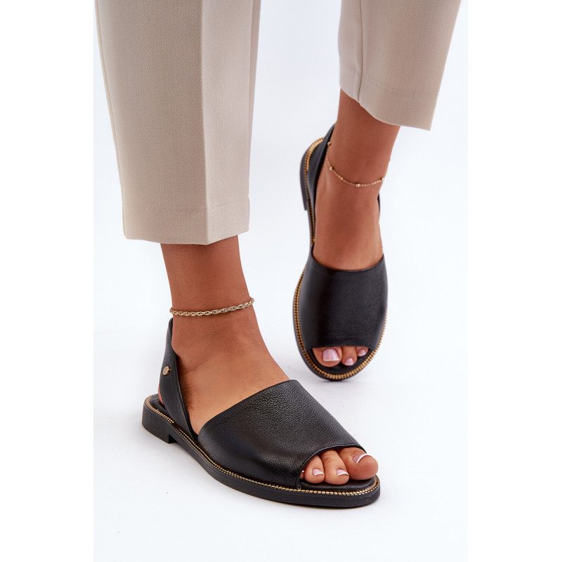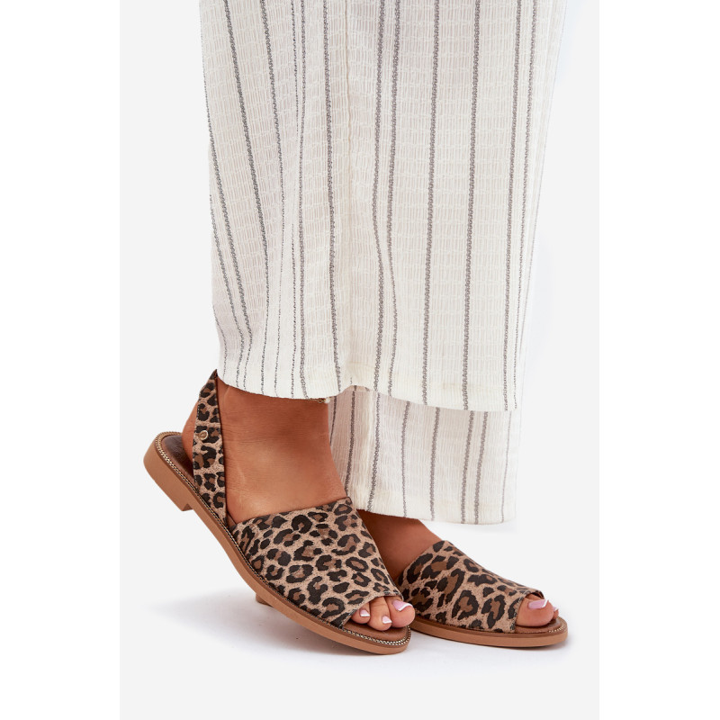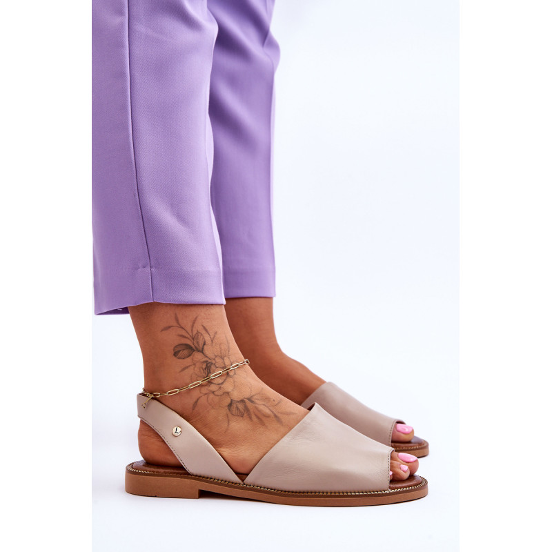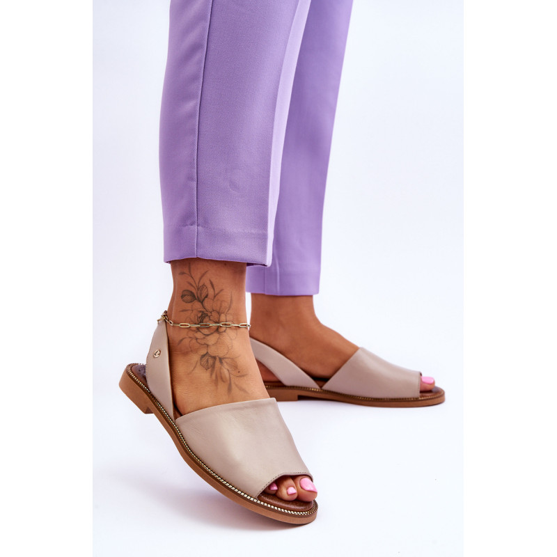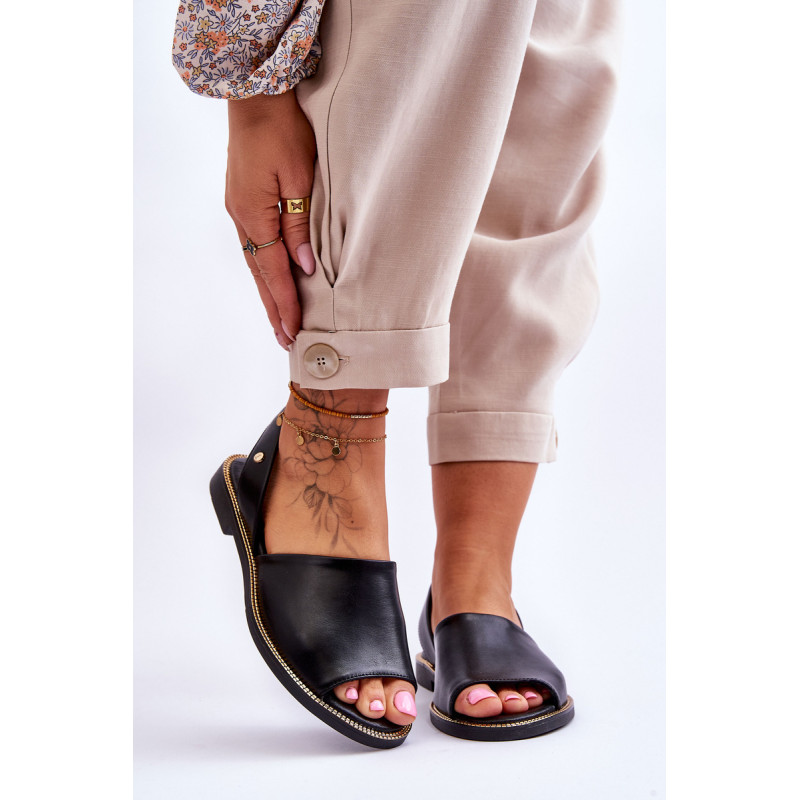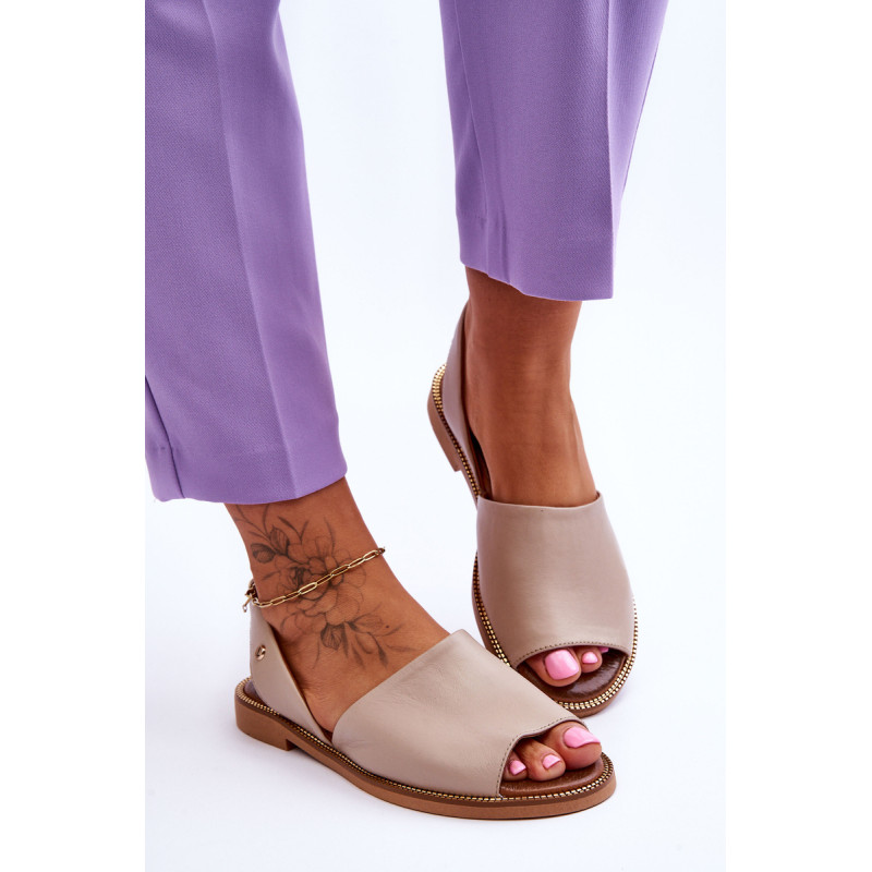 Moteriški sandalai pagaminti iš aukštos kokybės natūralios odos. Pastatas ant plokščio kulno su dekoracijomis ant pado. Sandalai turi atvirą kulną ir pirštus. Minkštas odinis vidpadis užtikrina patogų naudojimą. Sandalai yra slystantys, o užpakalinė koto dalis subtiliai sustiprinta. Rinkdamiesi dydį, vadovaukitės dydžių lentele.