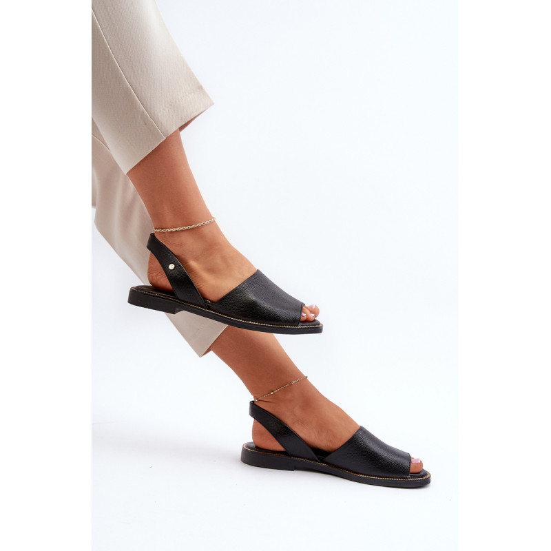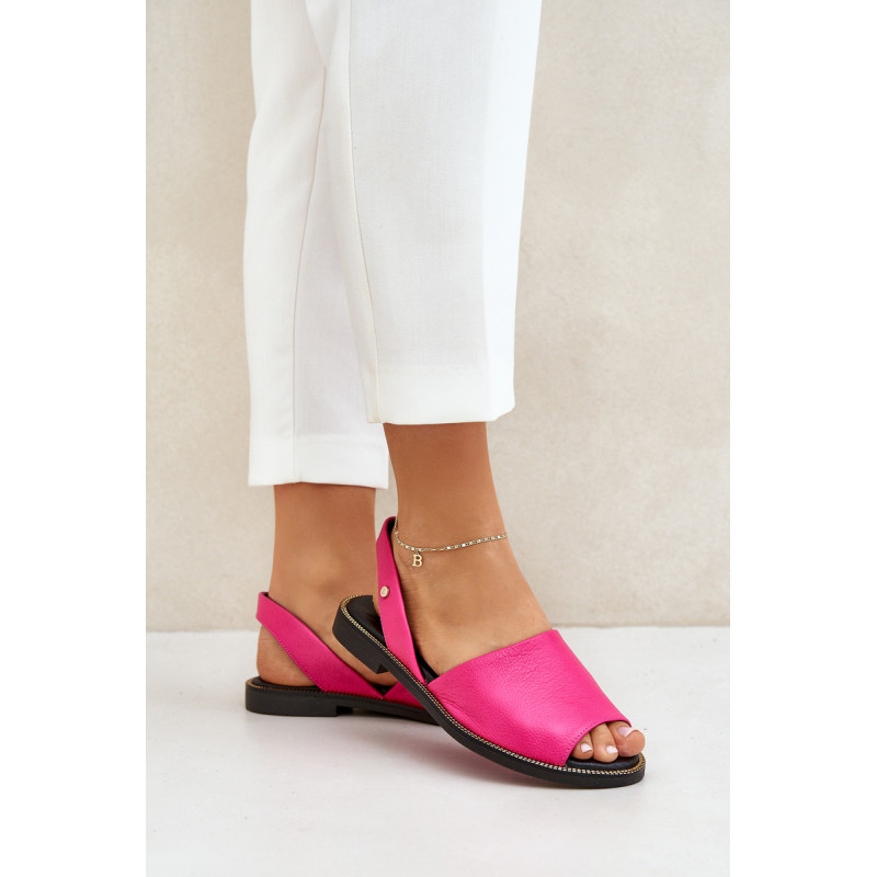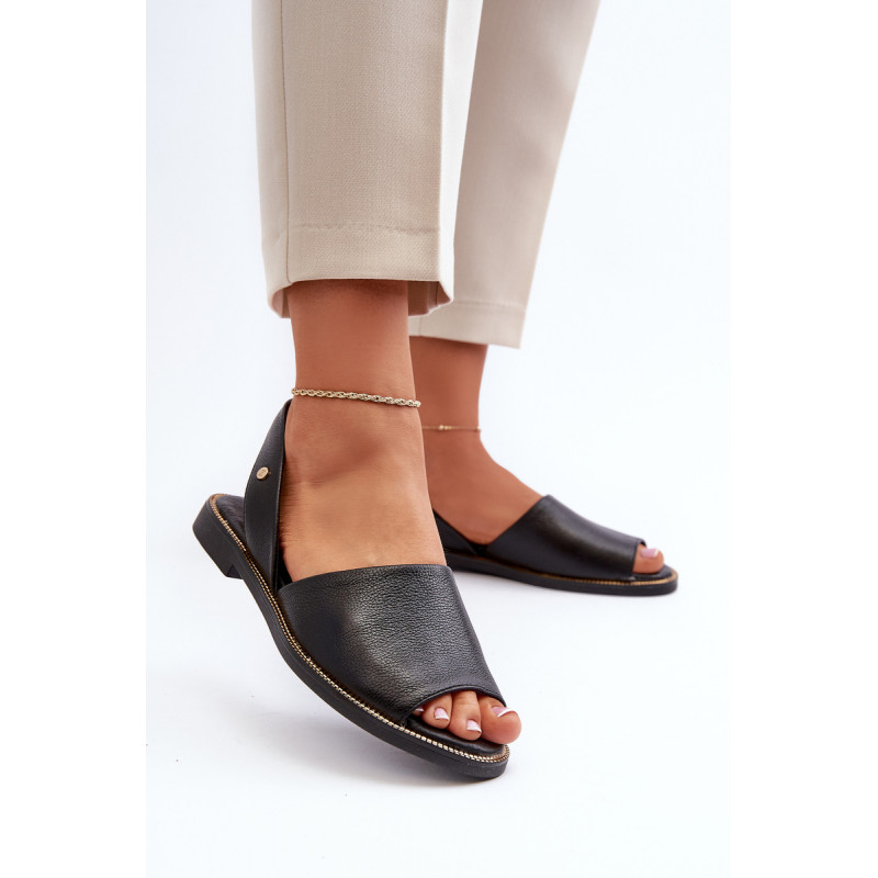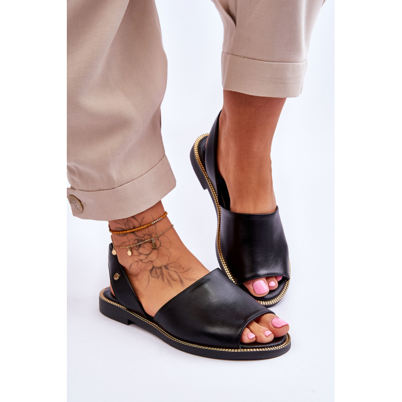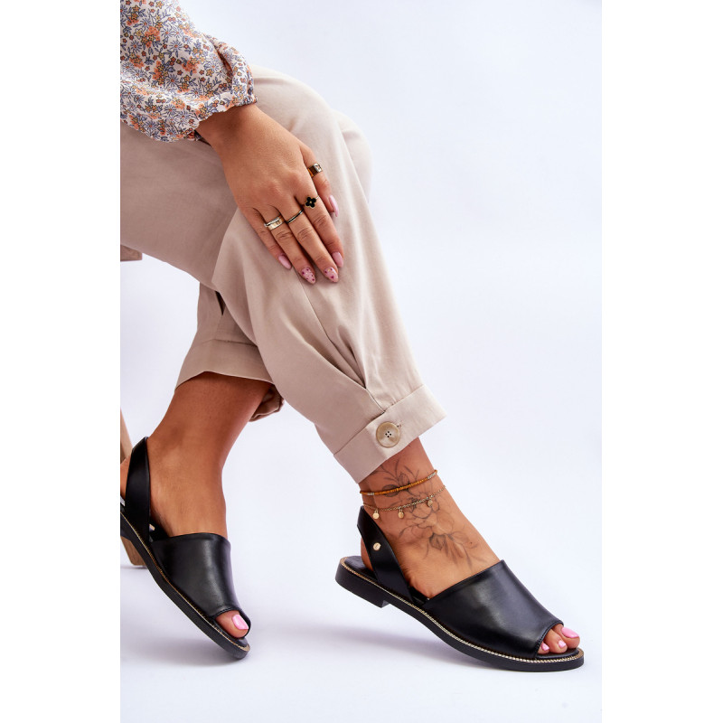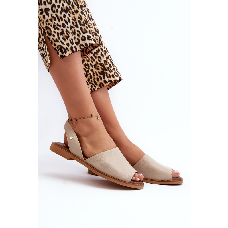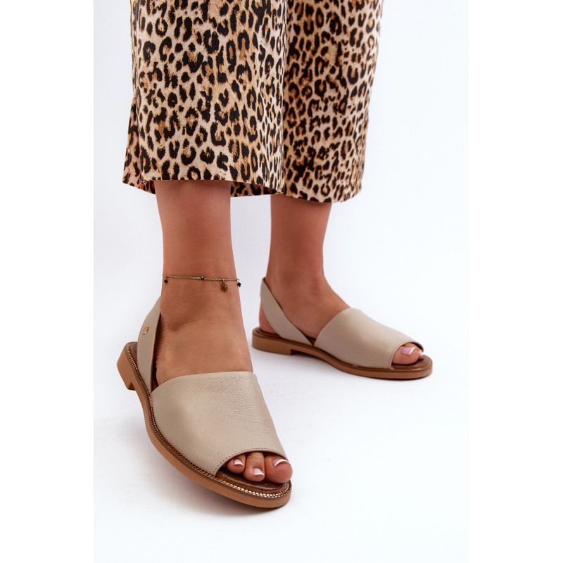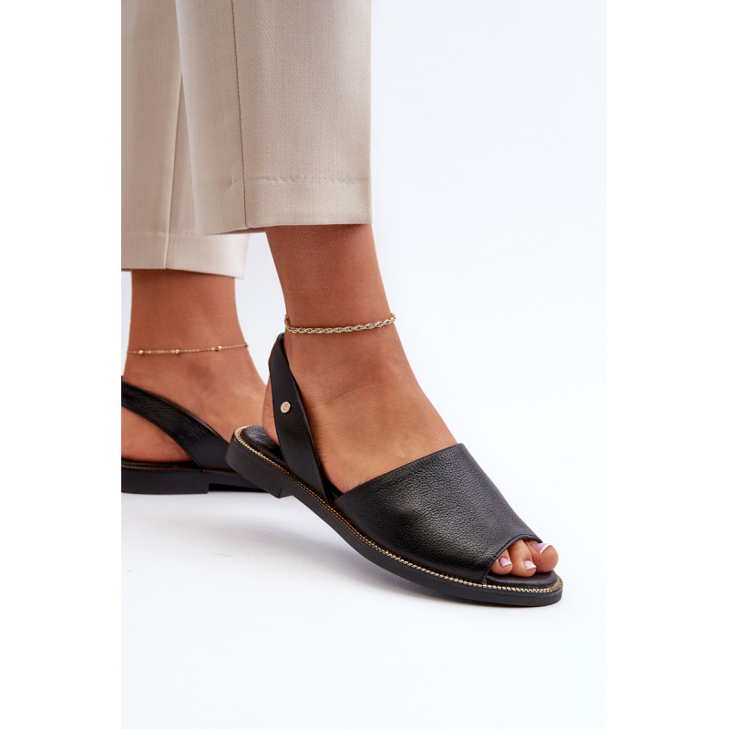 Moteriški sandalai pagaminti iš aukštos kokybės natūralios odos. Pastatas ant plokščio kulno su dekoracijomis ant pado. Sandalai turi atvirą kulną ir pirštus. Minkštas odinis vidpadis užtikrina patogų naudojimą. Sandalai yra slystantys, o užpakalinė koto dalis subtiliai sustiprinta. Rinkdamiesi dydį, vadovaukitės dydžių lentele.