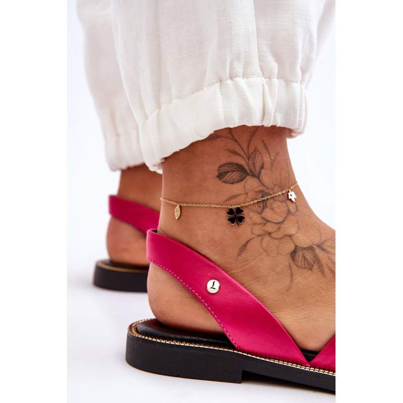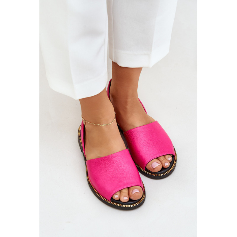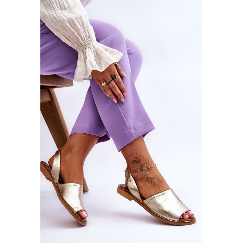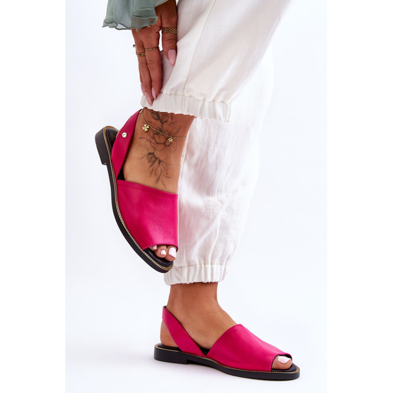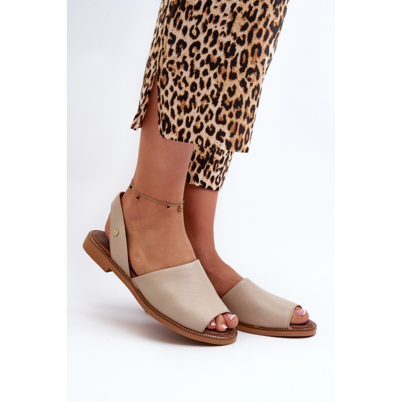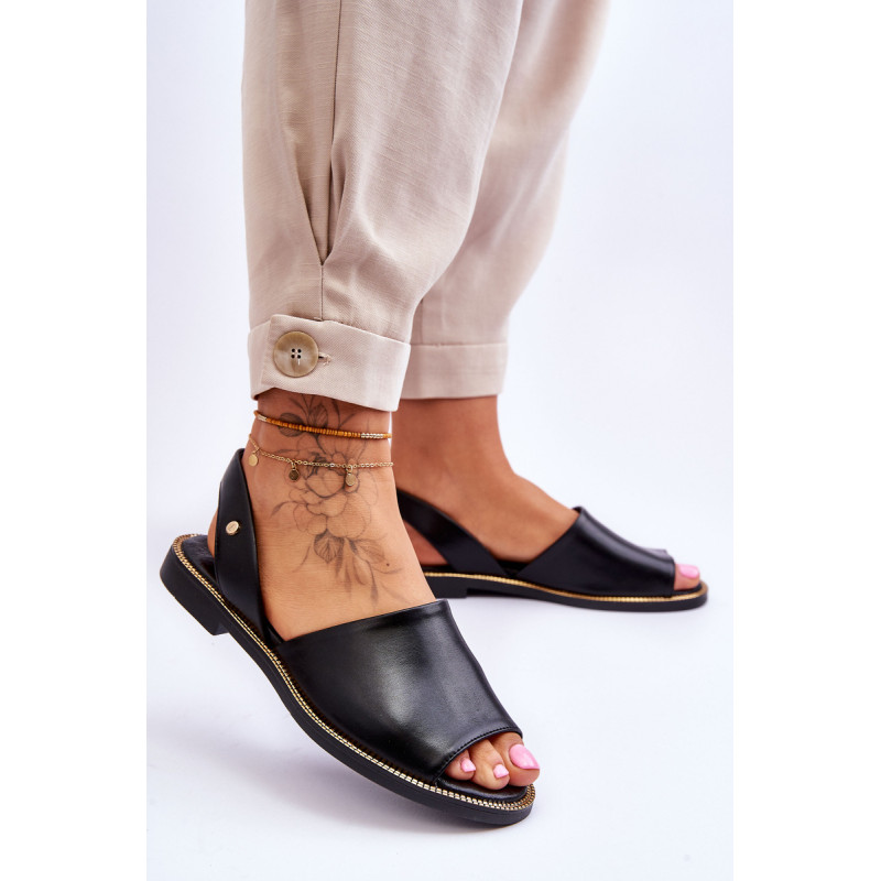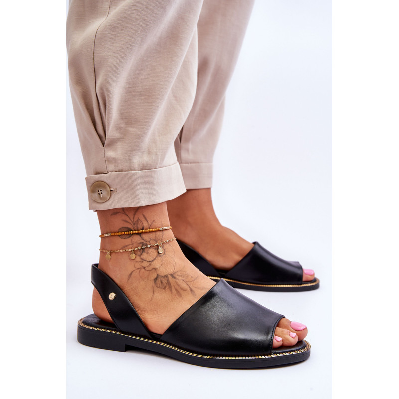 Moteriški sandalai pagaminti iš aukštos kokybės natūralios odos. Pastatas ant plokščio kulno su dekoracijomis ant pado. Sandalai turi atvirą kulną ir pirštus. Minkštas odinis vidpadis užtikrina patogų naudojimą. Sandalai yra slystantys, o užpakalinė koto dalis subtiliai sustiprinta. Rinkdamiesi dydį, vadovaukitės dydžių lentele.