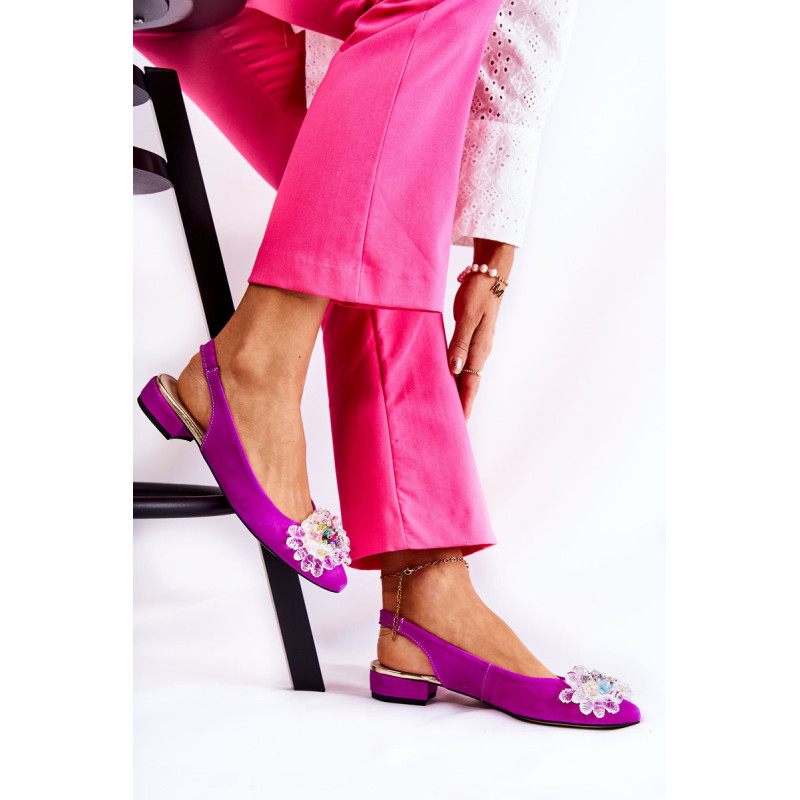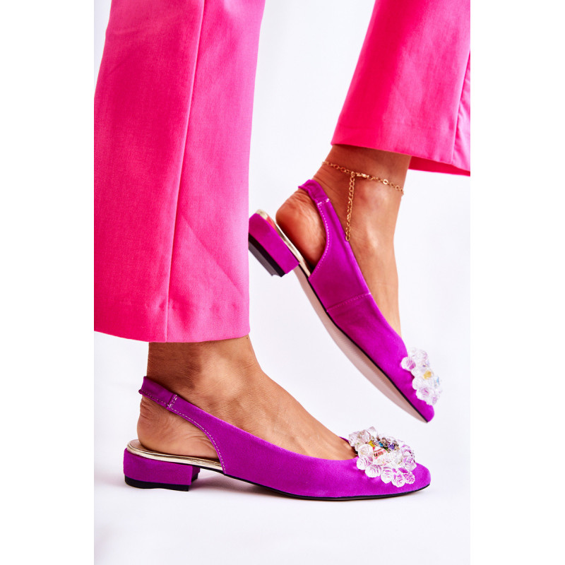 Elegantiškos balerinos atviru kulnu pagamintos iš kokybiškos, natūralios zomšos. Įsiūta tamprė palengvina apsiauti, o batai geriau priglunda prie pėdos. Minkštas, odinis vidpadis užtikrins komfortą naudojimo metu. Nustatykite ant žemų kulnų. Priekinė dalis dekoruota karoliukais su kalnų krištolais, imituojančiais kalnų krištolą. Būtinai peržiūrėkite visą mūsų odinių batų kolekciją! Renkantis dydį, naudokite dydžių lentelę.