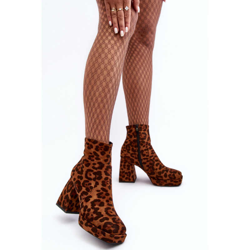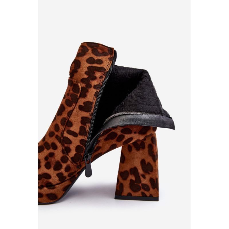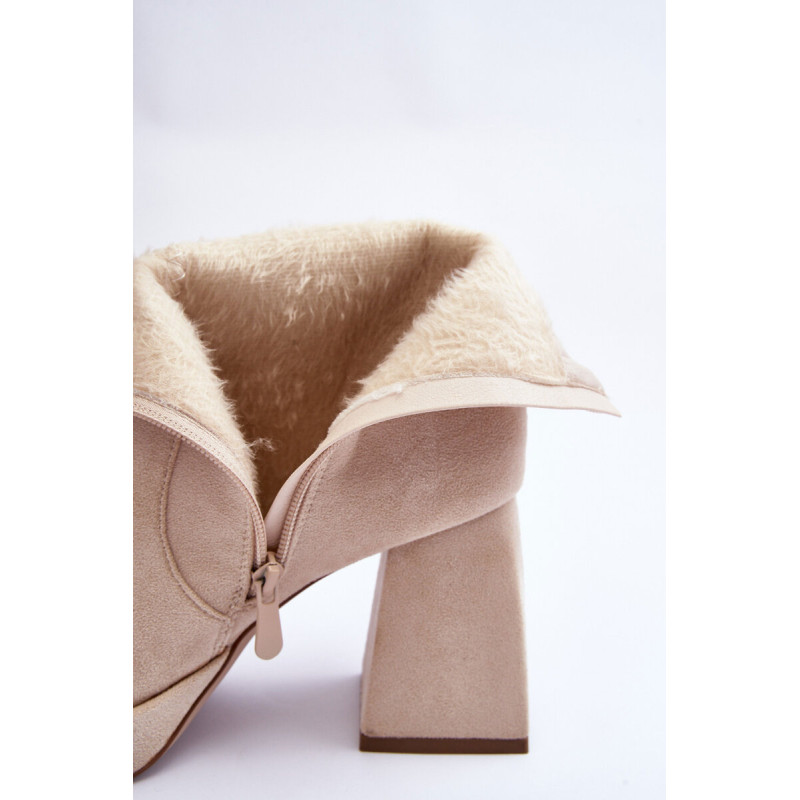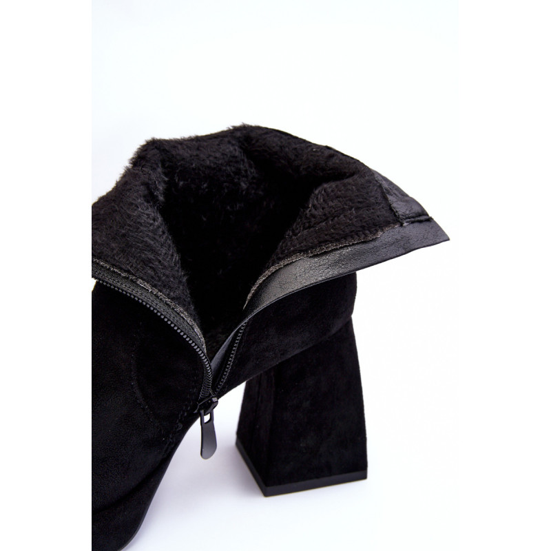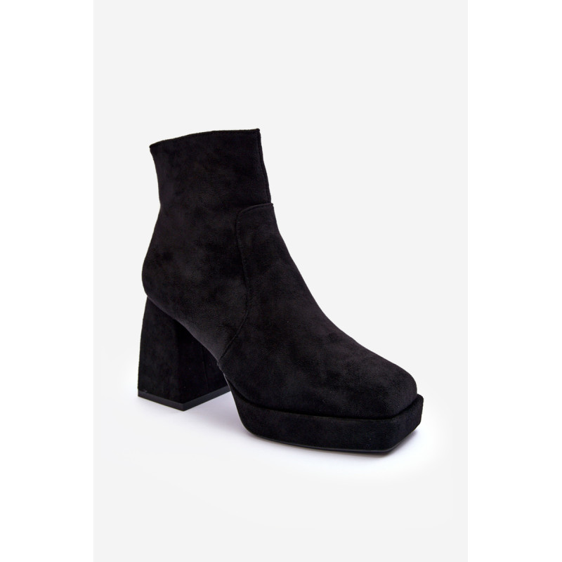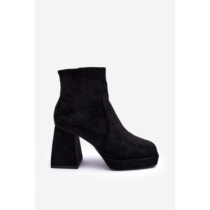 Moteriški batai ant masyvios aukšto bloko ir platformos. Pagaminta iš ekologiškos zomšos. Užsegamas užtrauktuku vidinėje viršutinės dalies pusėje. Vidus apšiltintas batsiuvio antklode. Kvadratiniai kojų pirštai. Kojos pirštas standus. Renkantis dydį, vadovaukitės dydžių lentele.