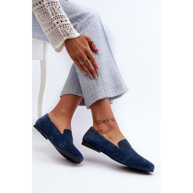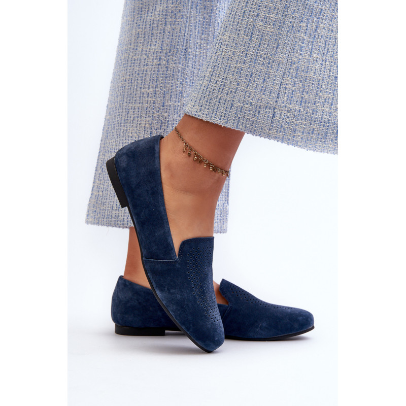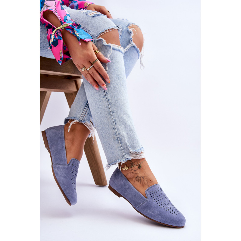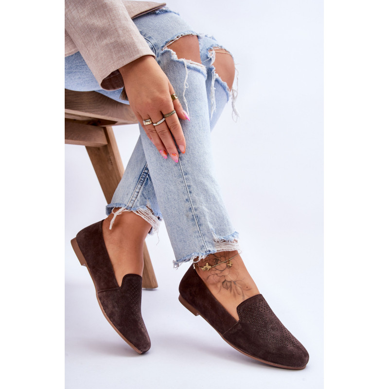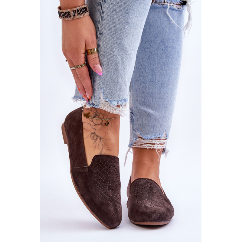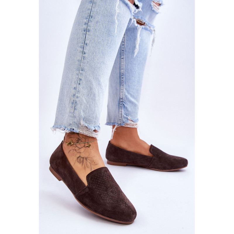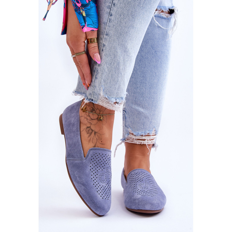 Nuostabūs moteriški batukai iš natūralios zomšos. Jie turi dekoratyvų, ažūrinį raštą priekyje. Šis modelis buvo pastatytas ant plokščio kulno ir neslidaus pado. Loaferiai turi Comfort vidpadį, pagamintą iš natūralios odos. Šių batų kulnas yra šiek tiek standesnis. Jūs tikrai turėtumėte juos turėti! Rinkdamiesi dydį, vadovaukitės dydžių lentele.