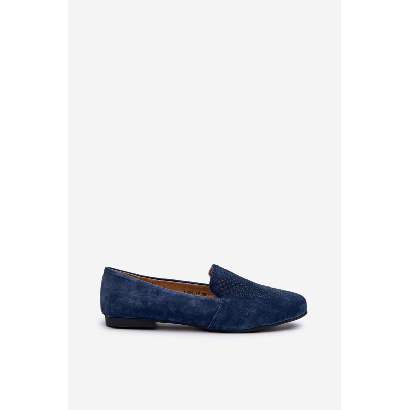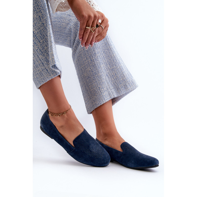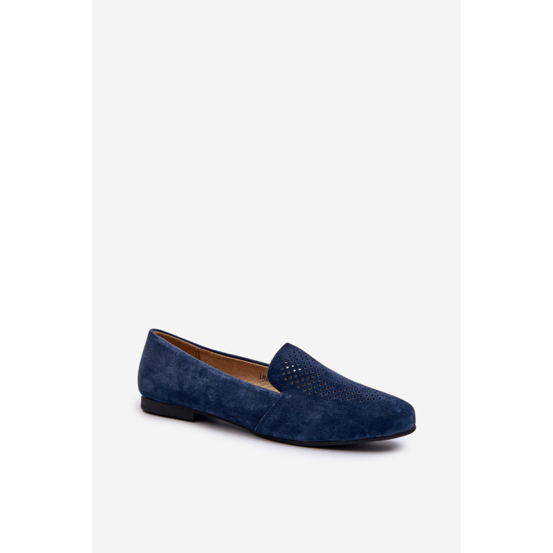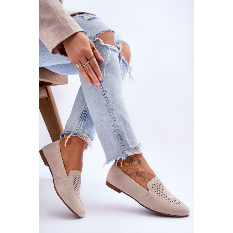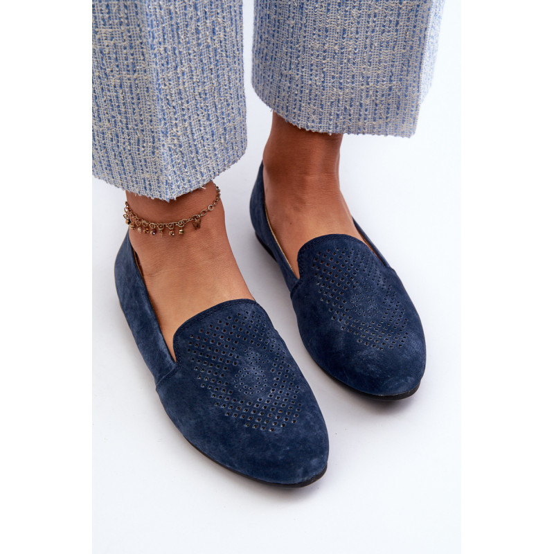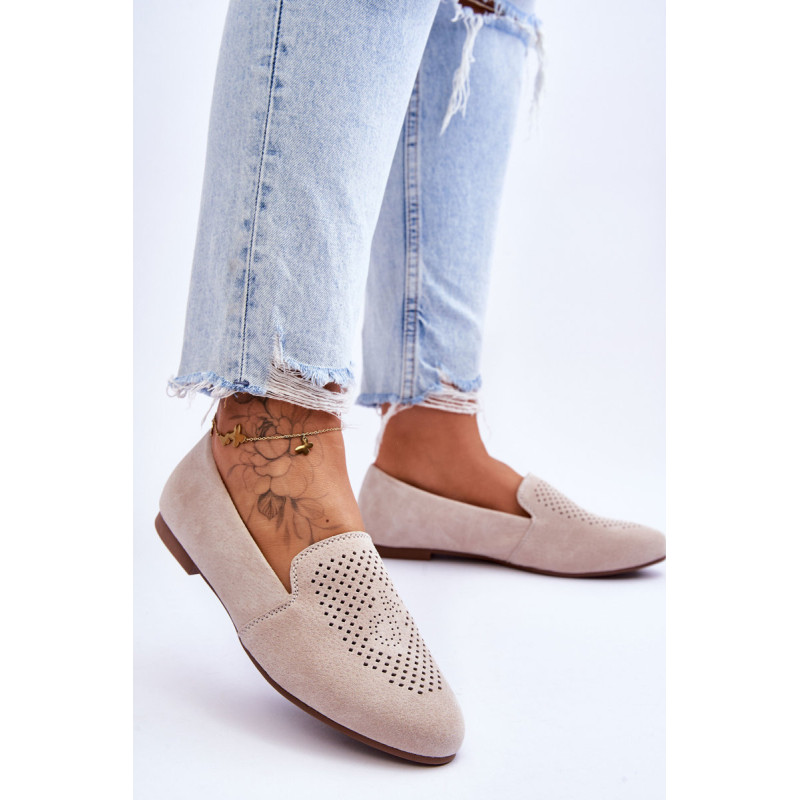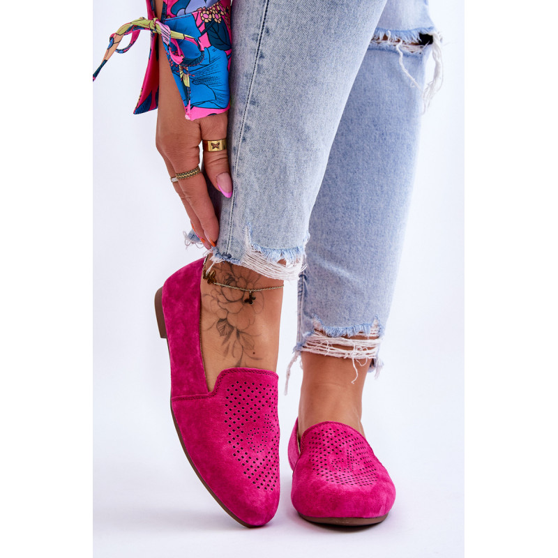 Nuostabūs moteriški batukai iš natūralios zomšos. Jie turi dekoratyvų, ažūrinį raštą priekyje. Šis modelis buvo pastatytas ant plokščio kulno ir neslidaus pado. Loaferiai turi Comfort vidpadį, pagamintą iš natūralios odos. Šių batų kulnas yra šiek tiek standesnis. Jūs tikrai turėtumėte juos turėti! Rinkdamiesi dydį, vadovaukitės dydžių lentele.