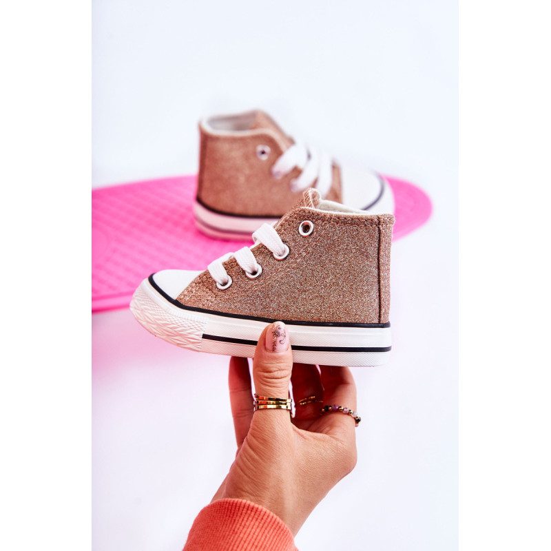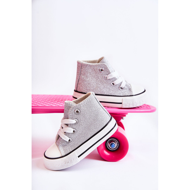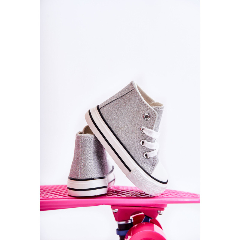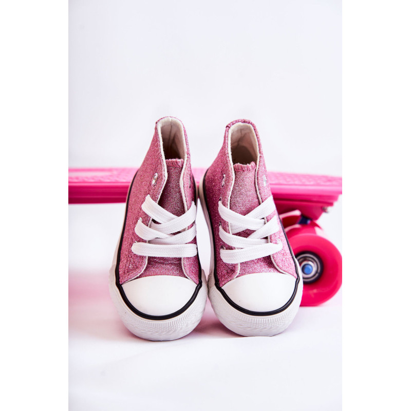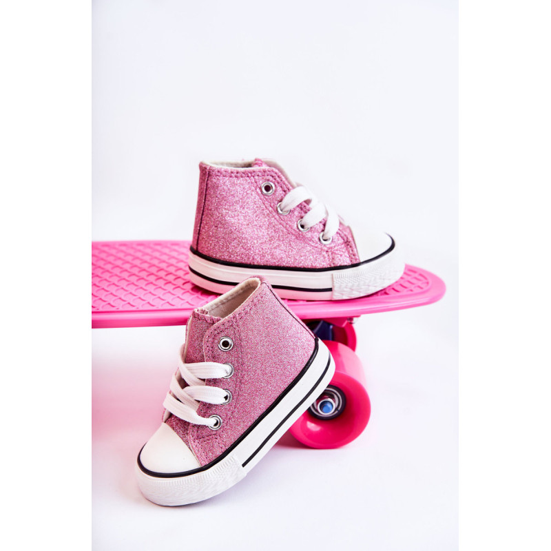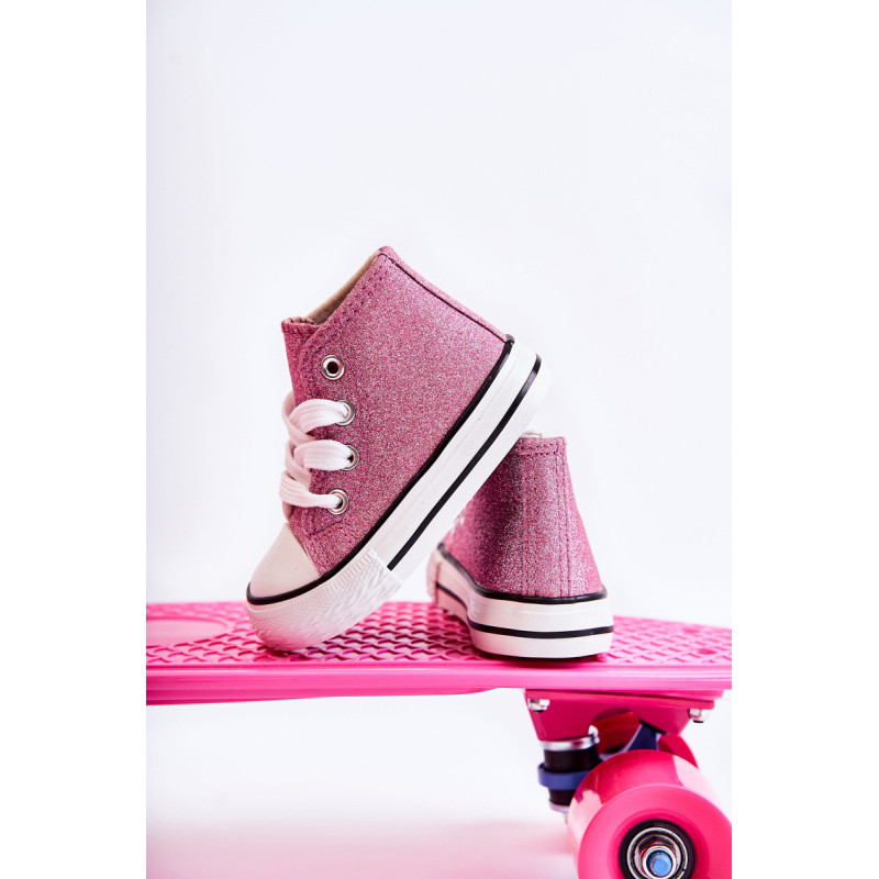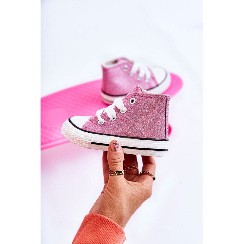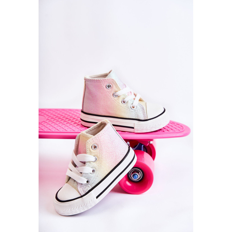 Aukšti vaikiški sportbačiai iš tekstilės. Dekoruotas blizgučiais. Klasikinis įrišimas. Pirštas sustiprintas guma. Minkštas ir tekstilinis vidpadis. Guminis padas ir neslystantis. Lengvi ir patogūs sportbačiai. Puikiai tinka pavasario ir vasaros sezonui. Renkantis dydį, naudokite dydžių lentelę.