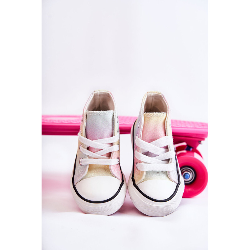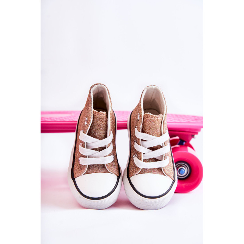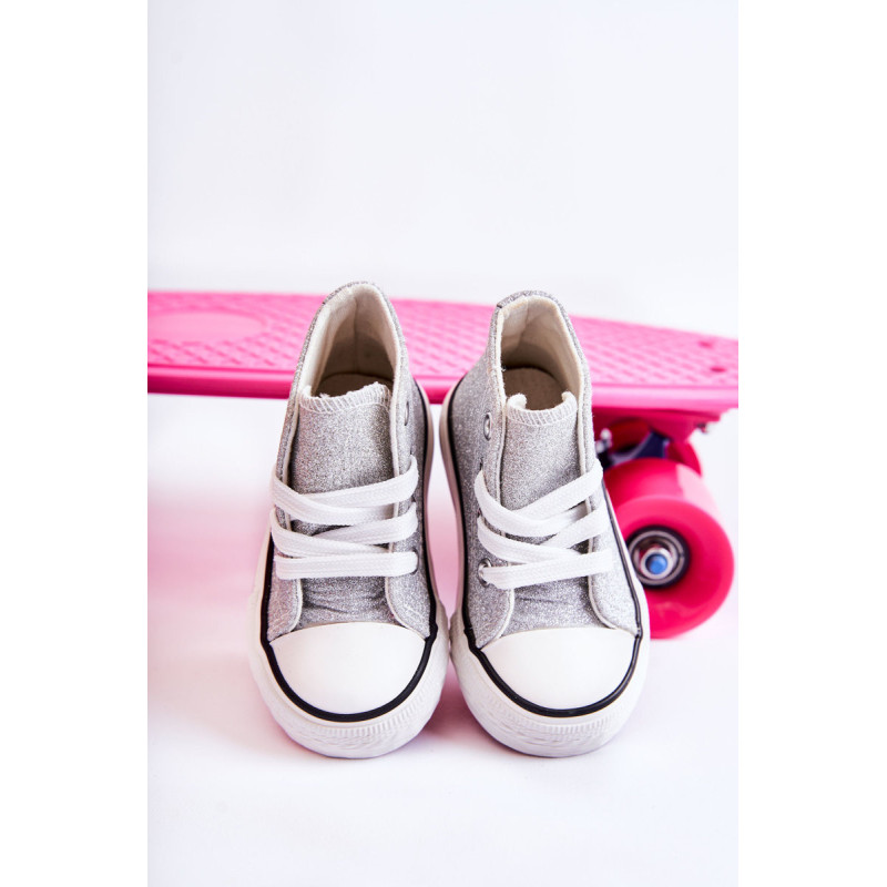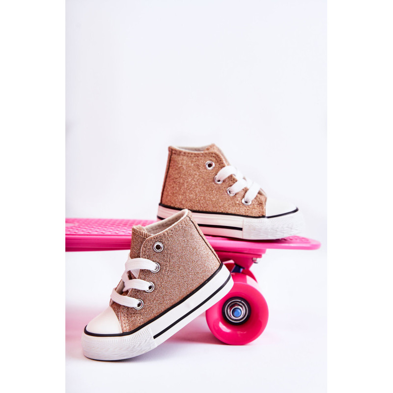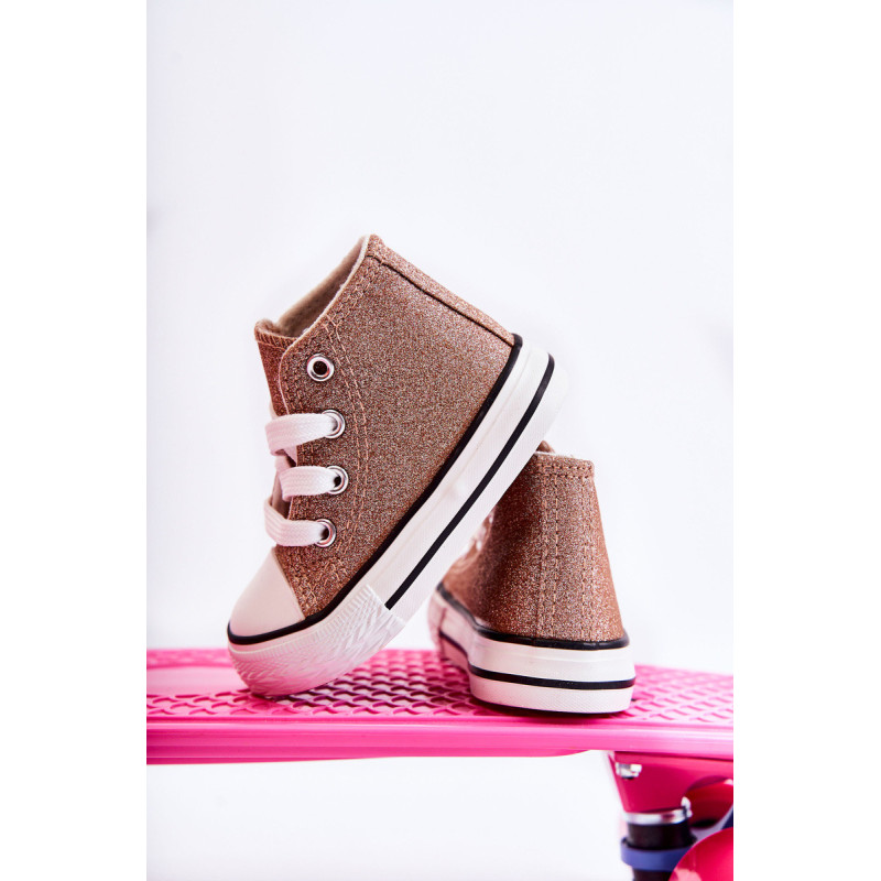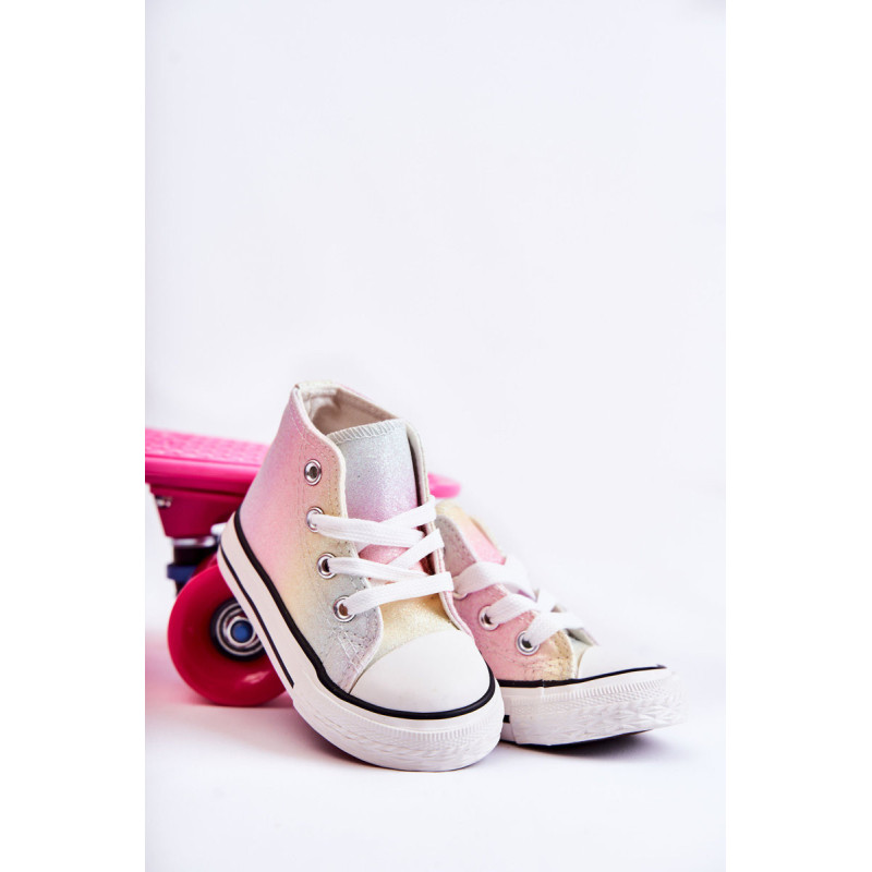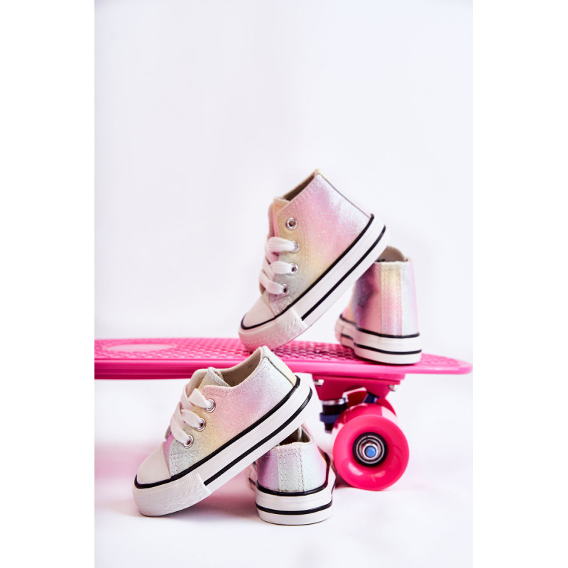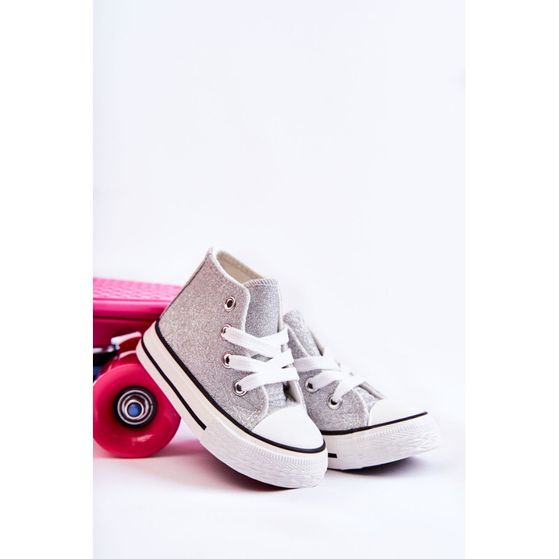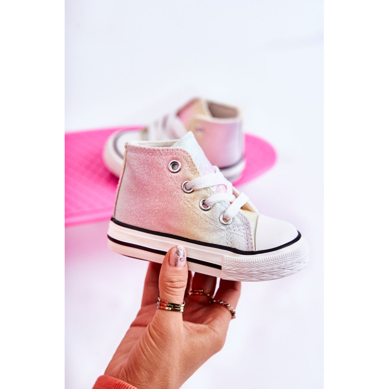 Aukšti vaikiški sportbačiai iš tekstilės. Dekoruotas blizgučiais. Klasikinis įrišimas. Pirštas sustiprintas guma. Minkštas ir tekstilinis vidpadis. Guminis padas ir neslystantis. Lengvi ir patogūs sportbačiai. Puikiai tinka pavasario ir vasaros sezonui. Renkantis dydį, naudokite dydžių lentelę.