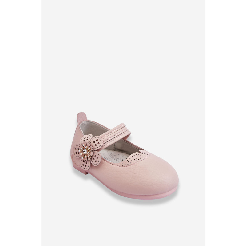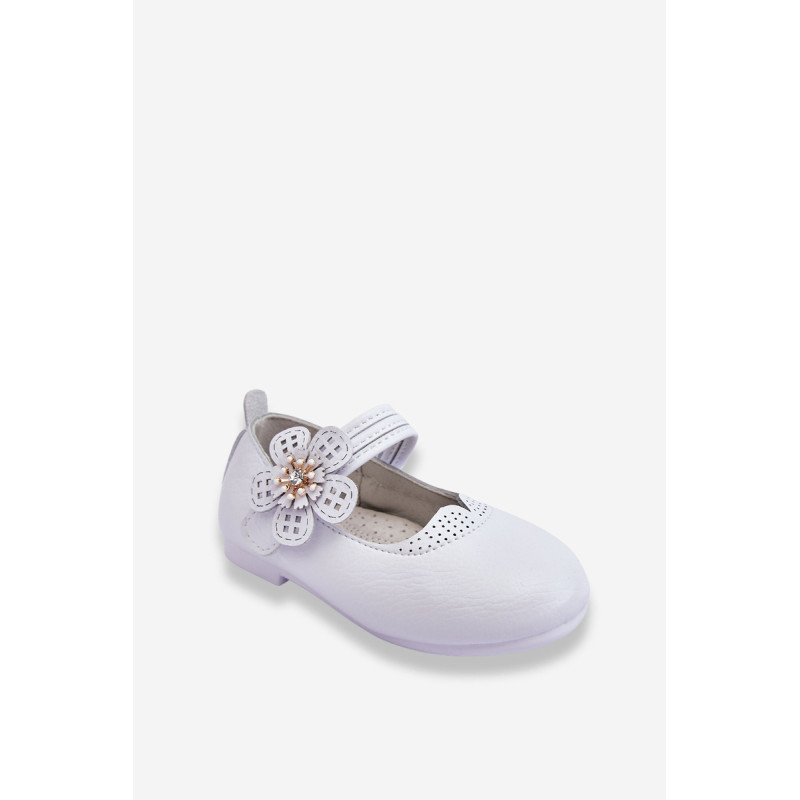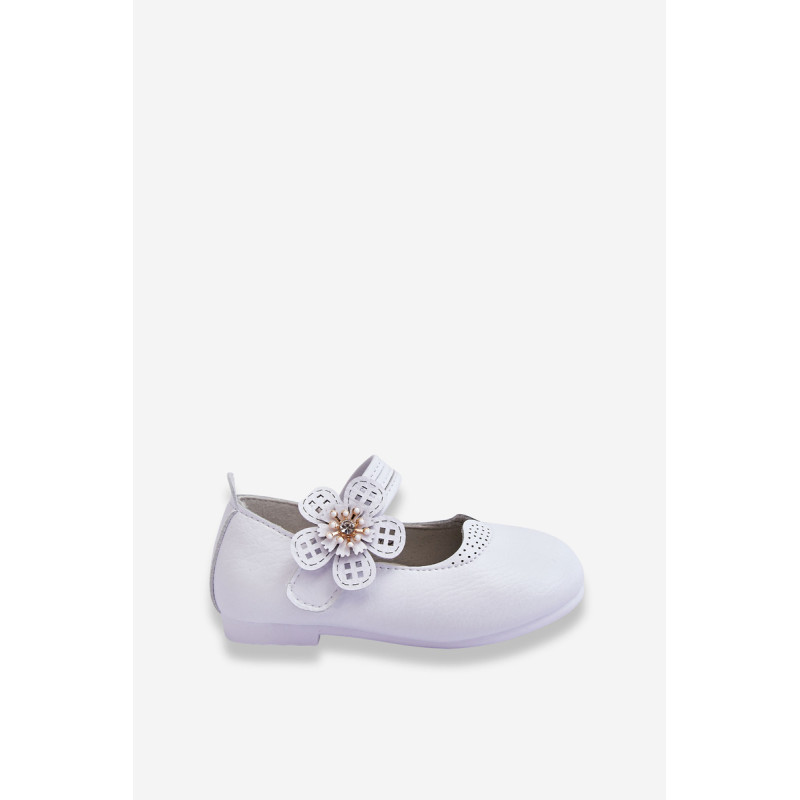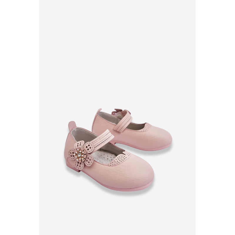 Klasikinės, vaikiškos balerinos pagamintos iš eko odos. Šis modelis turi Velcro užsegimą, papildomai dekoruotą gėle su ažūriniais žiedlapiais. Balerinos yra itin patogios, dėka profiliuoto vidpadžio iš natūralios odos. Batai buvo uždėti ant plokščio kulno. Rinkdamiesi dydį, vadovaukitės dydžių lentele.
