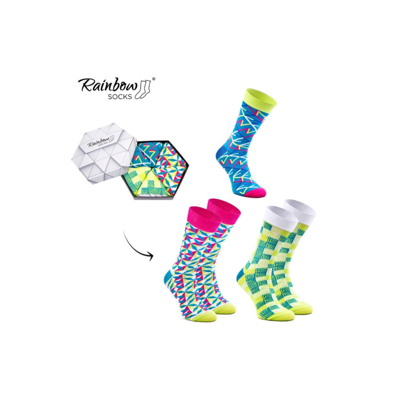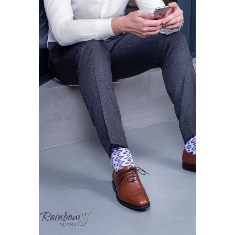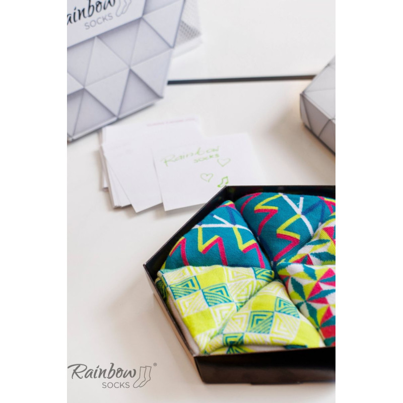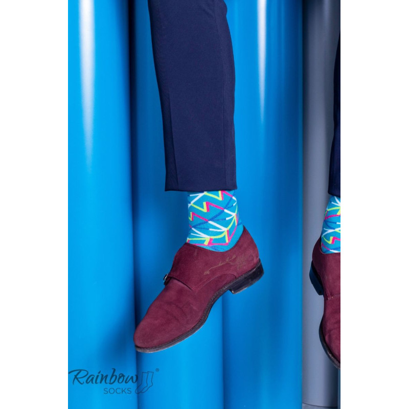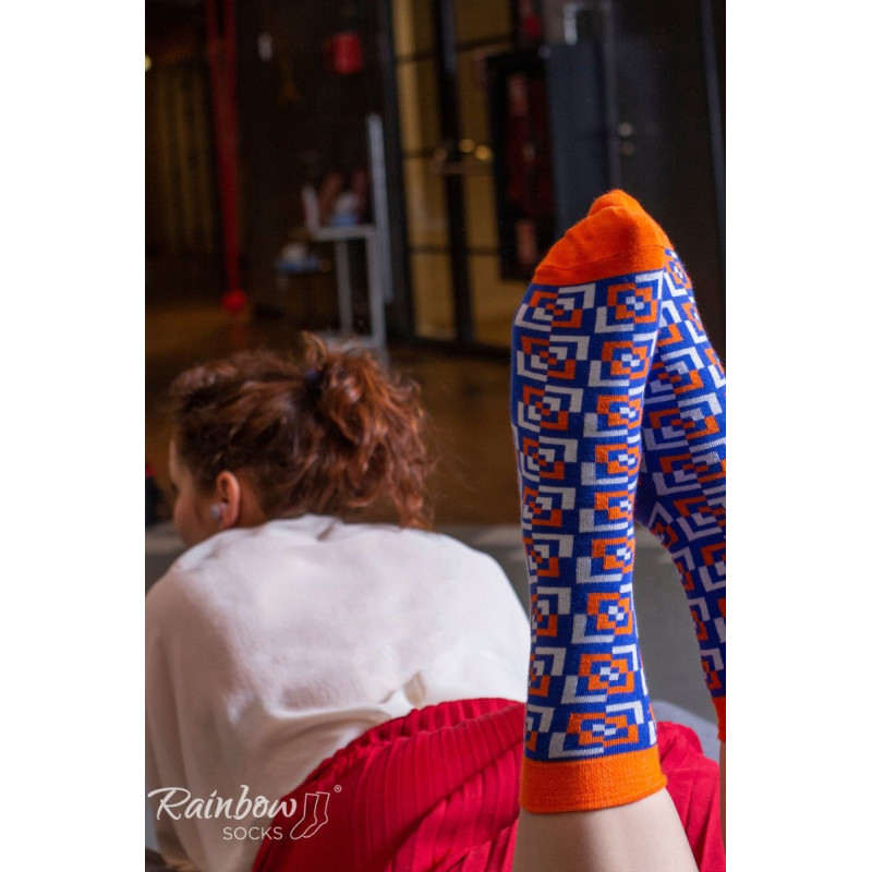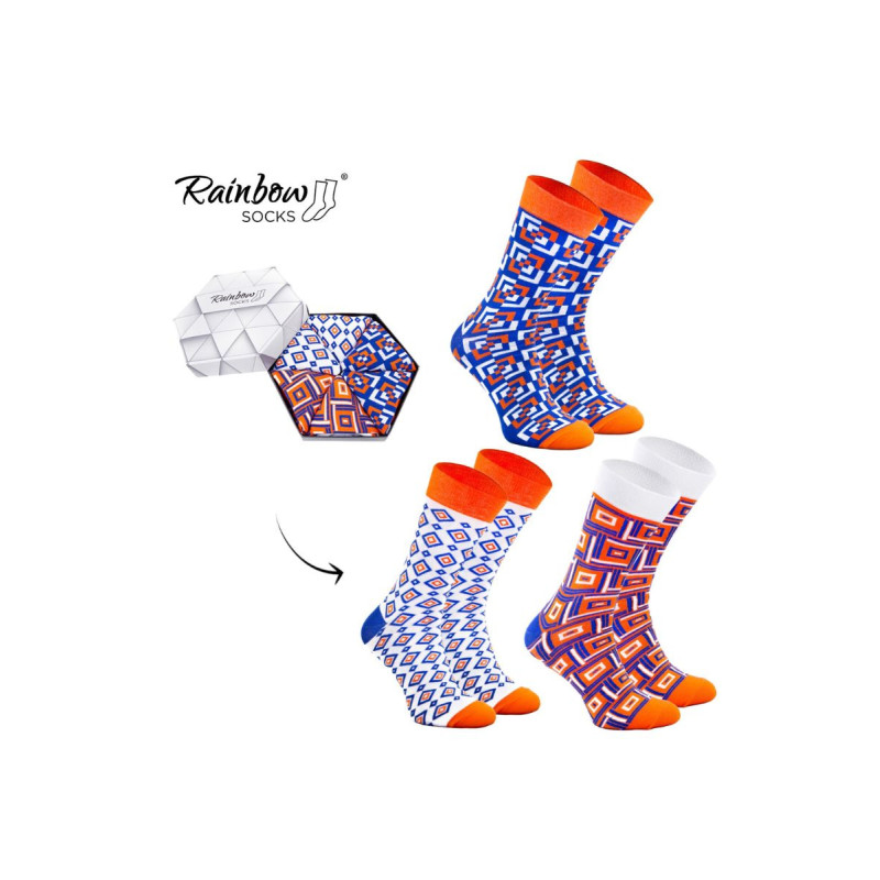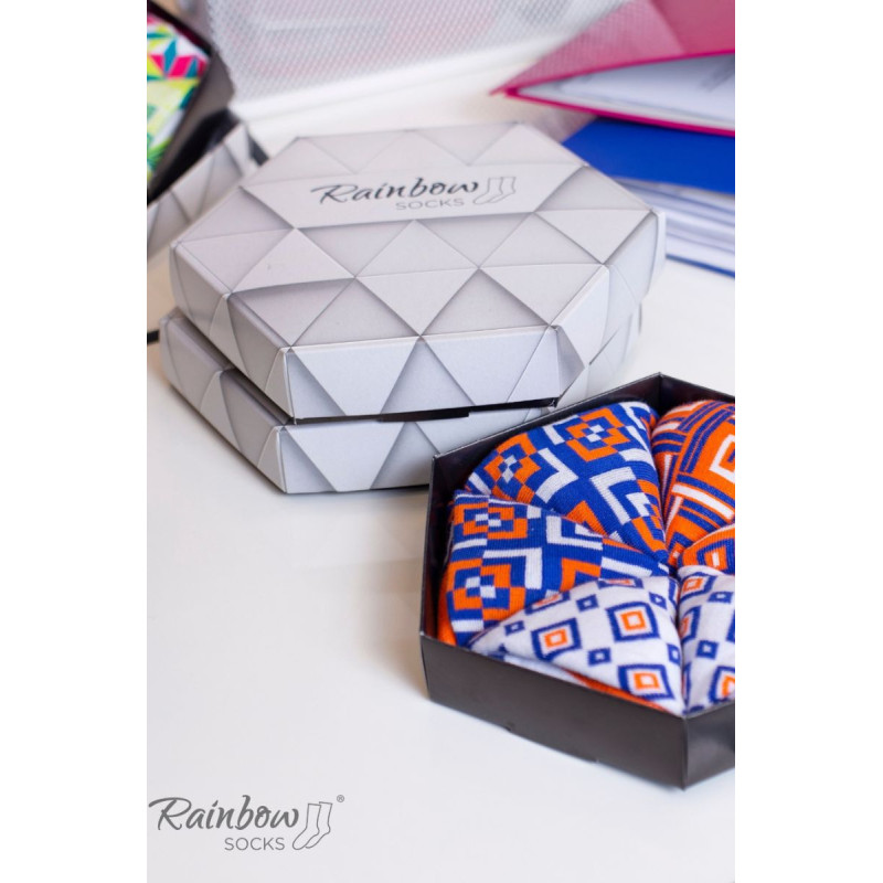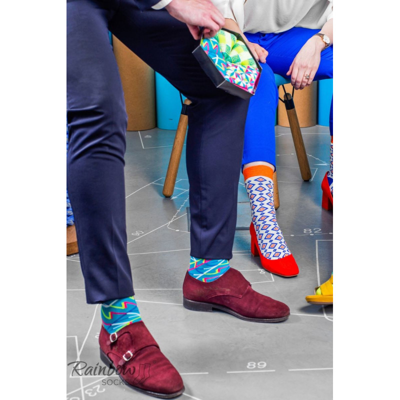 Dryžuotos kojinės ir geometriniai raštai. Ar tai neatrodo kaip tobulas spalvingas jūsų verslo kostiumo priedas? Galbūt pažįstate matematiką, kuris yra pamišęs dėl geometrijos. Arba proporcijas mėgstantis architektas? Kiekvienam iš jų patiks šios geometrinių raštų kojinės!