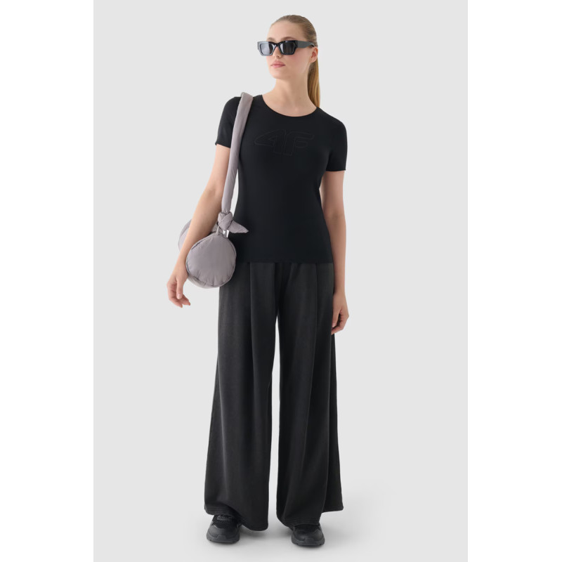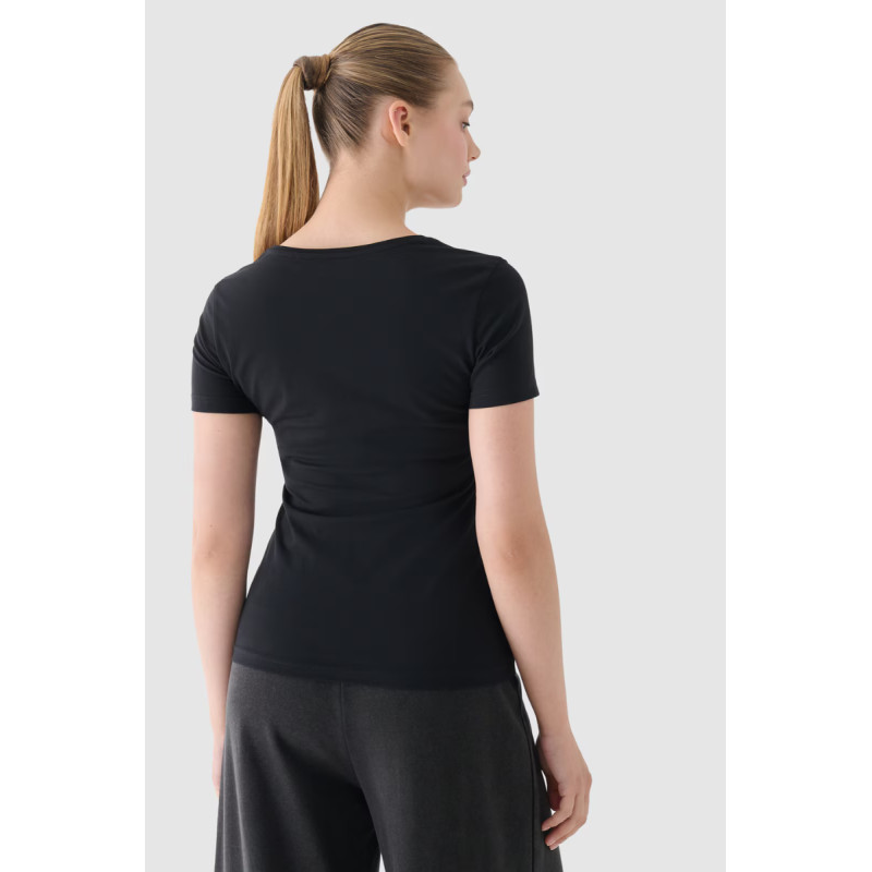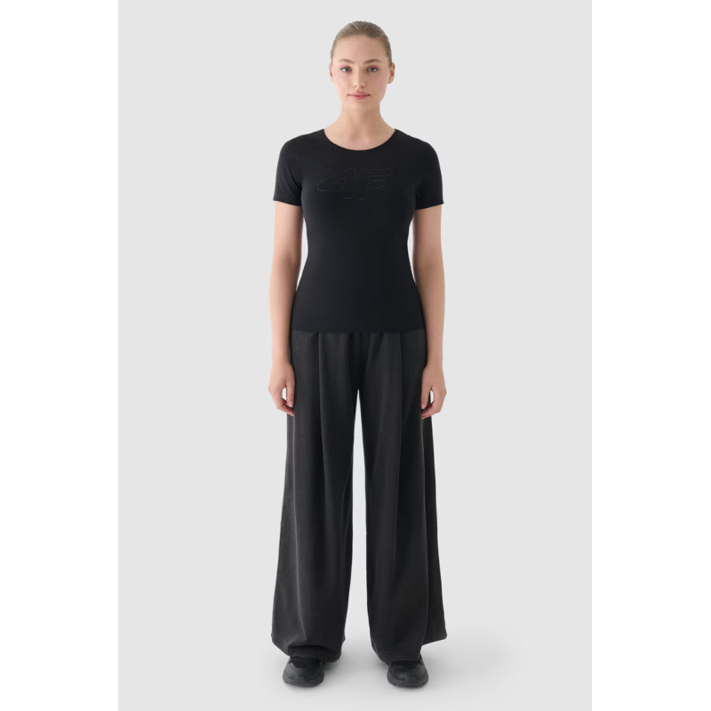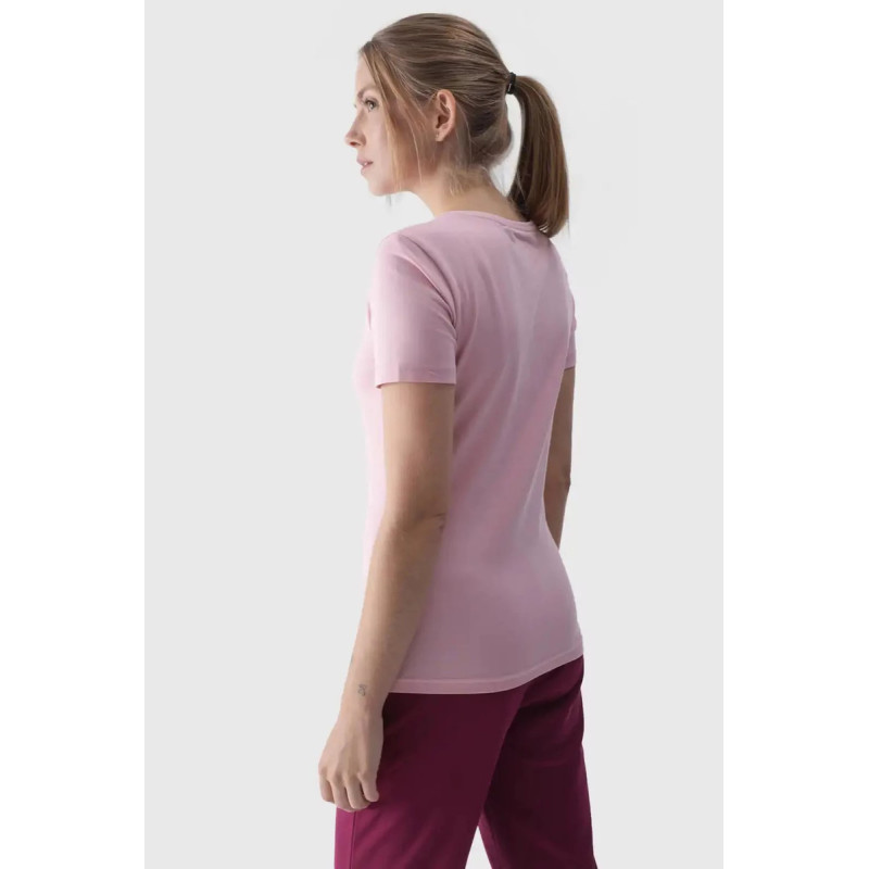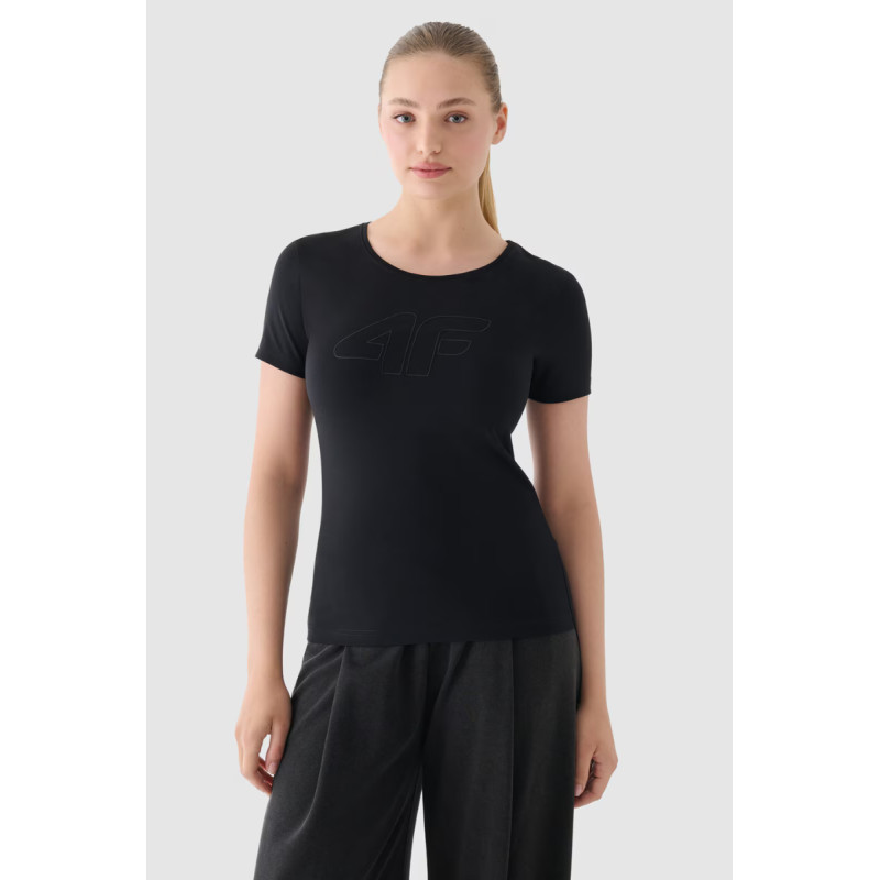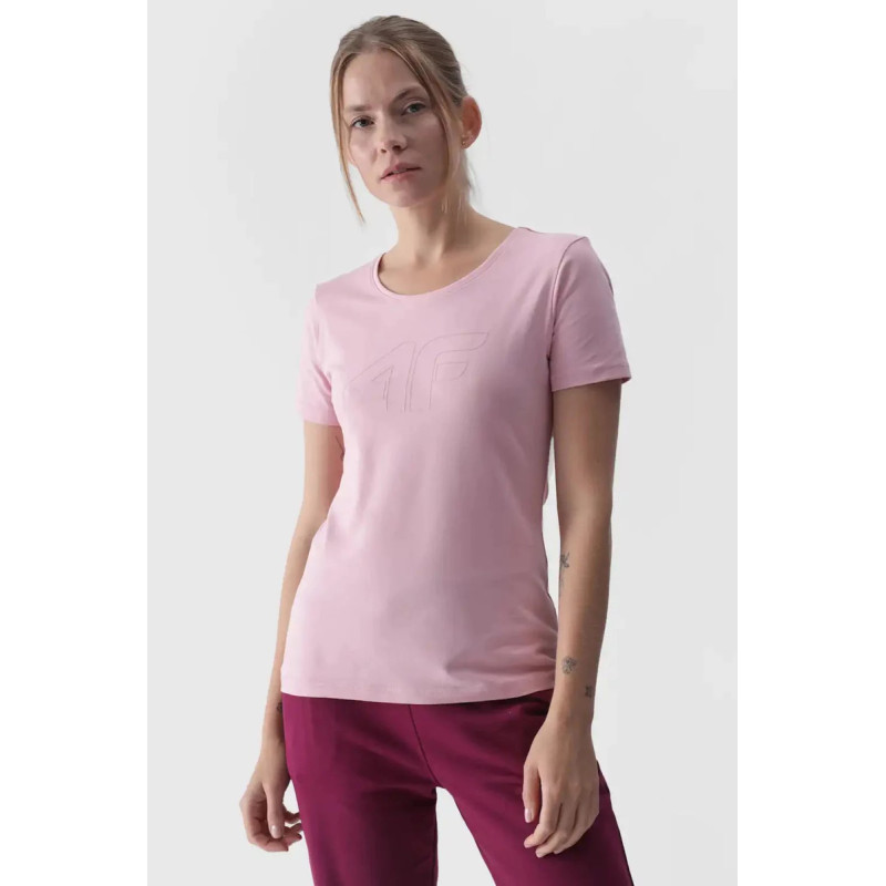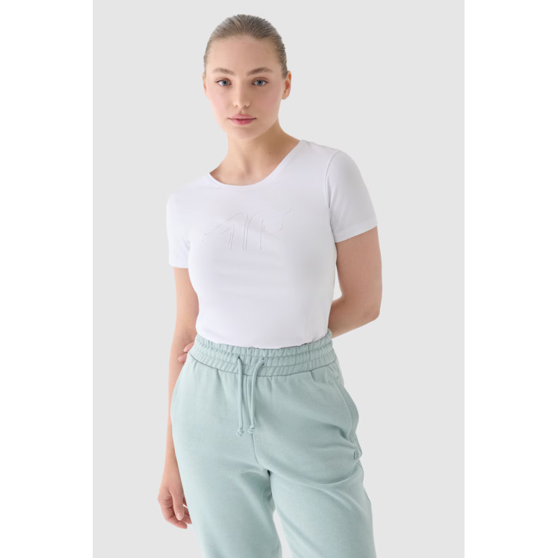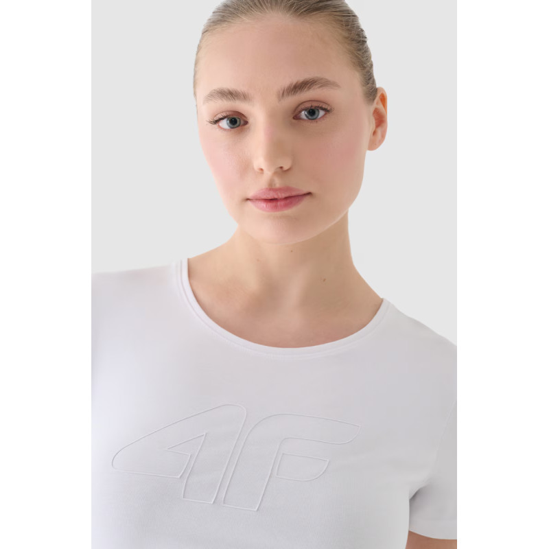Moteriški marškinėliai puikiai tinka tiek kasdieniam, tiek sportiniam stiliui. Jis turi ploną kirpimą, kuris apkabina kūną, o standartinis ilgis siekia klubų liniją. Vieno trikotažo mezginys su vienpusiu lygiu paviršiumi daro marškinius elastingus ir patogius dėvėti. Moteriški marškinėliai su spauda yra minkšti liesti ir gerai dengiasi dėl 180 gsm svorio. Jis yra nepermatomas ir užtikrina ilgaamžiškumą bei patogumą nešiojant ištisus metus. Moteriški 4F marškinėliai pagaminti iš 95% medvilnės, todėl yra minkšti, patvarūs ir malonūs liesti. Pridėjus elastano (5%), jis yra tamprus ir patogiai priglunda prie silueto. Apvali iškirptė užbaigta lengvais raišteliais. Priekyje matomas užrašas „4F“ Pagrindinė medžiaga: medvilnė 95%, elastanas 5%