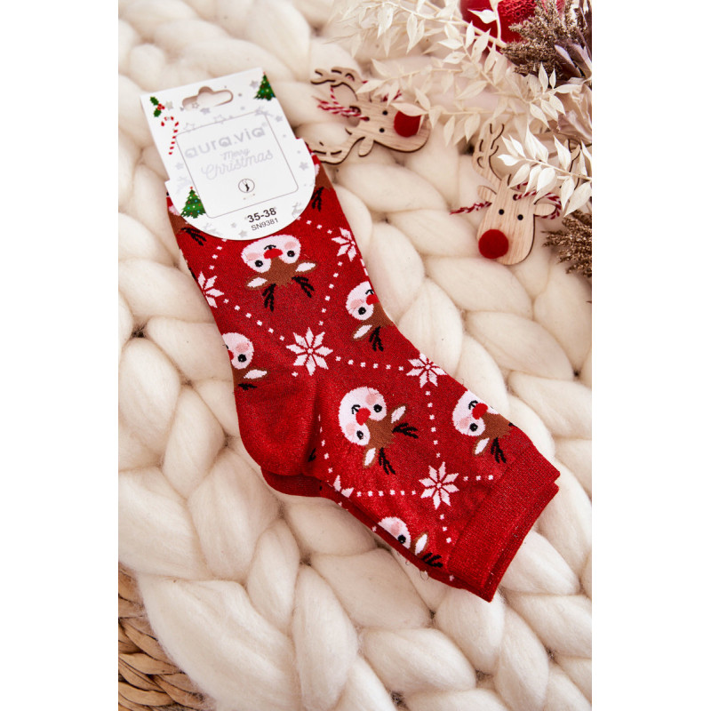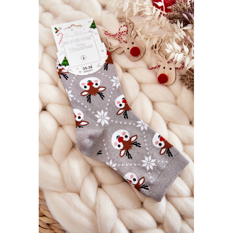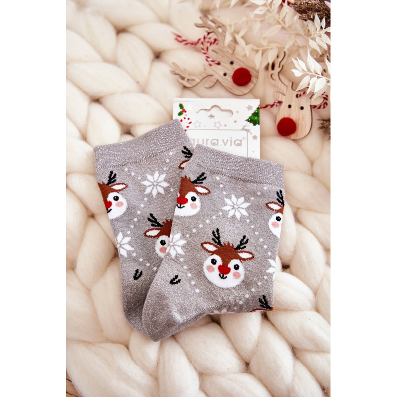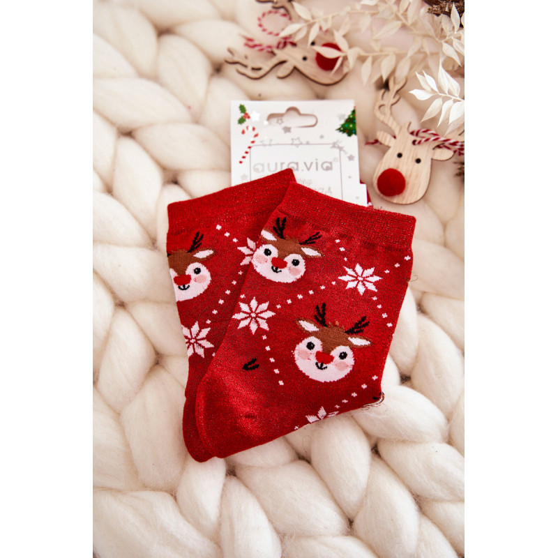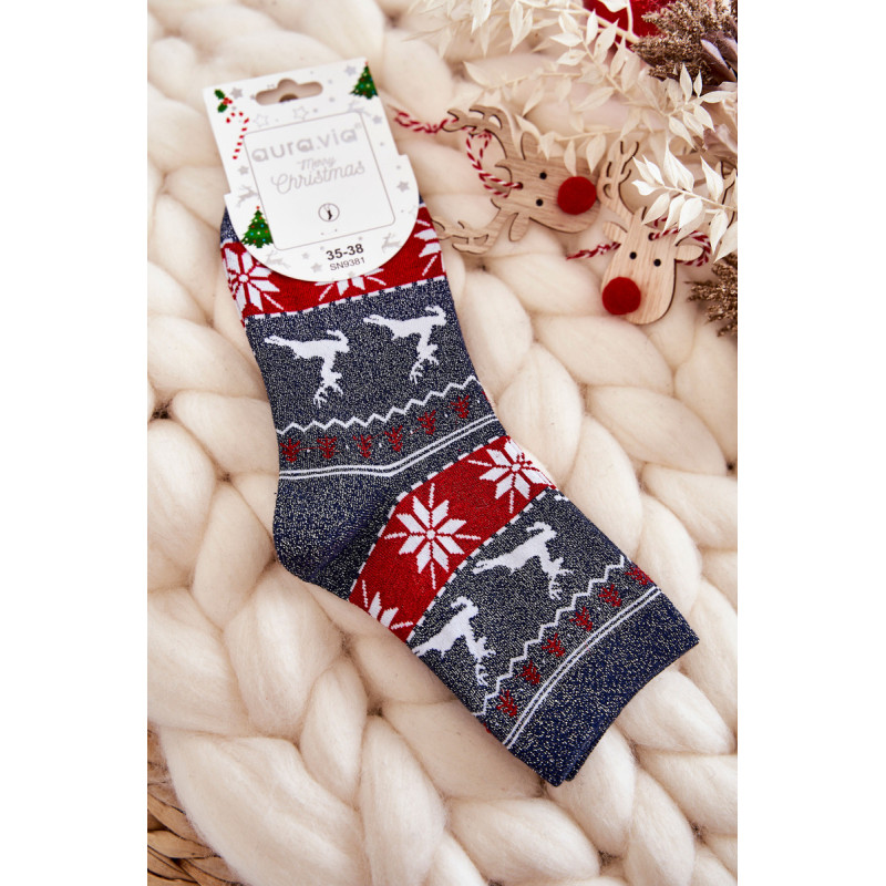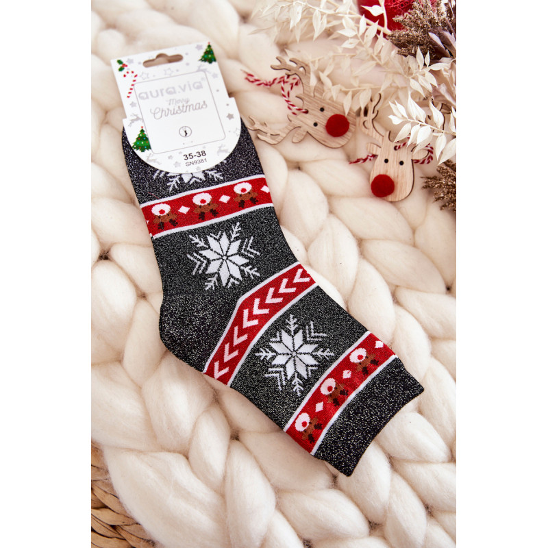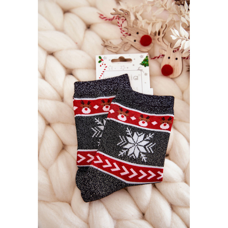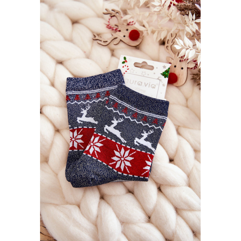 Nuostabios moteriškos kojinės pagamintos iš patvaraus medvilninio audinio. Dekoruota kalėdiniais raštais ir lureksu, t.y. metalizuotu siūlu. Kojinės turi subtilų briauną, leidžiančią tinkamai prisitaikyti prie kojų pločio. Šis modelis taip pat bus puiki dovana Kalėdų proga!