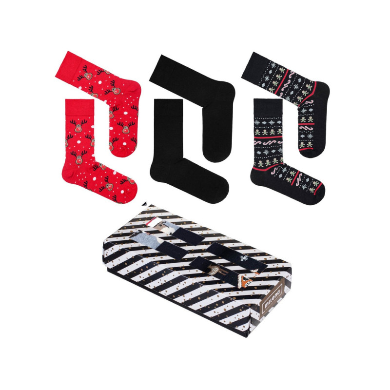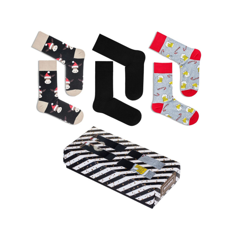 Šventinės vyriškos kojinės elegantiškoje dėžutėje yra puikus dovanos pasirinkimas. Rinkinį sudaro trys poros įvairių žieminių raštų, kurie pridės žavesio prie kiekvieno įvaizdžio. Minkštos, jaukios ir labai patogios — puikiai tinka šaltomis dienomis ir kaip mielas sezoninis dovanos pasirinkimas.